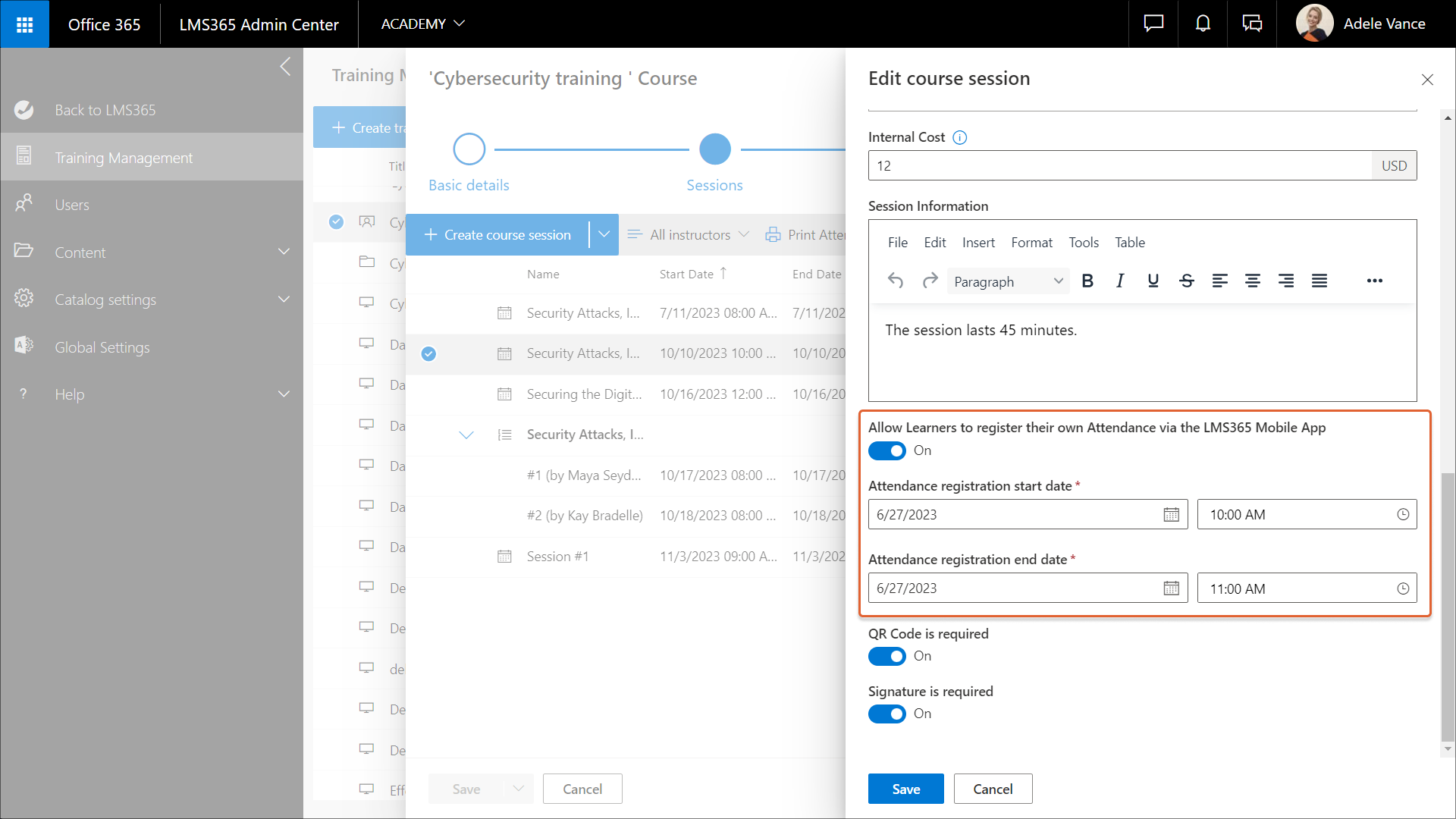 Der Aktionslink Anwesenheits-QR-Code herunterladen ist nur dann im Bereich Aktionen verfügbar, wenn ein Katalog- oder Kursadministrator beim Erstellen oder Bearbeiten einer Sitzung unter Kursteilnehmern das Eintragen ihrer Anwesenheit über die LMS365 Mobile App erlauben die Option QR-Code ist erforderlich festgelegt hat.