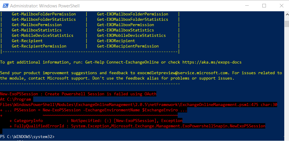 Wenn die Warnmeldung Erstellen der PowerShell-Sitzung ist mit OAuth fehlgeschlagen angezeigt wird, prüfen Sie die Voraussetzungen für das EXO V2-Modul.