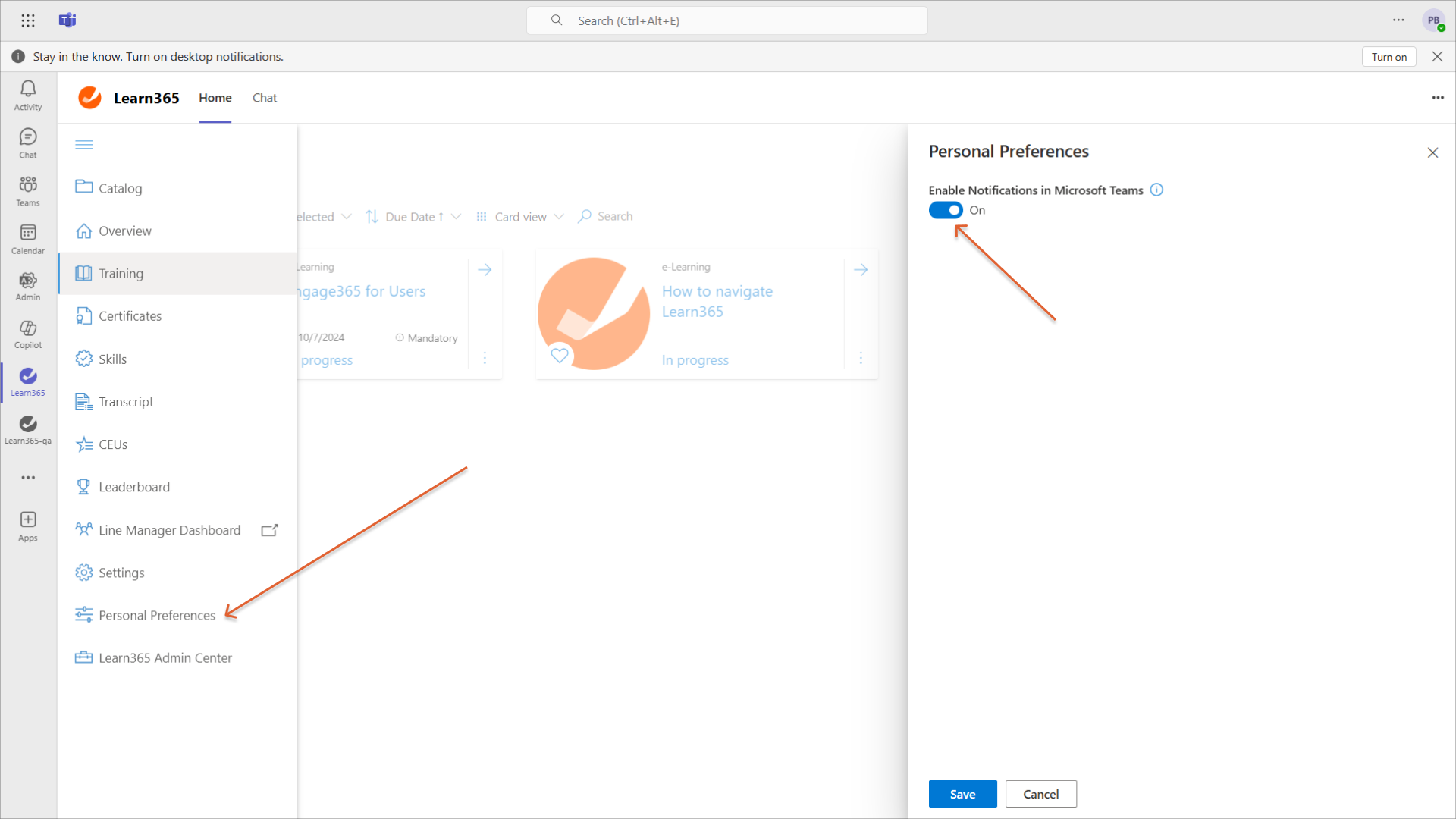 Benutzer können die Zustellung von Microsoft Teams-Benachrichtigungen sowohl über die Learn365-Webanwendung als auch über die Learn365-App in Microsoft Teams aktivieren.