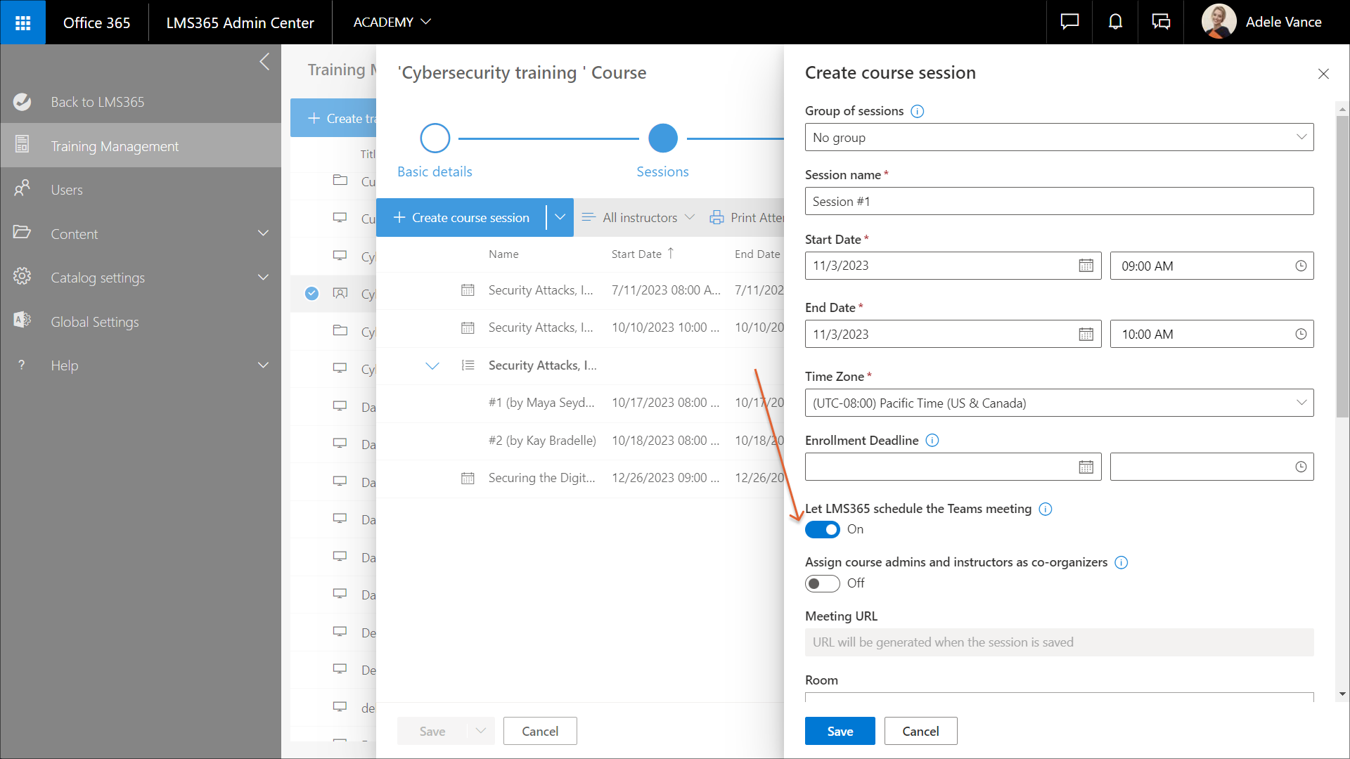 4. Im Sitzungskonfigurationsbereich legen Sie die Option Teams-Besprechung durch Learn365 planen lassen auf Ein fest.
