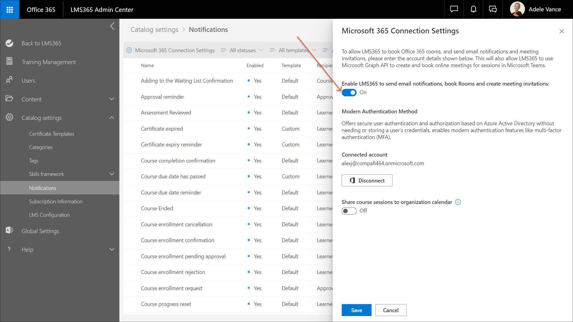 Damit Microsoft Teams-Besprechungen aus Kurssitzungen erstellt werden können, muss die Option Berechtigen Sie Learn365, E-Mail-Benachrichtigungen zu senden, Räume zu buchen und Meeting-Einladungen zu erstellen für den Kurskatalog in den Katalogeinstellungen auf Ein festgelegt werden.