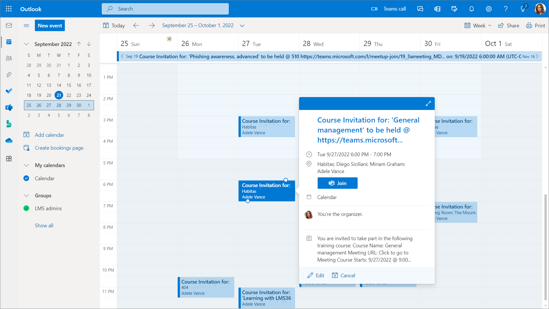 - Learn365 erstellt Onlinebesprechungen für Sitzungen in Microsoft Teams und versendet im Namen des Organisators Einladungen an die Benutzer.