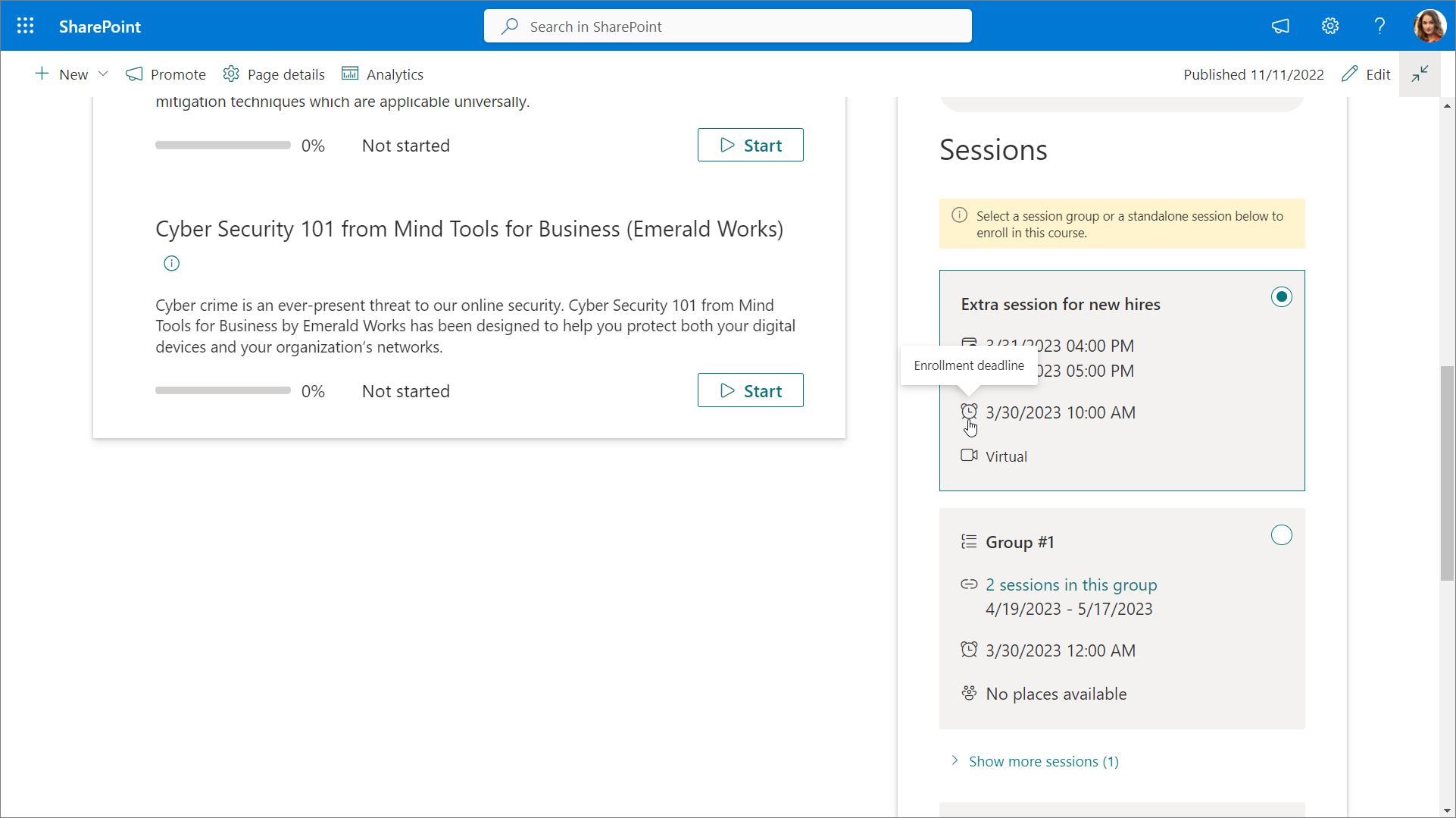 - Für Kurse des Typs Mehrfachregistrierung wird die Registrierungsfrist unter den Sitzungsinformationen für jede eigenständige Sitzung jede Sitzungsgruppe mit einer solchen Frist angezeigt.