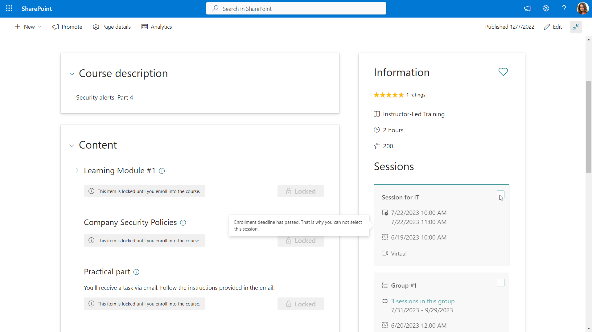 Wenn ein Benutzer für eine Einzelsitzung oder Sitzungsgruppe registriert ist, deren Registrierungsfrist bereits abgelaufen ist, so kann er seine Sitzungsregistrierung ändern, indem er in der Liste der verfügbaren Sitzungen und Gruppen für den Kurs eine andere Sitzung oder Sitzungsgruppe auswählt. In diesem Fall kann der Benutzer vor der Auswahl der Option Sitzungsregistrierungen ändern immer noch zu dieser Sitzung oder Sitzungsgruppe mit der bereits abgelaufenen Registrierungsfrist zurückkehren und seinen Platz behalten. Sobald die Registrierung für die Sitzung oder Sitzungsgruppe geändert wurde, kann diese Sitzung oder Sitzungsgruppe, deren Registrierungsfrist bereits abgelaufen ist, nicht mehr ausgewählt werden.