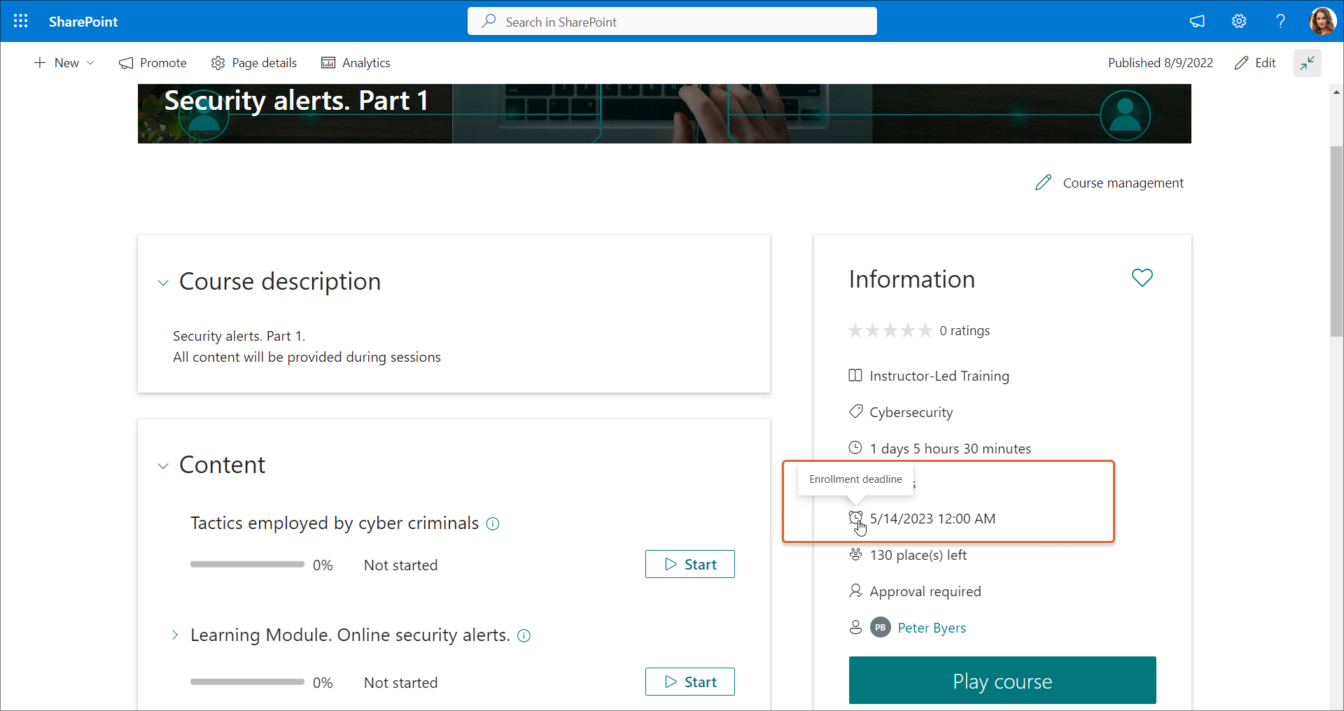 Wenn Sie eine Registrierungsfrist festlegen, wird diese auf der Startseite des Kurses angezeigt. Die Platzierung der Registrierungsfrist hängt vom Kursregistrierungstyp ab:
