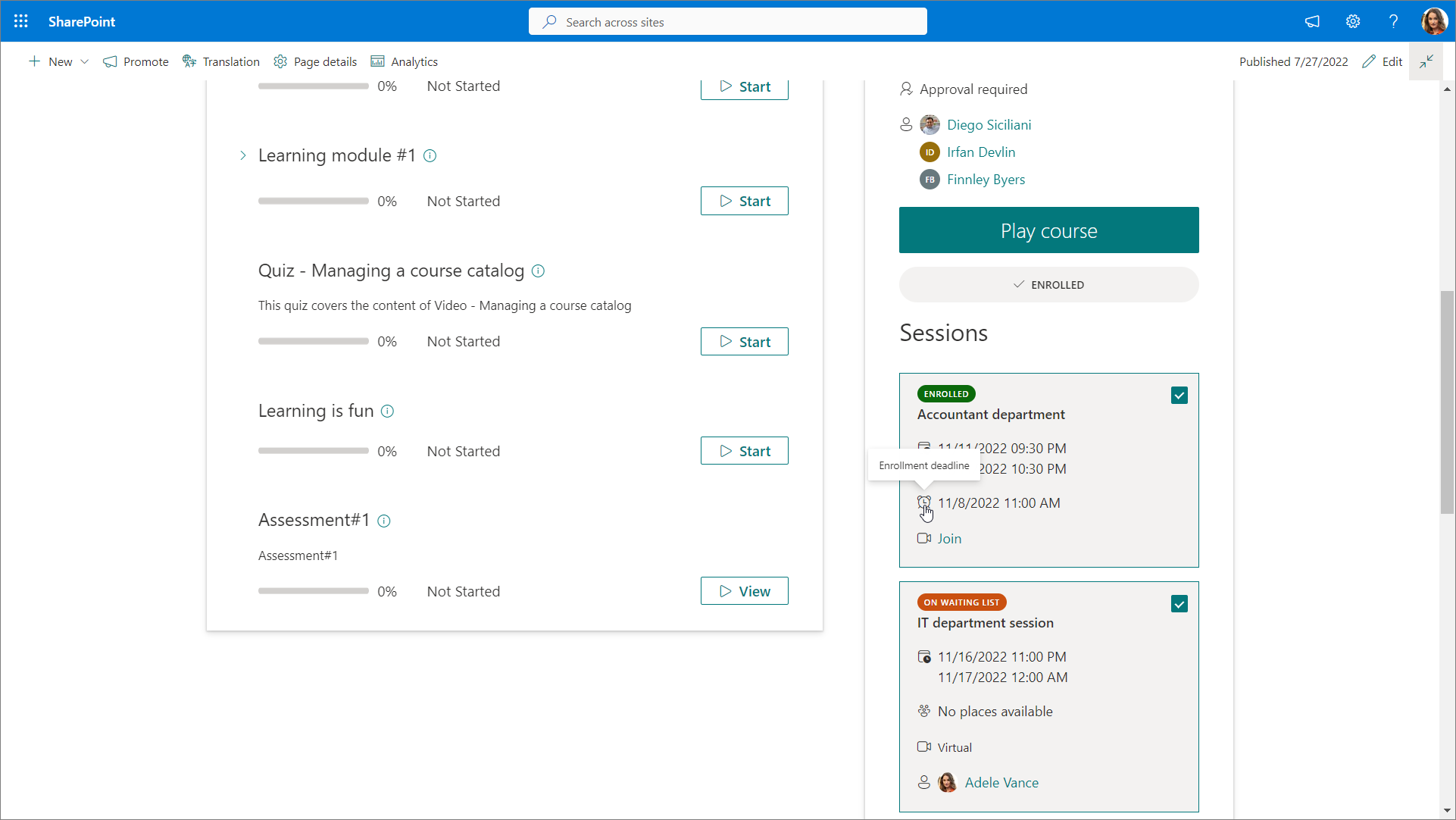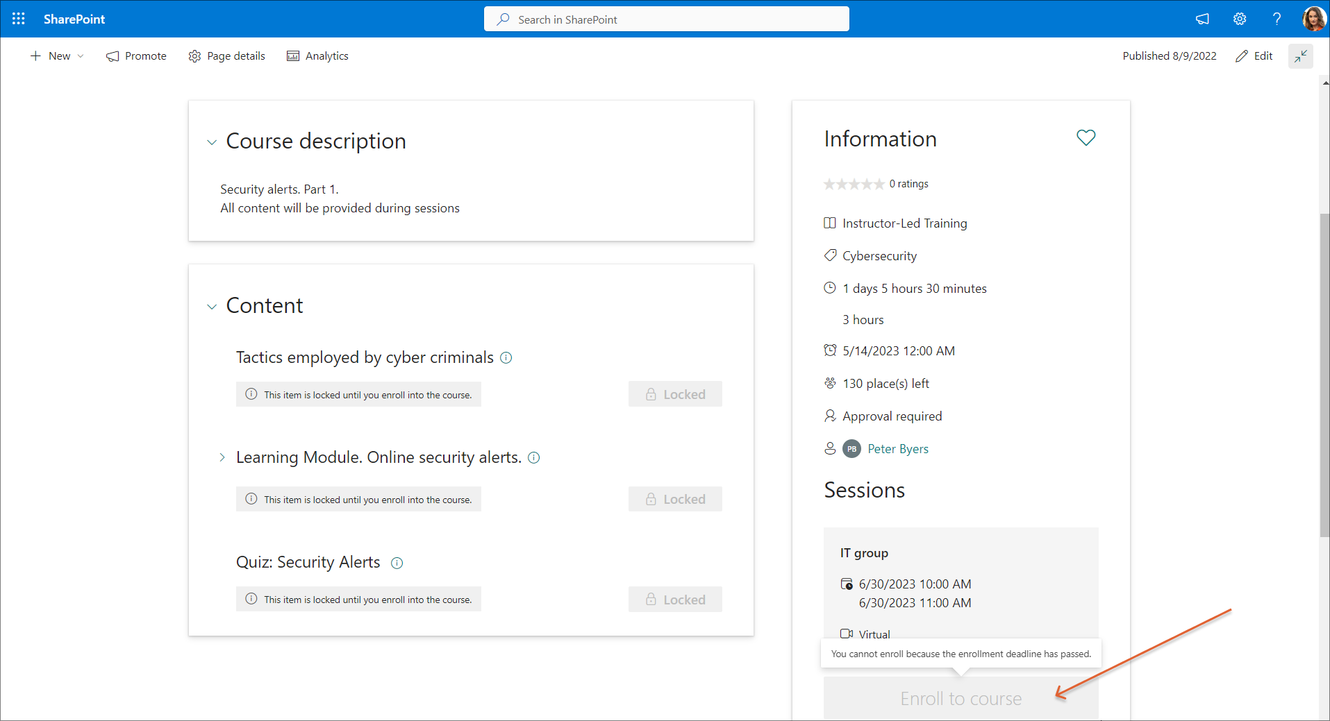 In diesem Artikel geben wir einen Überblick über die Option Registrierungsfrist für veranstaltungsbasierte Schulungen. Mit dieser Option können Kurs- und Katalogadministratoren sowie Sitzungsleiter kurzfristige Registrierungen verhindern. Ferner können Sitzungsleiter damit bei der Planung von Sitzungen die Anzahl der Teilnehmer berücksichtigen.