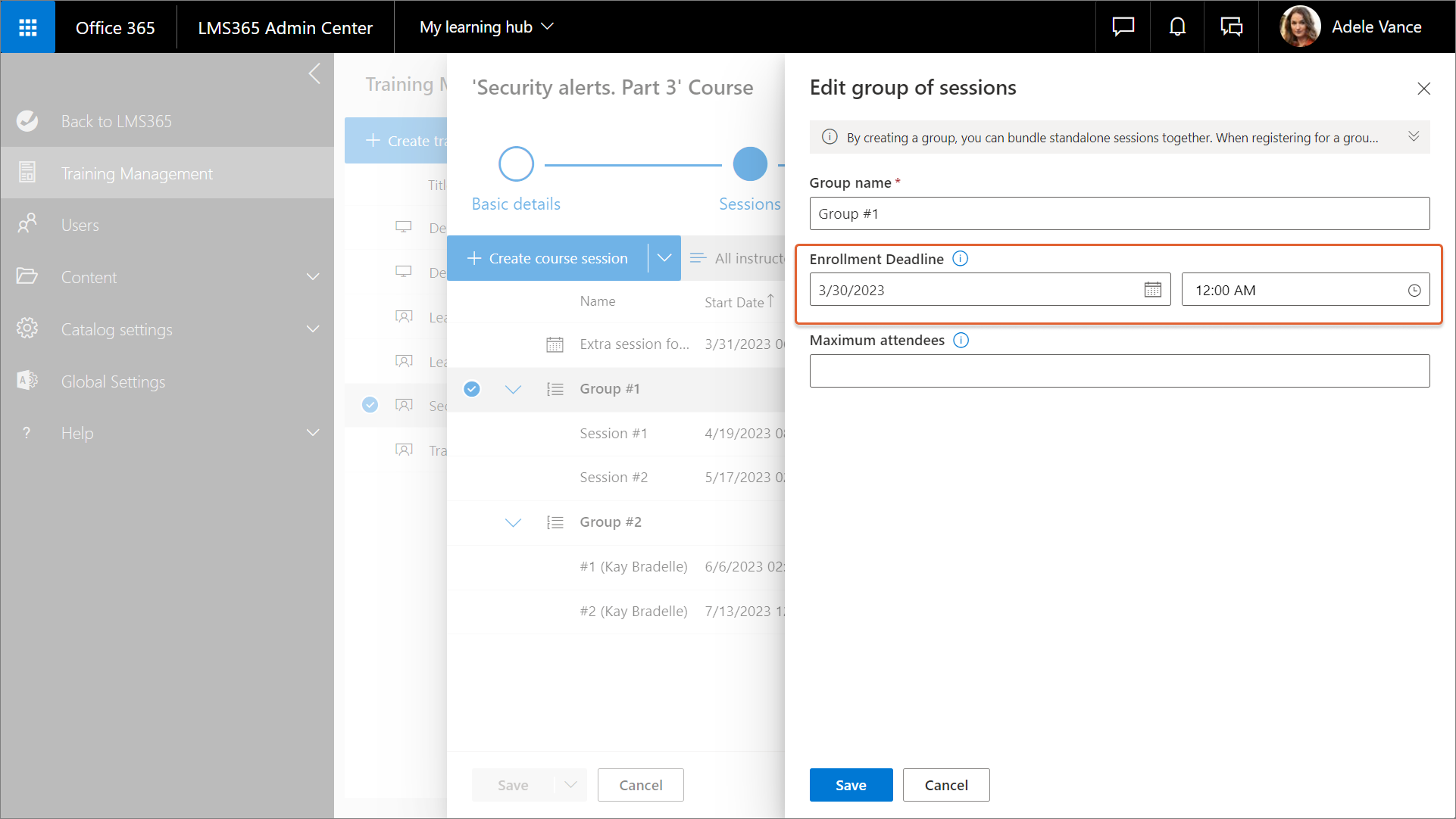2. Füllen Sie im Konfigurationsbereich das Feld Registrierungsfrist aus. Geben Sie für eine Sitzungsgruppe den entsprechenden Anmeldeschluss (Datum und Uhrzeit) an. Die Registrierungsfrist gilt für alle Sitzungen, die zu dieser Gruppe hinzugefügt werden. Admins können Lernende auch nach Ablauf der Frist noch registrieren.
