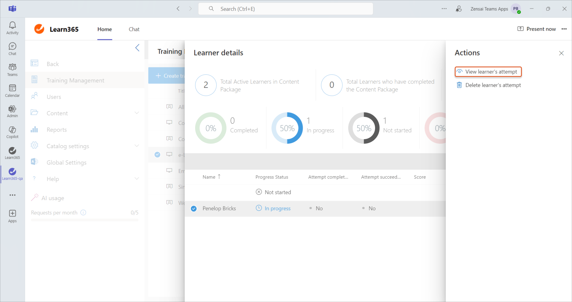 Versuch des Lernenden ansehen im Bereich Aktionen beim Auswählen eines Inhaltspakets > Details über die Lernenden anzeigen > Auswahl eines Lernenden mit dem Status Im Gange oder Abgeschlossen.