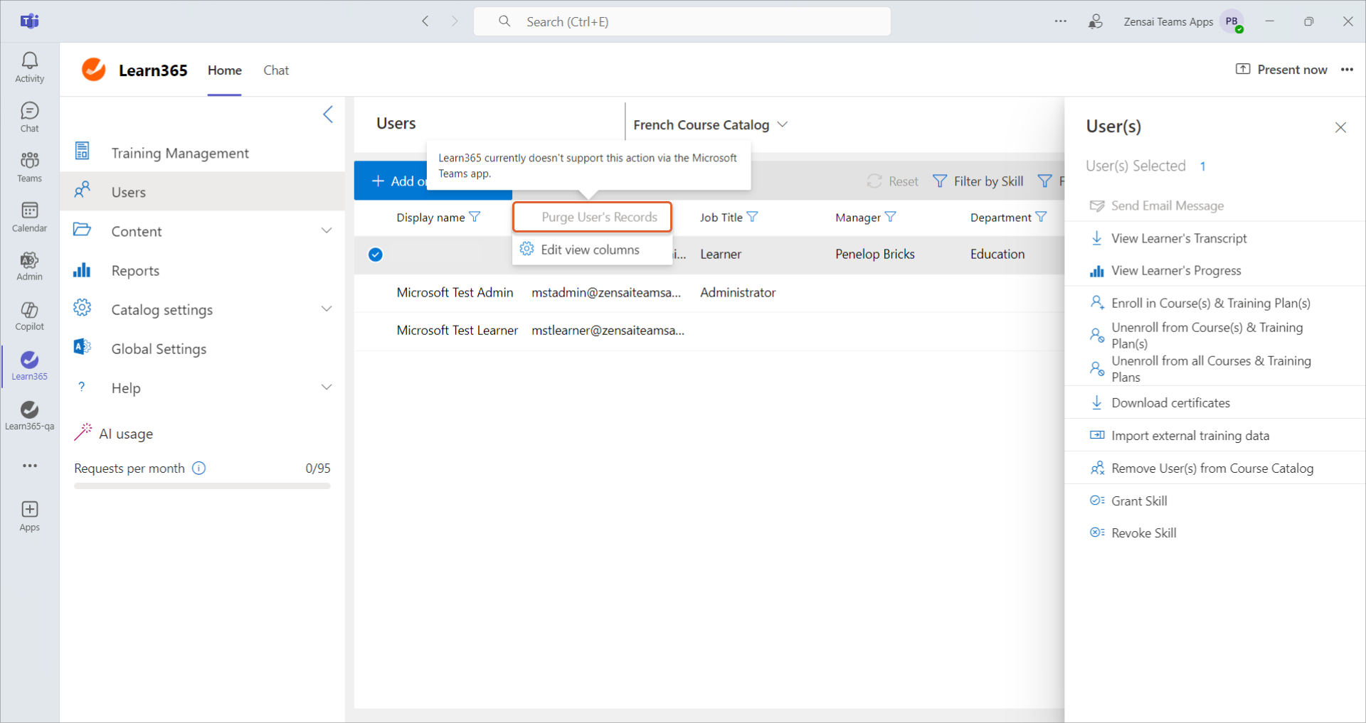 - Die Option Ausgewählte Kursteilnehmer-Einträge aus dem Kurskatalog löschen, mit der Informationen und Aktionsprotokolle einer Person im Katalog entfernt werden können, ist in Microsoft Teams deaktiviert.