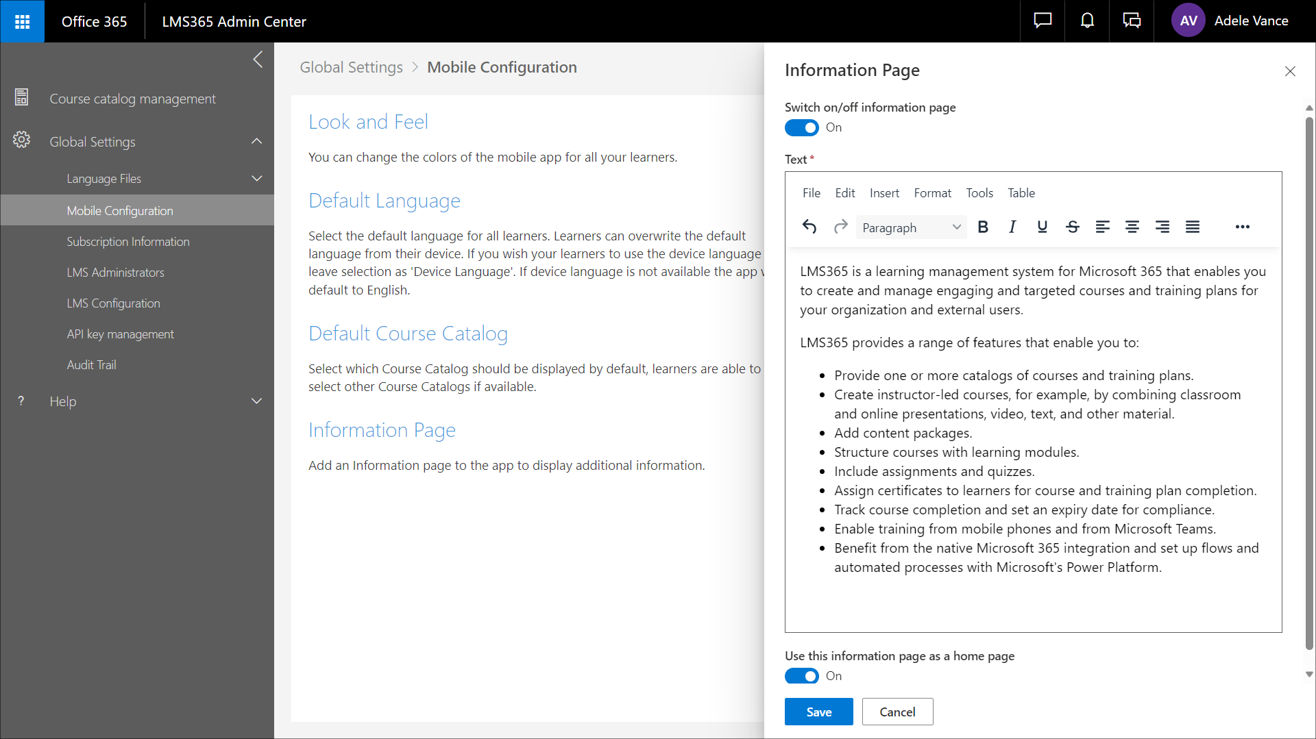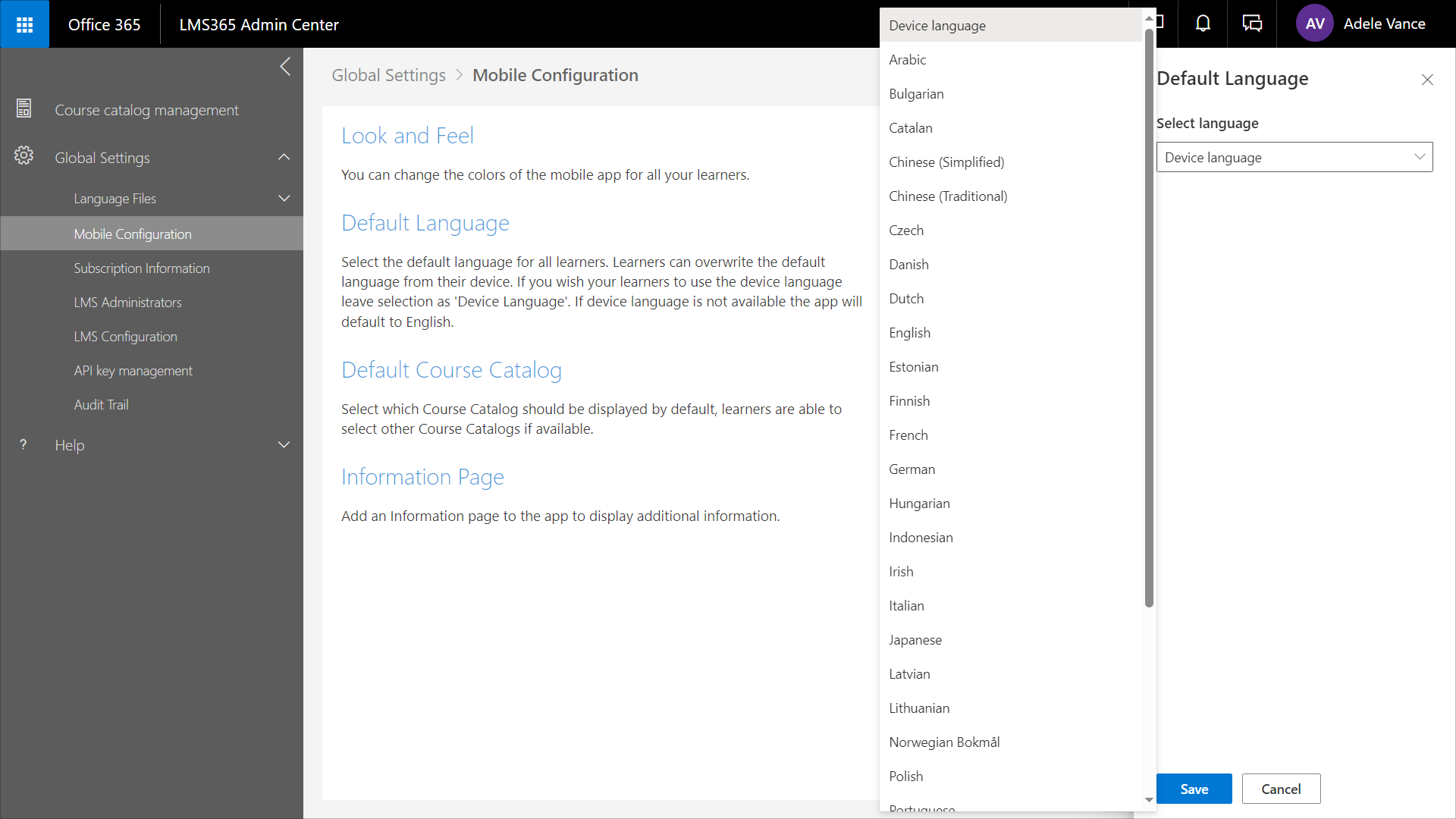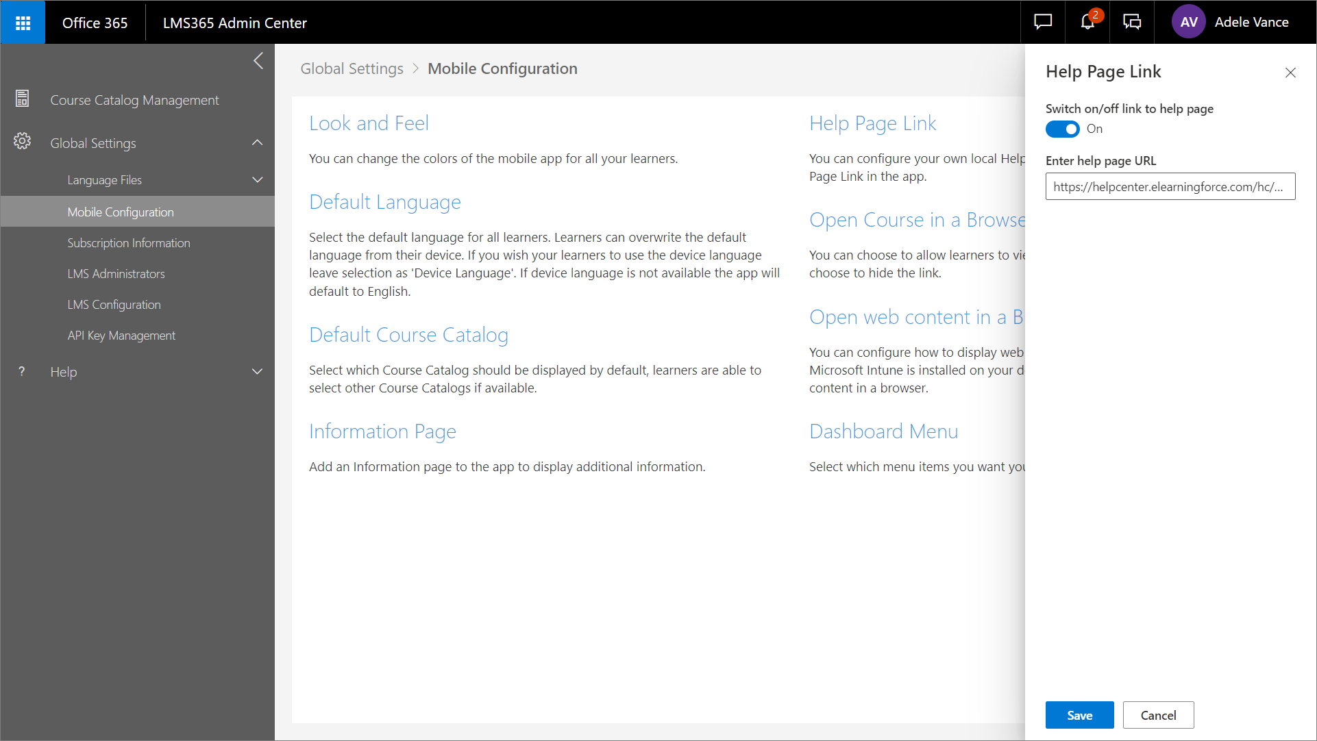 Gehen Sie zu Learn365 Admin Center > Globale Einstellungen > Mobile Konfiguration.