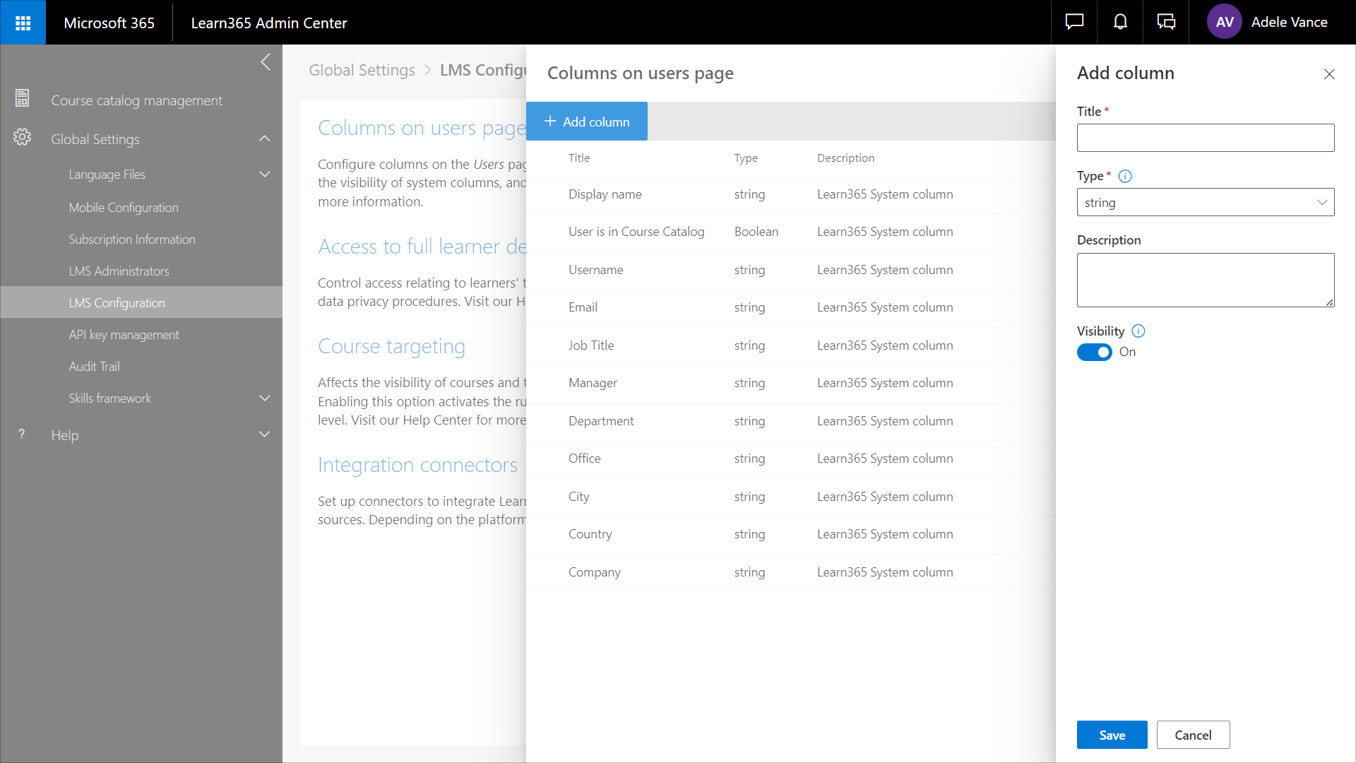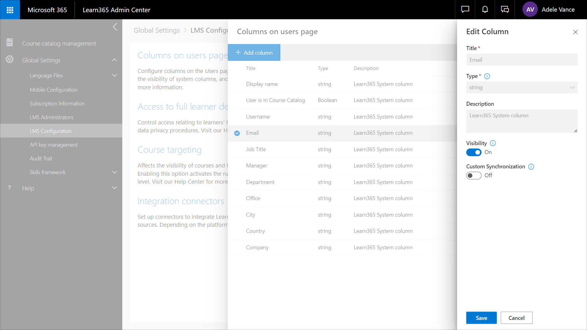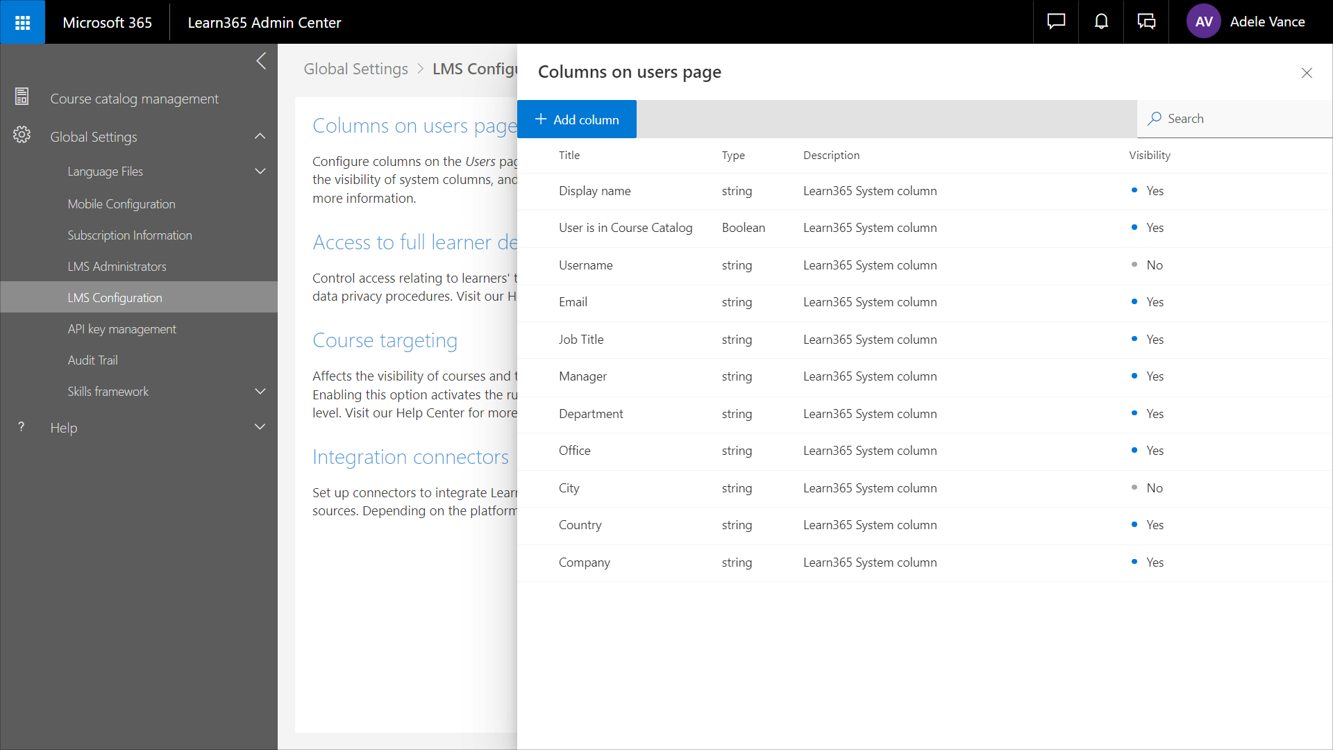 1. Wählen Sie auf der Seite LMS-Konfiguration die Option Spalten auf der Seite Benutzer aus. Der Bereich Spalten auf der Seite Benutzer öffnet sich.