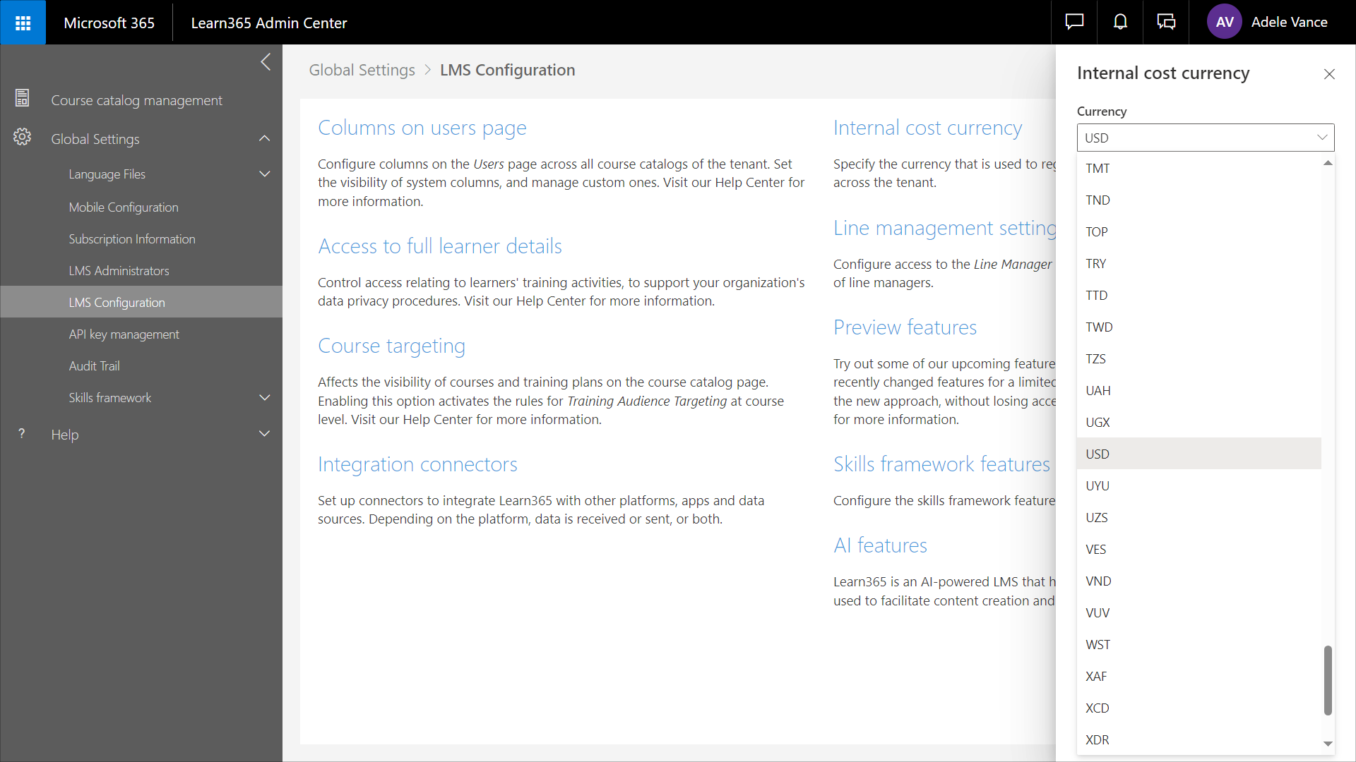 1. Auf der Seite LMS-Konfiguration wählen Sie Währung für interne Kosten aus. Der Bereich Währung für interne Kosten öffnet sich.