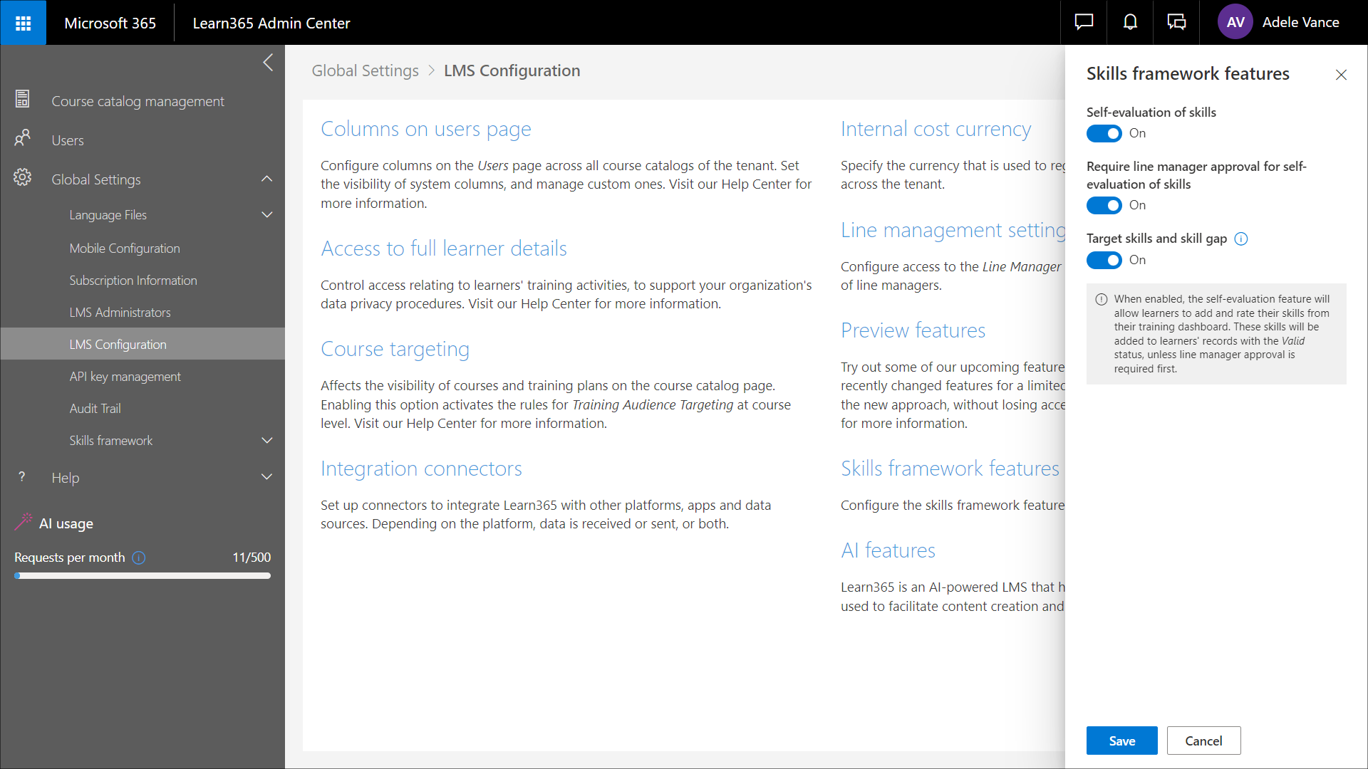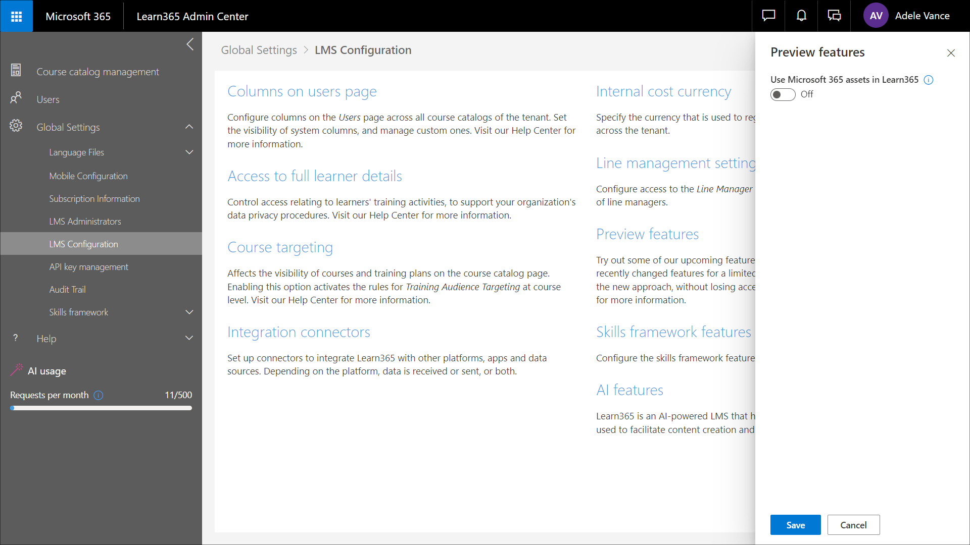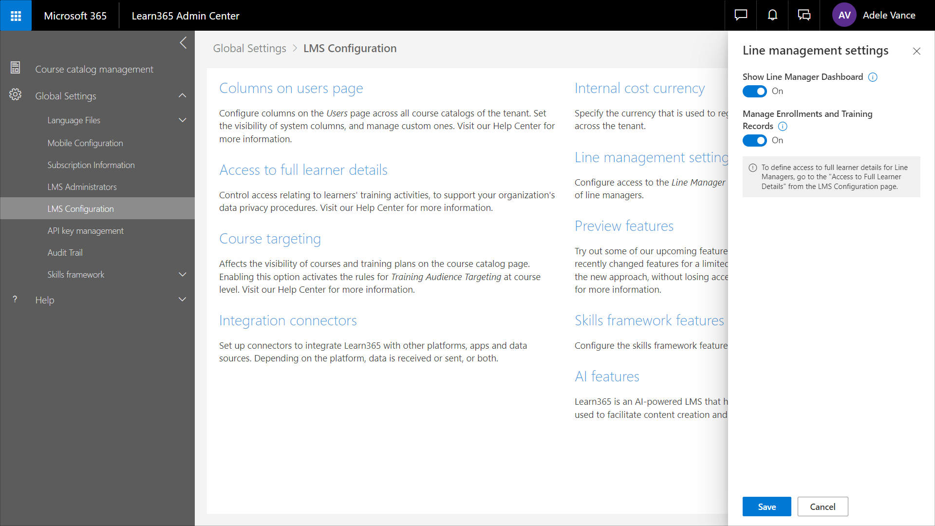 Globale Microsoft 365-Administratoren und LMS-Administratoren können die folgenden Konfigurationen im Abschnitt LMS-Konfiguration in Globale Einstellungen verwalten: