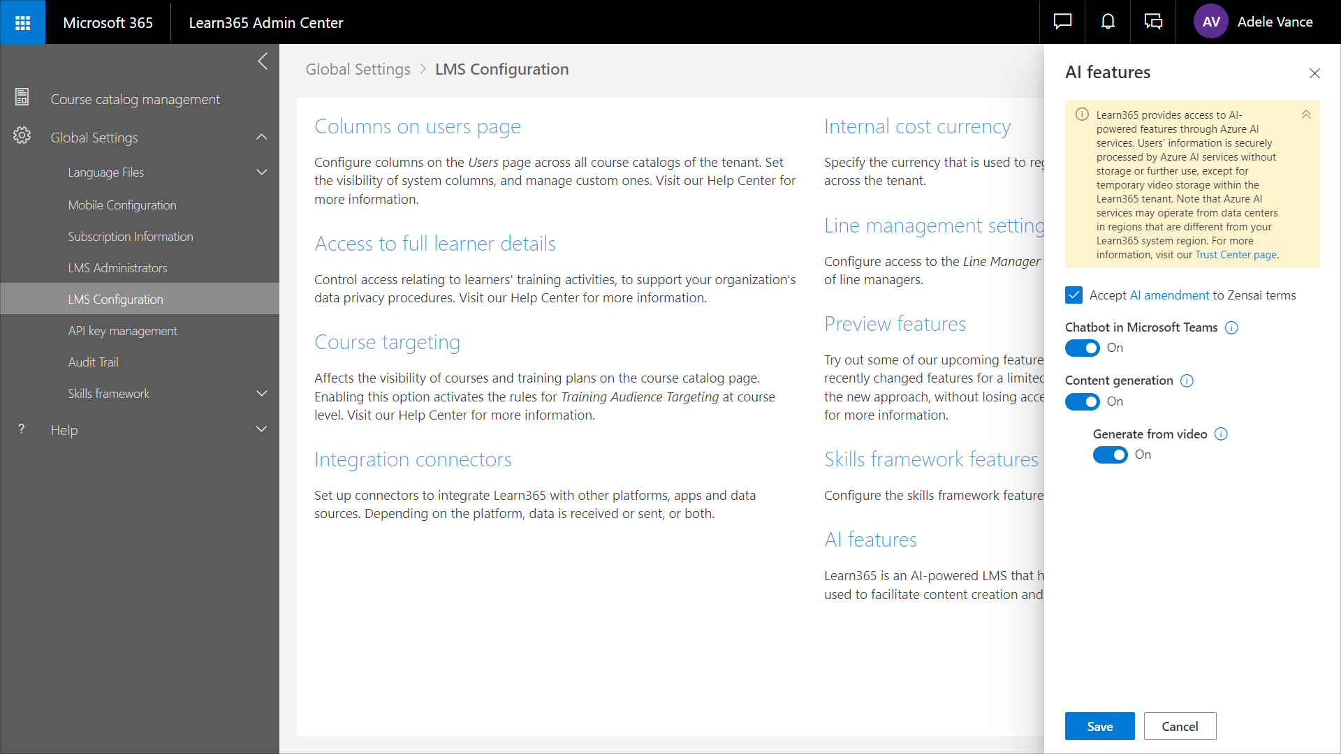 - Vergewissern Sie sich, dass das Kontrollkästchen KI-Änderung der Zensai-Bedingungen akzeptieren aktiviert ist. Weitere Informationen über die Methoden, die Learn365 zur Datenverwaltung, zur Gewährleistung der Privatsphäre und zur Aufrechterhaltung der Sicherheit im Kontext KI-gestützter Funktionen nutzt, finden Sie in diesem Artikel.