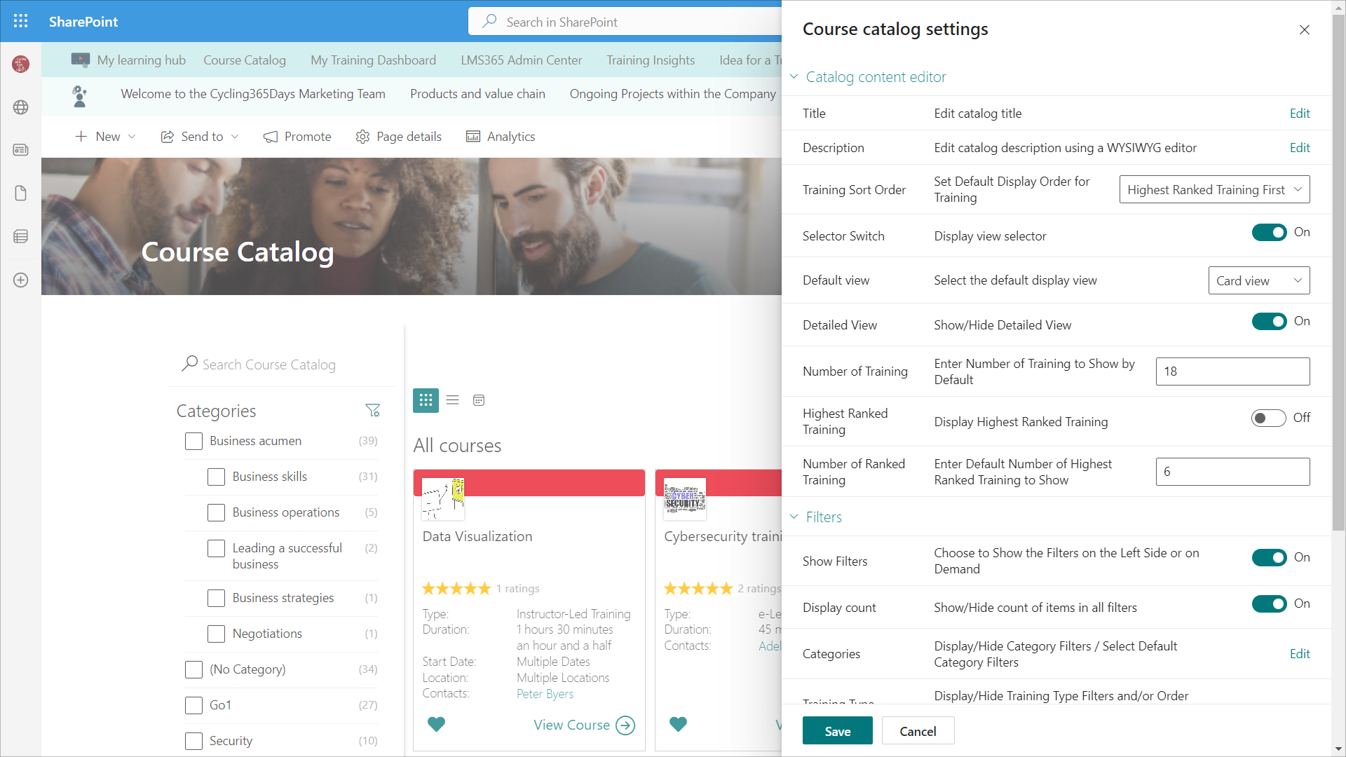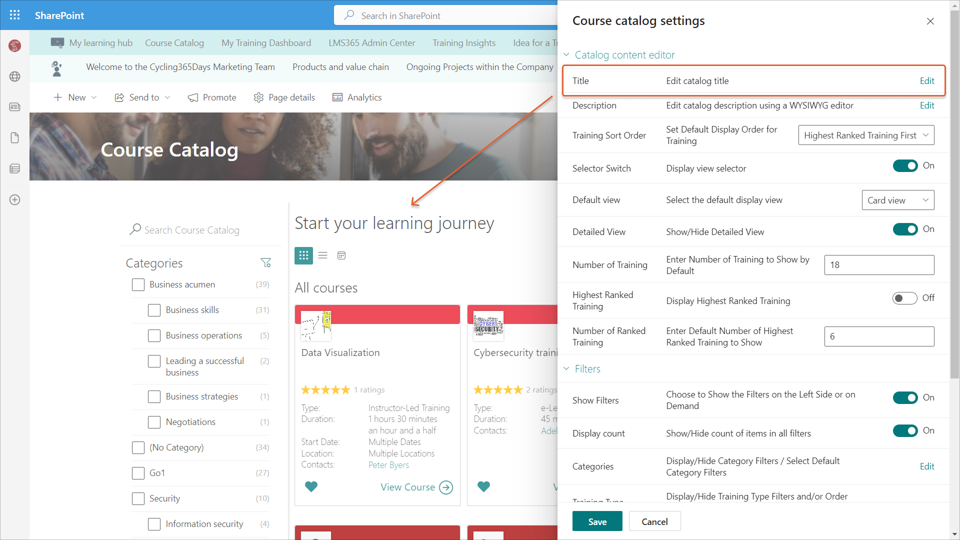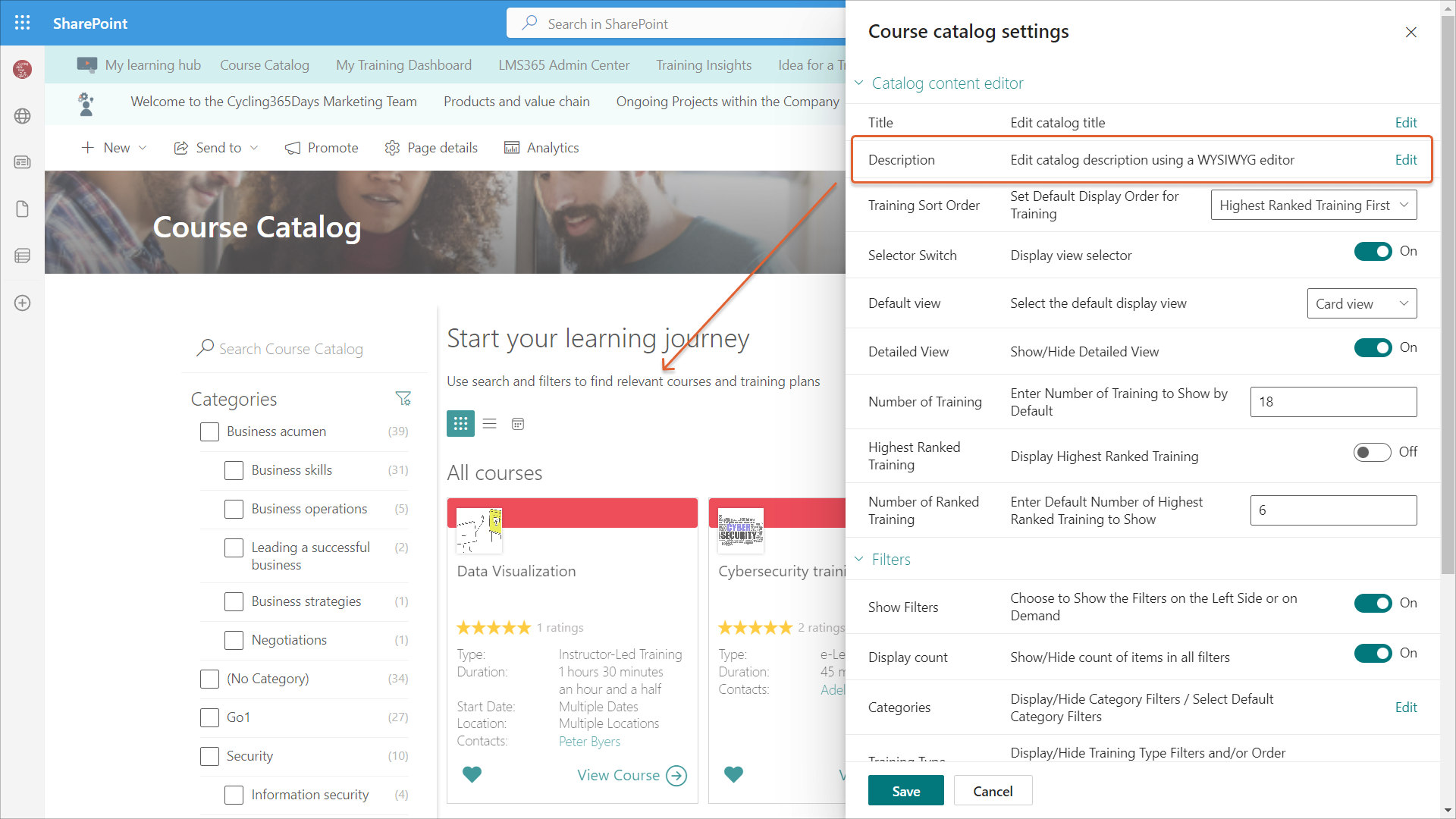 Beschreibung. Hier fügen Sie eine Beschreibung für den Kurskatalog hinzu oder ändern sie über die Option Bearbeiten im Rich-Text-Editor. Die Beschreibung befindet sich unter dem Titel (sofern angegeben) und oberhalb der Liste der Kurse und Schulungspläne im Kurskatalog. Bei Kunden mit einem Learn365 Professional- oder Select-Abonnement enthält der Rich-Text-Editor außerdem die Funktionen Rechtschreibprüfung, Barrierefreiheitsprüfung und PowerPaste (erweitertes Einfügen). Zum Entfernen der Beschreibung leeren Sie das Feld und klicken dann auf Speichern.