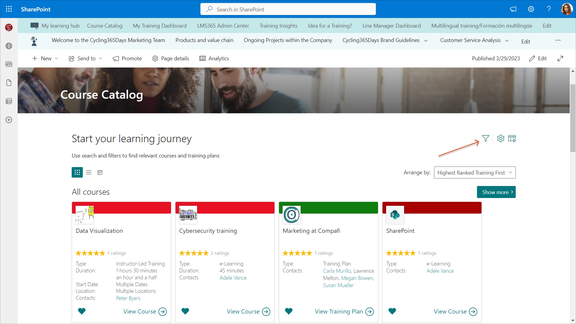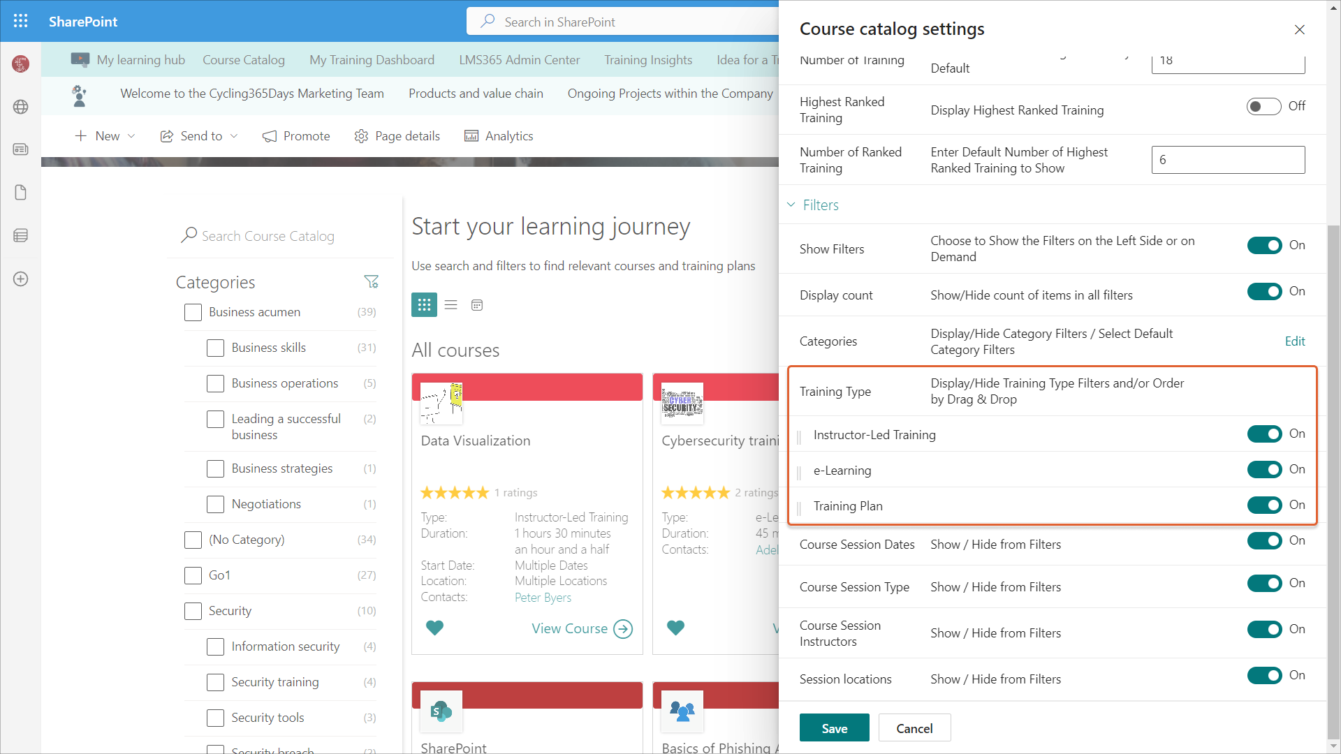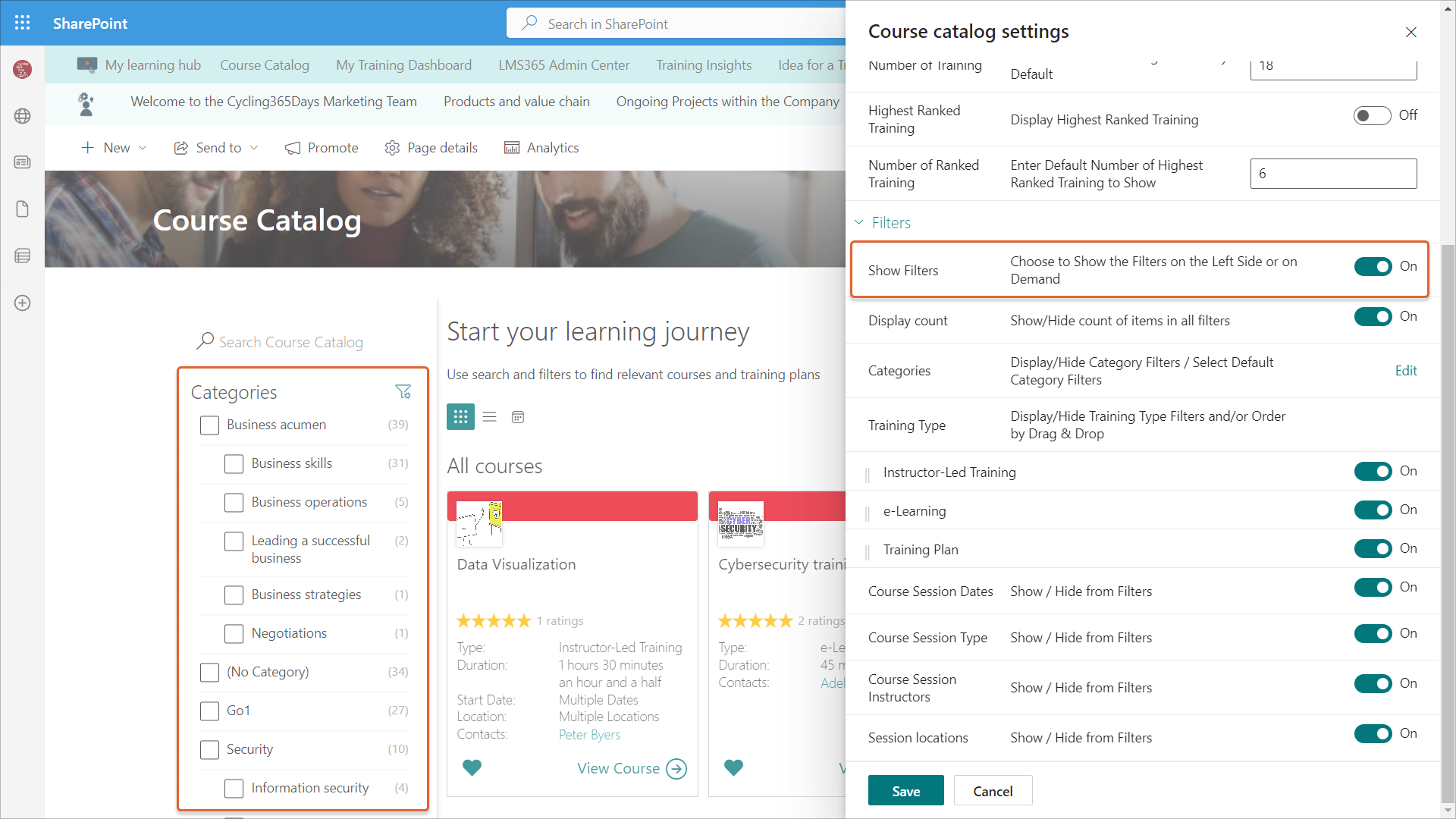 Auf der Kurskatalogstartseite ermöglichen die Einstellungen des Kurskatalogwebparts das Auswählen von Kursen und Schulungsplänen dieses Katalogs und stellen Filter bereit, die Benutzer bei der Suche nach Kursen und Schulungsplänen unterstützen.