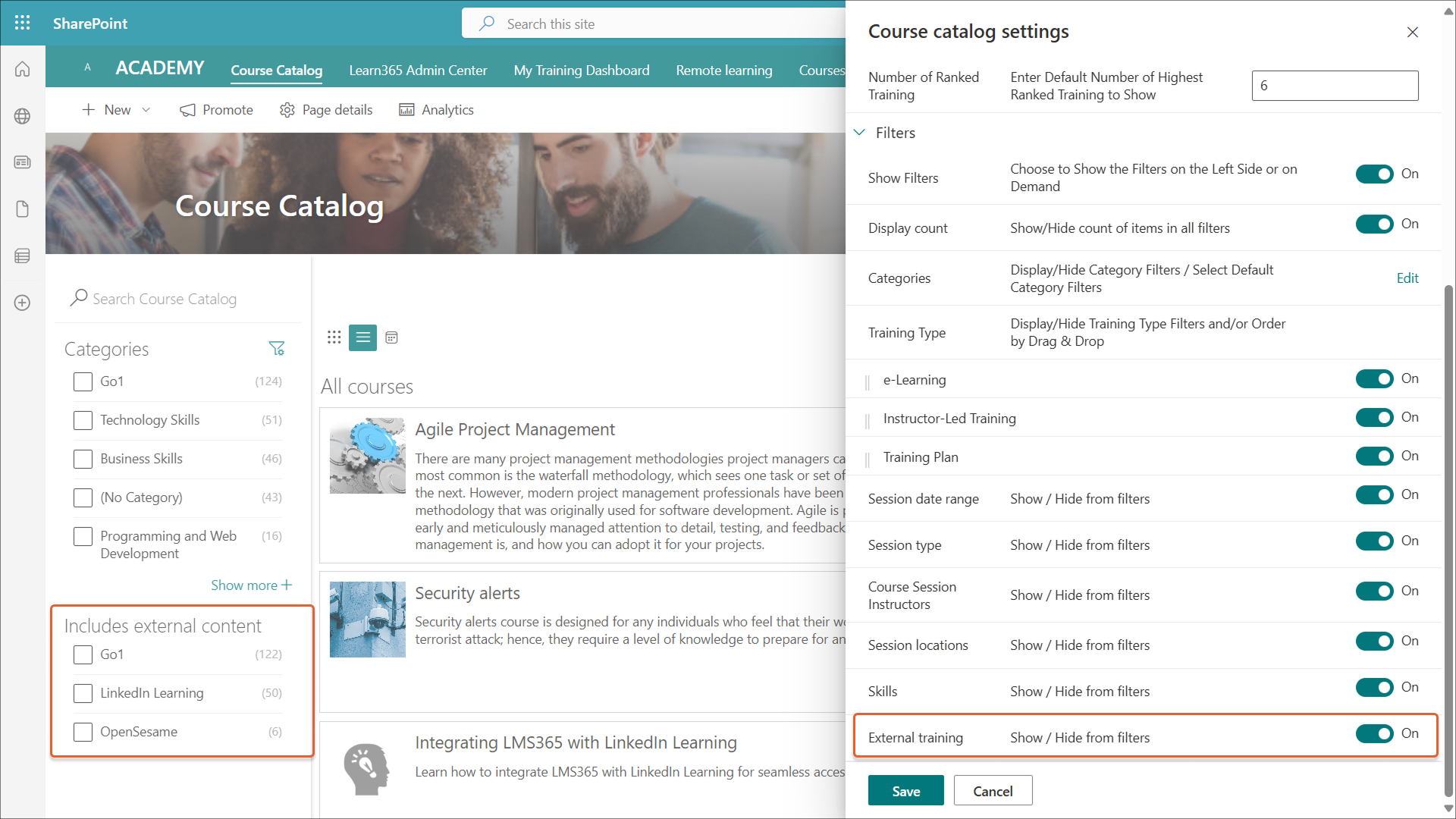 Externe Schulung. Dieser Wahlschalter blendet den Filter Enthält externe Inhalte ein bzw. aus. Standardmäßig ist der Filter ausgeblendet. Wenn die Integration von Go1, LinkedIn Learning, OpenSesame oder Udemy Business eingerichtet ist und Sie den Filter auf Ein festlegen, können Benutzer nach Kursen filtern, die aus Go1, LinkedIn Learning, OpenSesame oder Udemy Business importiert wurden. Alle Schulungspläne, die Kurse von diesen Anbietern enthalten, werden ebenfalls angezeigt.