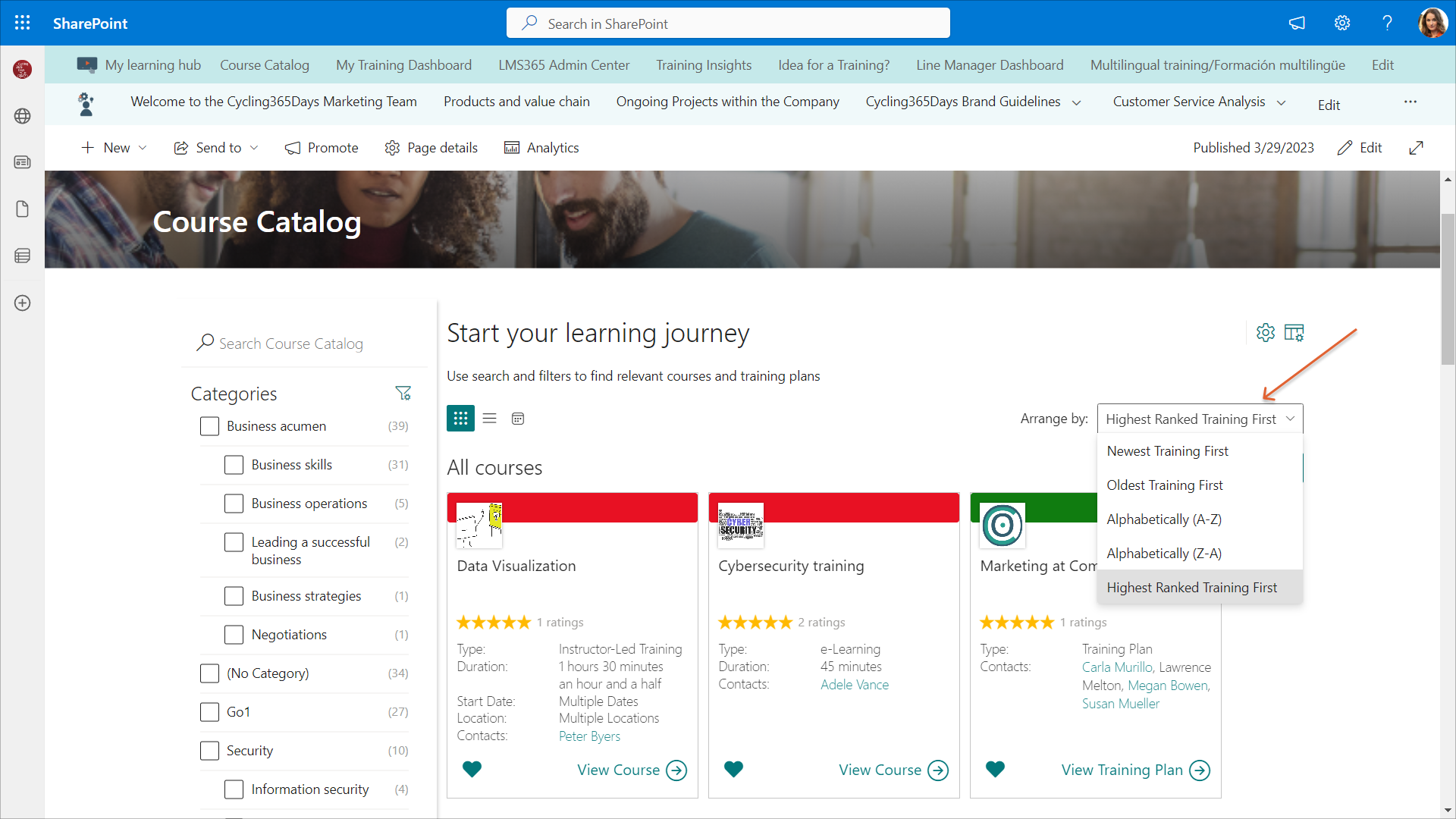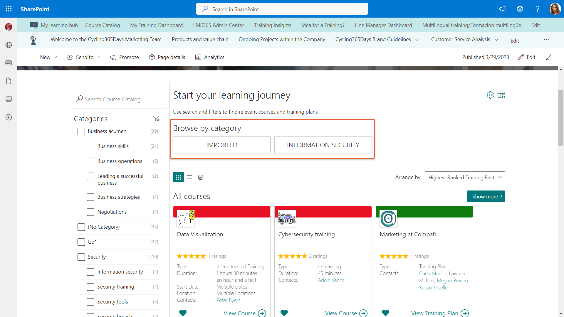 Kategorieoptionen (Kursliste). In der Liste der Kurse und Schulungspläne auf der Katalogseite können Sie Kurse und Schulungspläne nach Kategorie gruppieren. Sie können bis zu fünf Kategorien einrichten, die sofort angezeigt werden, während alle weiteren Kategorien unter Mehr anzeigen verfügbar sind. Kurse und Schulungspläne mit mehreren Kategorien werden unterhalb jeder relevanten Kategoriegruppe angezeigt.