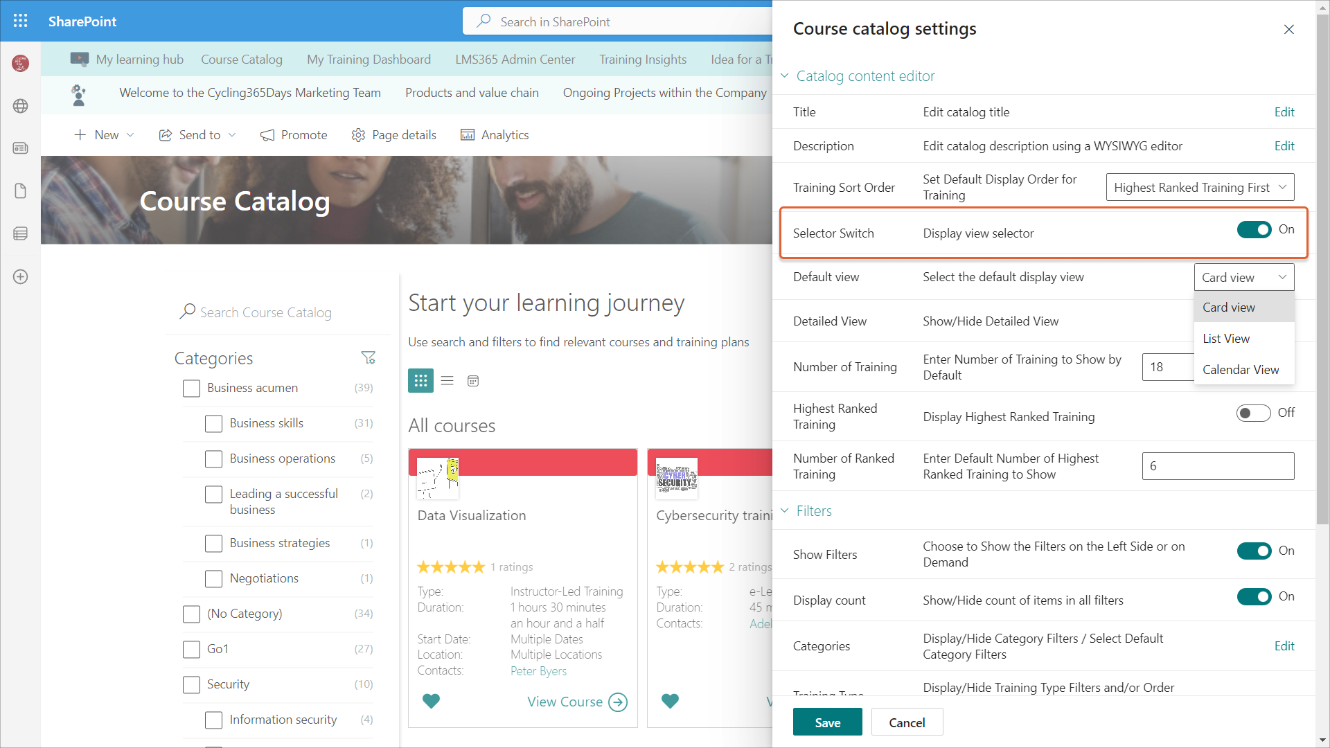 Wahlschalter. Mithilfe dieses Wahlschalters legen Sie fest, ob Benutzer zwischen der Karten-, der Listen- und der Kalenderansicht für Kurse und Schulungspläne wechseln können. Wenn dieser Schalter deaktiviert ist, werden Kurse und Schulungspläne in der Ansicht angezeigt, die unter Standardansicht ausgewählt wurde. Ist der Schalter aktiviert, dann können Benutzer die zu verwendende Ansicht auswählen. Weitere Informationen zu den vorhandenen Ansichten finden Sie hier.