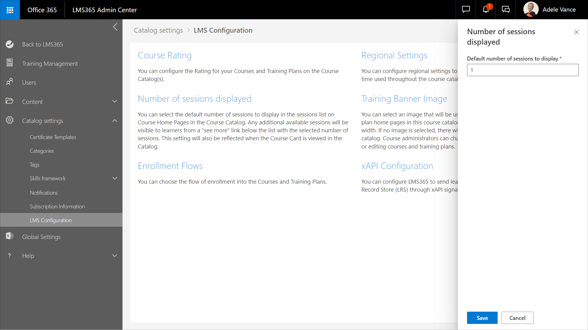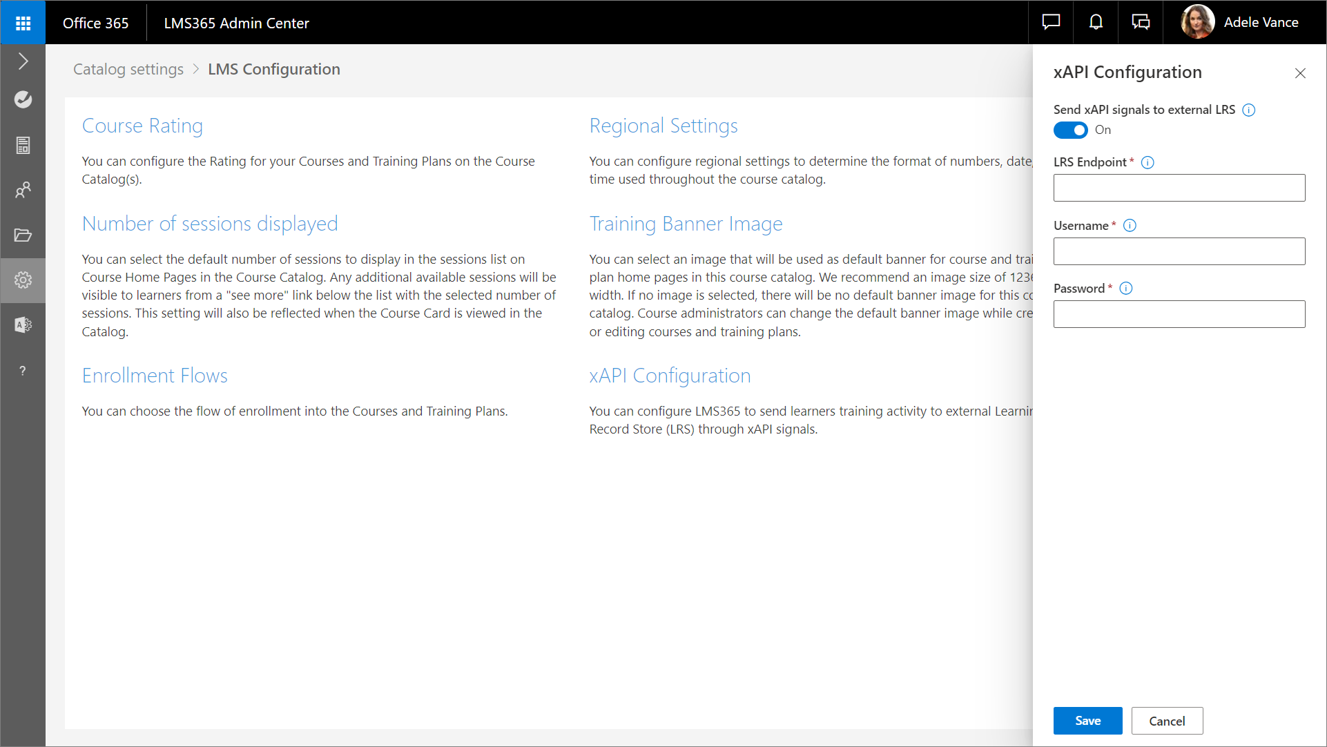 1. Gehen Sie im Learn365 Admin Center zu Katalogeinstellungen > LMS-Konfiguration. Der Bereich LMS-Konfiguration öffnet sich.