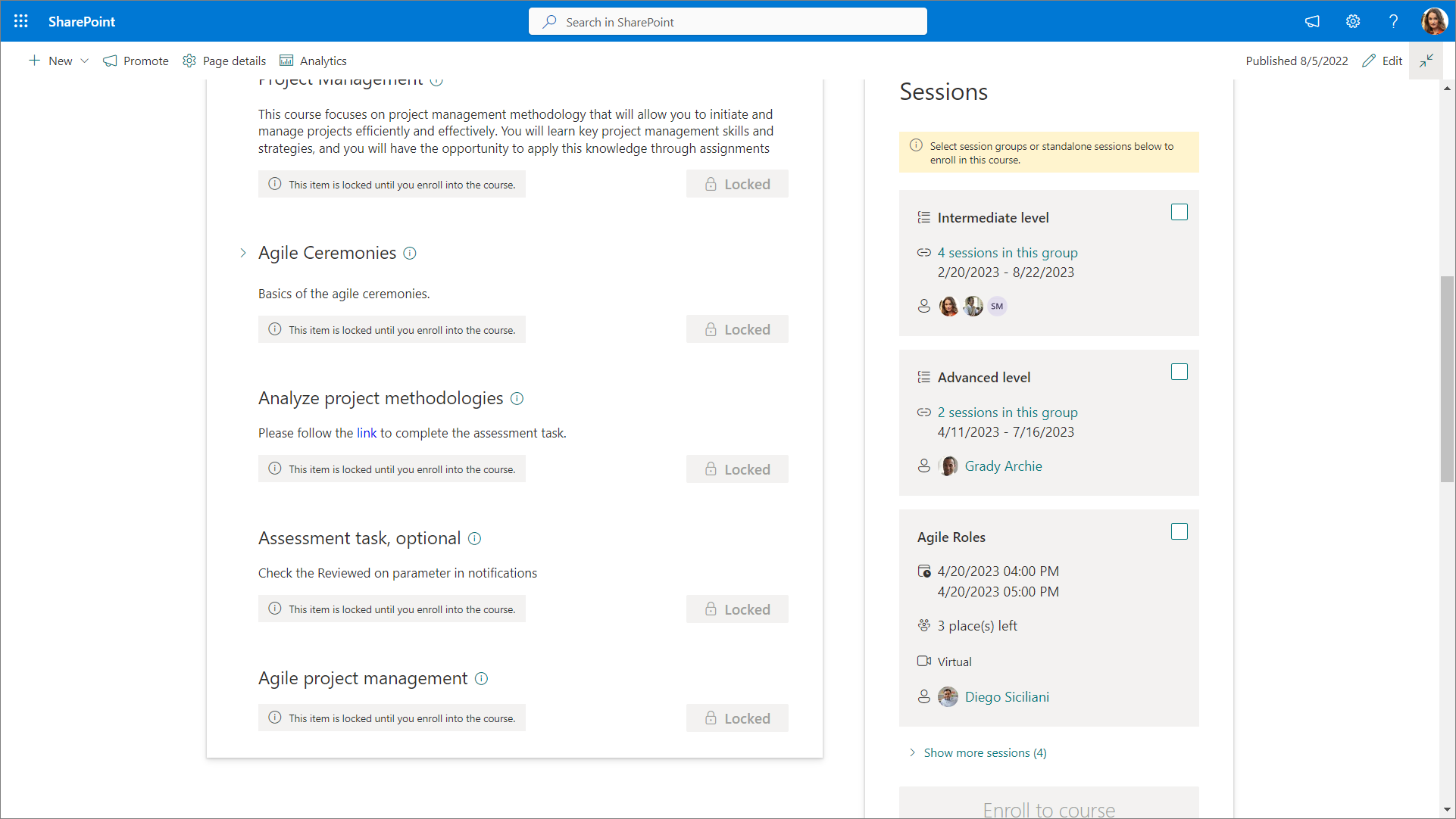 Sie können festlegen, wie viele Sitzungen oder Sitzungsgruppen für veranstaltungsbasierte Kurse auf der Kursstartseite und in der Sitzungsanzeige der Kurskarte aufgelistet werden, wenn der Kurs im Katalog in der Vorschau angezeigt wird.