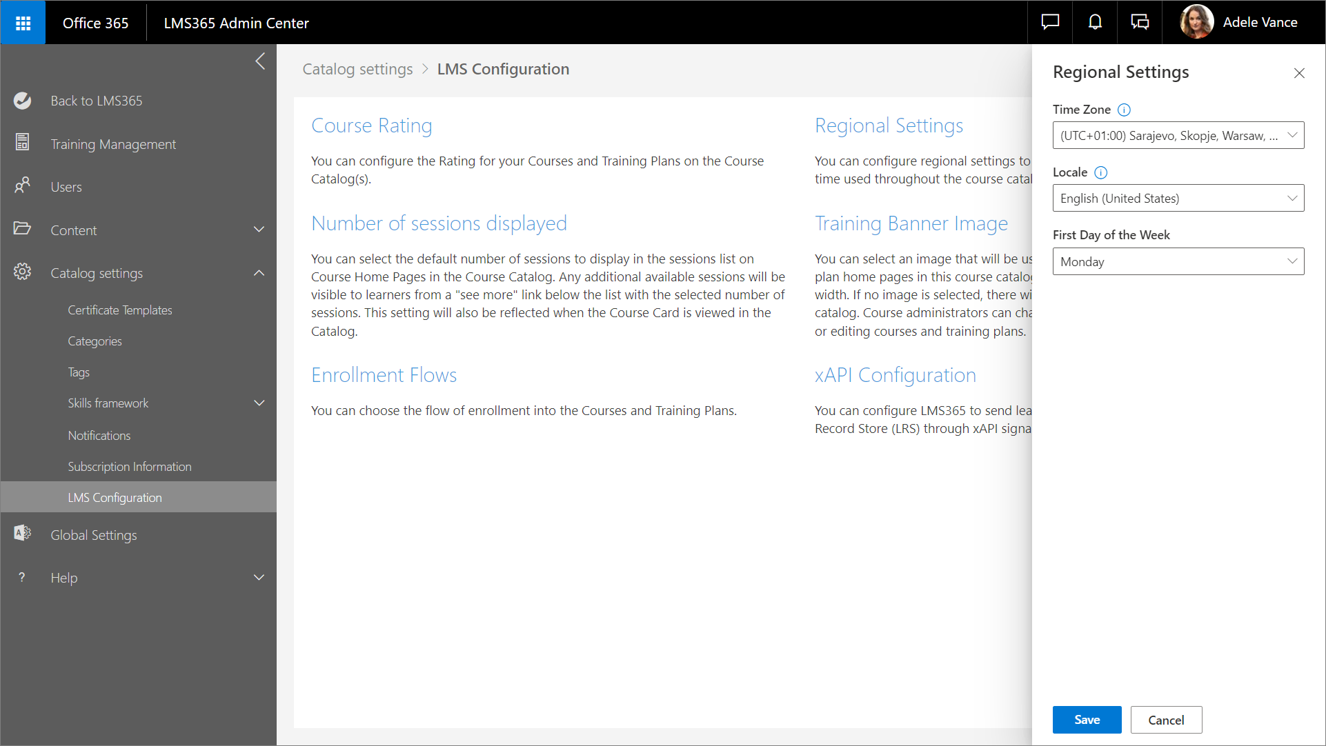 In den Ländereinstellungen können Sie die Zeitzone, das Gebietsschema und den ersten Tag der Woche für den aktuellen Katalog konfigurieren. Standardmäßig übernehmen Kurse und Schulungspläne ihre Ländereinstellungen vom Katalog.
