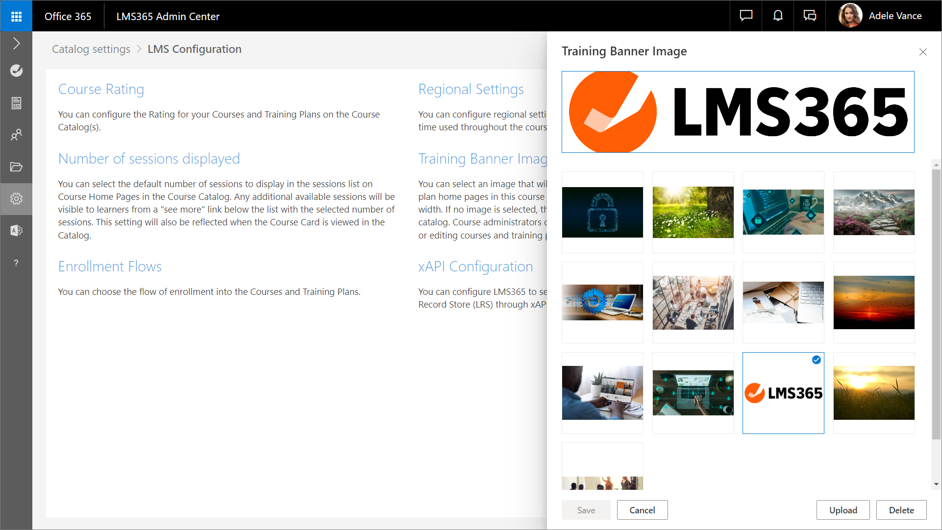 Über die Option Schulungsbannergrafik können Sie eine Bibliothek mit Bannergrafiken auf Katalogebene hochladen und eine davon als Standardbannergrafik für Kurse und Schulungspläne im aktuellen Katalog auswählen.