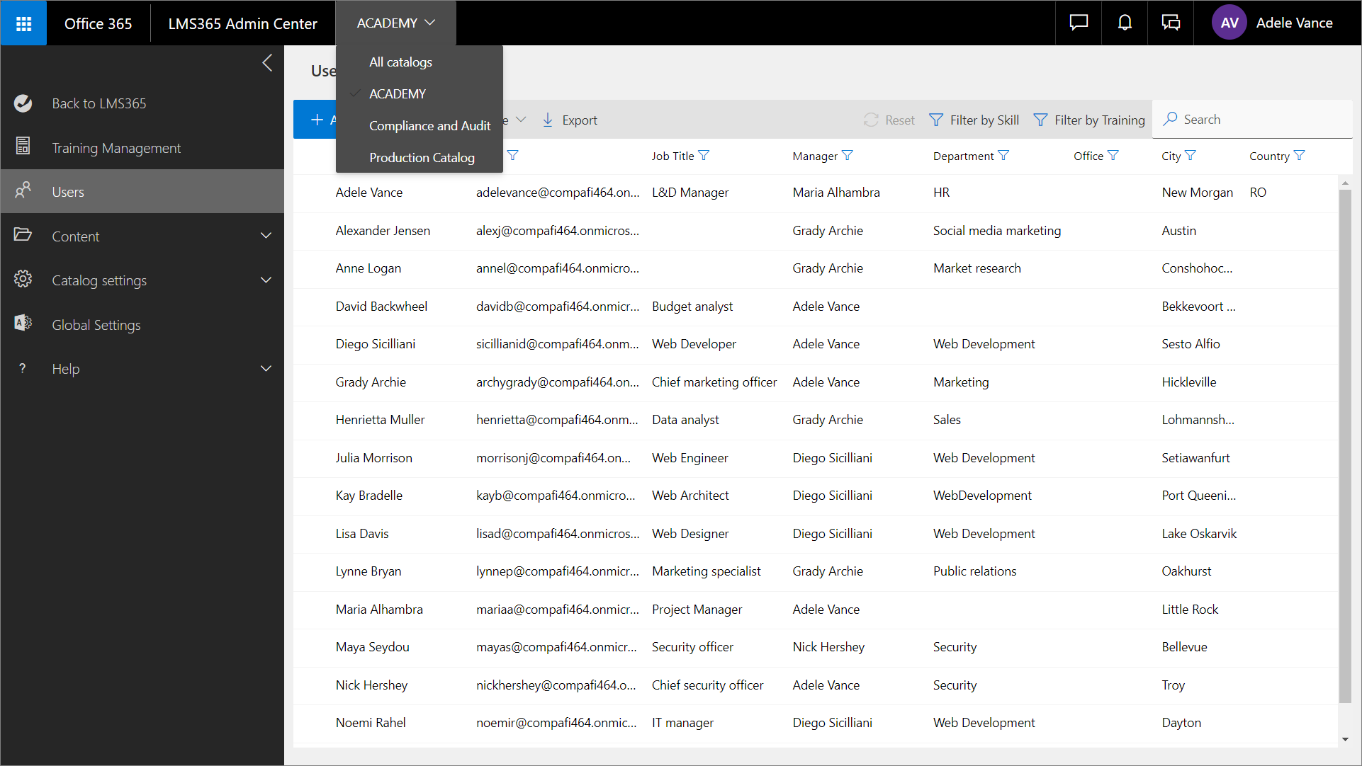 Sie können mehrere Filter gleichzeitig verwenden. Zum Beispiel können Sie Lernende nach einem bestimmten Manager und Land filtern, um Benutzer im Katalog anzuzeigen, die diesem Manager unterstellt sind und sich im betreffenden Land befinden.