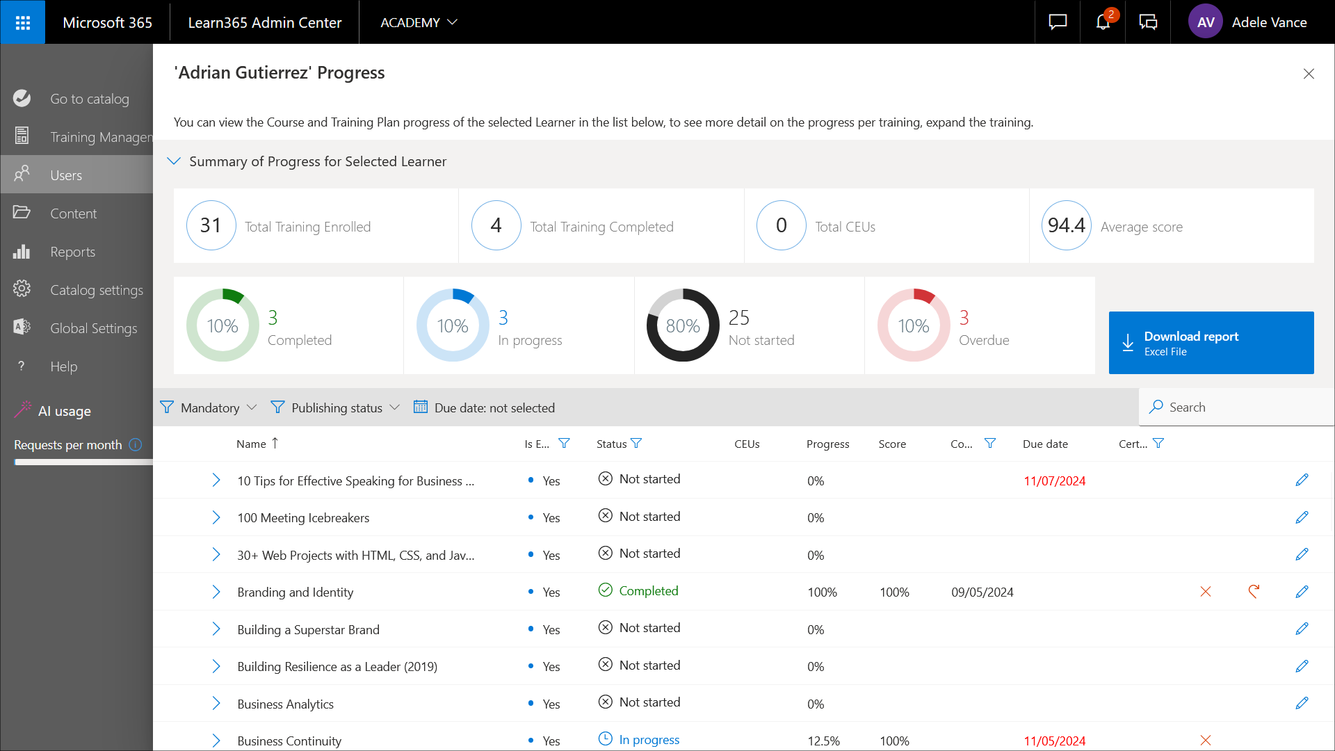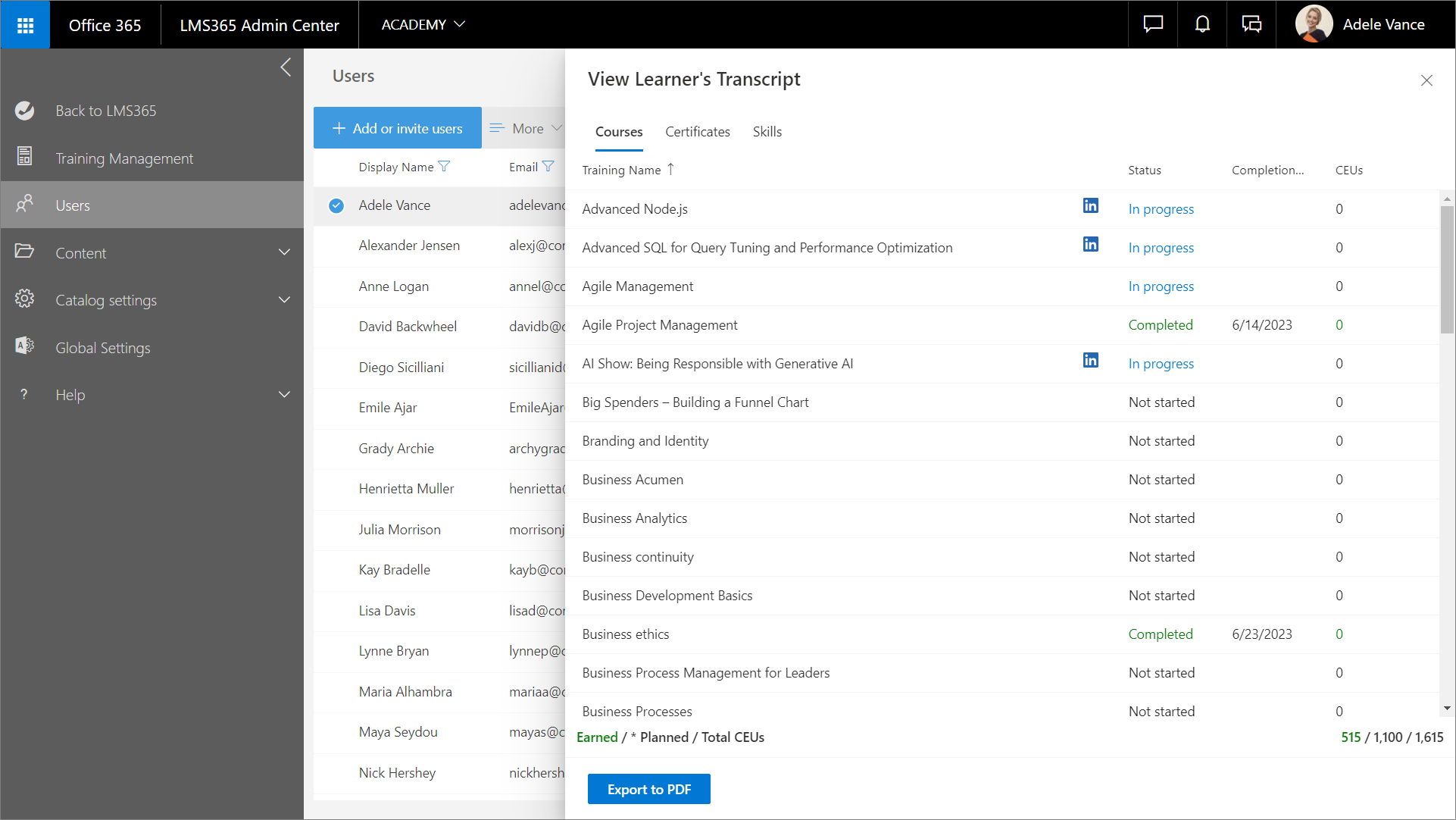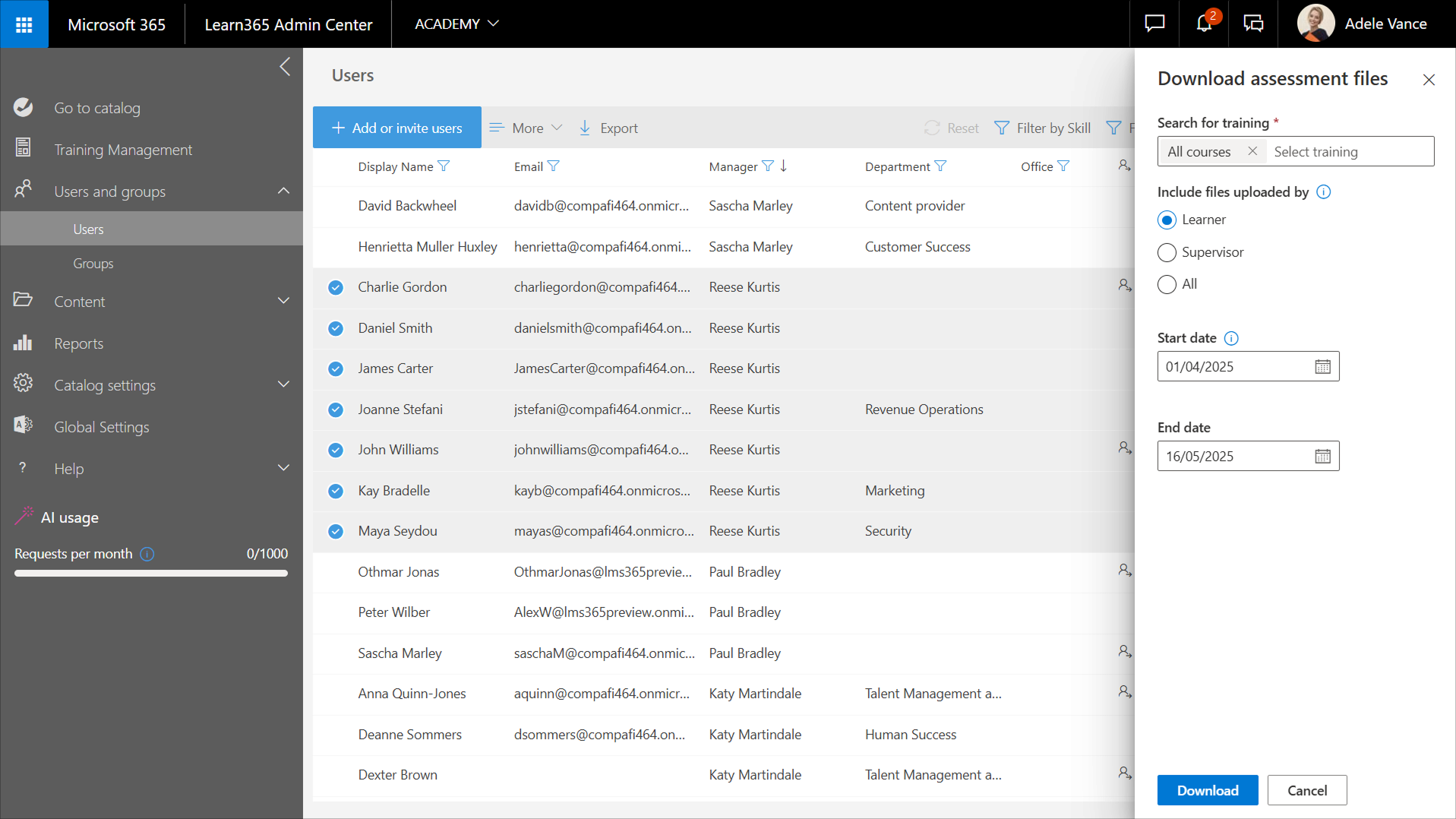 Auf der Seite Benutzer im Learn365 Admin Center können Katalogadministratoren Benutzer im aktuellen Katalog verwalten. Katalogadministratoren können Benutzer einem Katalog oder einzelnen Kursen oder Schulungsplänen hinzufügen oder Gäste einladen, den Fortschritt der Lernenden verfolgen und Fortschrittsberichte herunterladen, Qualifikationen zuerkennen oder widerrufen, Teilnehmerzertifikate und Bewertungsdateien herunterladen und Daten der Lernenden aus Learn365 löschen.