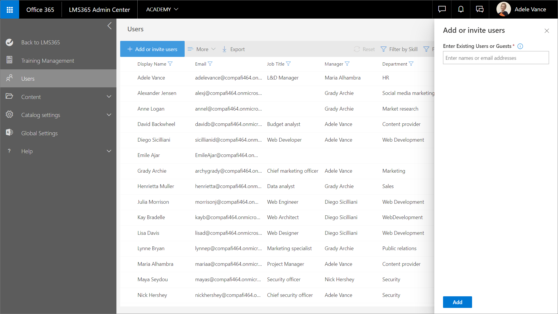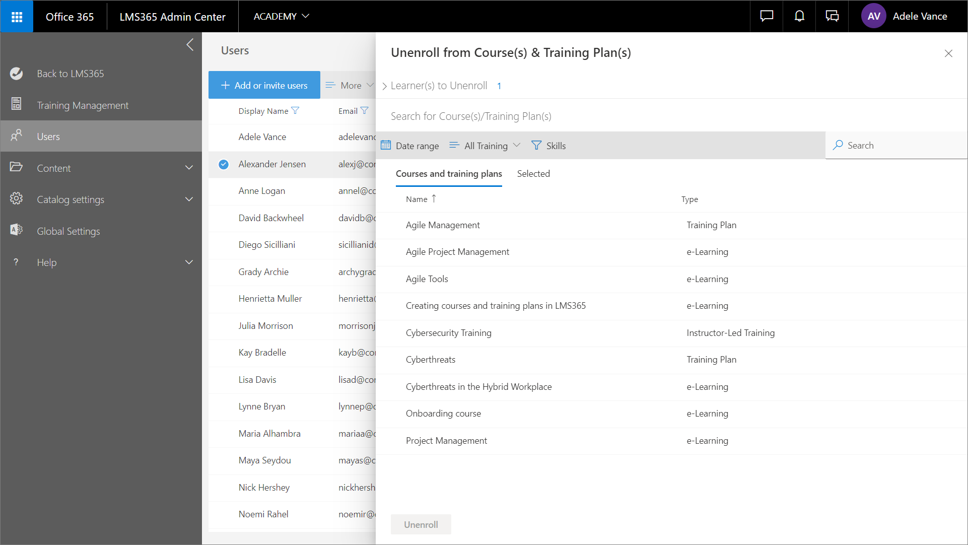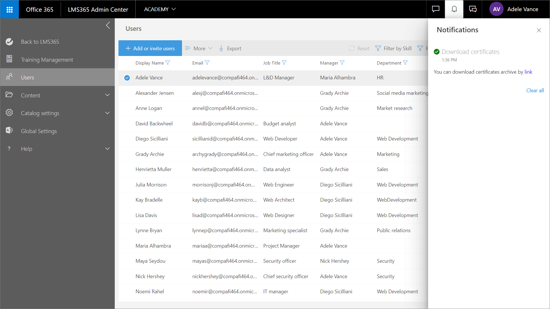 Auf der Seite Benutzer im Learn365 Admin Center können Katalogadministratoren Benutzer im aktuellen Katalog verwalten. Katalogadministratoren können Benutzer einem Katalog oder einzelnen Kursen oder Schulungsplänen hinzufügen oder Gäste einladen, den Fortschritt der Lernenden verfolgen und Fortschrittsberichte herunterladen, Qualifikationen zuerkennen oder widerrufen, Teilnehmerzertifikate und Bewertungsdateien herunterladen und Daten der Lernenden aus Learn365 löschen.