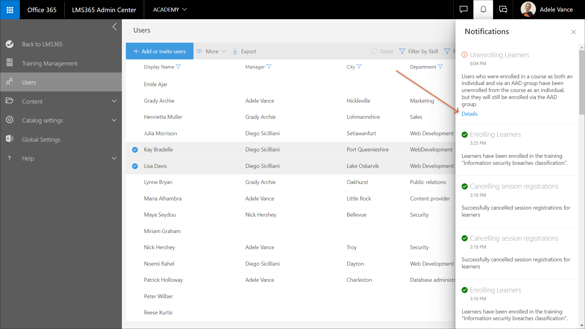 1. Wählen Sie auf der Seite Benutzer die relevanten Benutzer aus. Um alle Benutzer in der angezeigten Liste auszuwählen, aktivieren Sie das Kontrollkästchen links neben der Spalte Name. Um alle Benutzer im aktuellen Kurskatalog auszuwählen, wählen Sie alle Filter ab und aktivieren dann das Kontrollkästchen links neben der Spalte Name. Der Bereich Benutzer wird geöffnet.