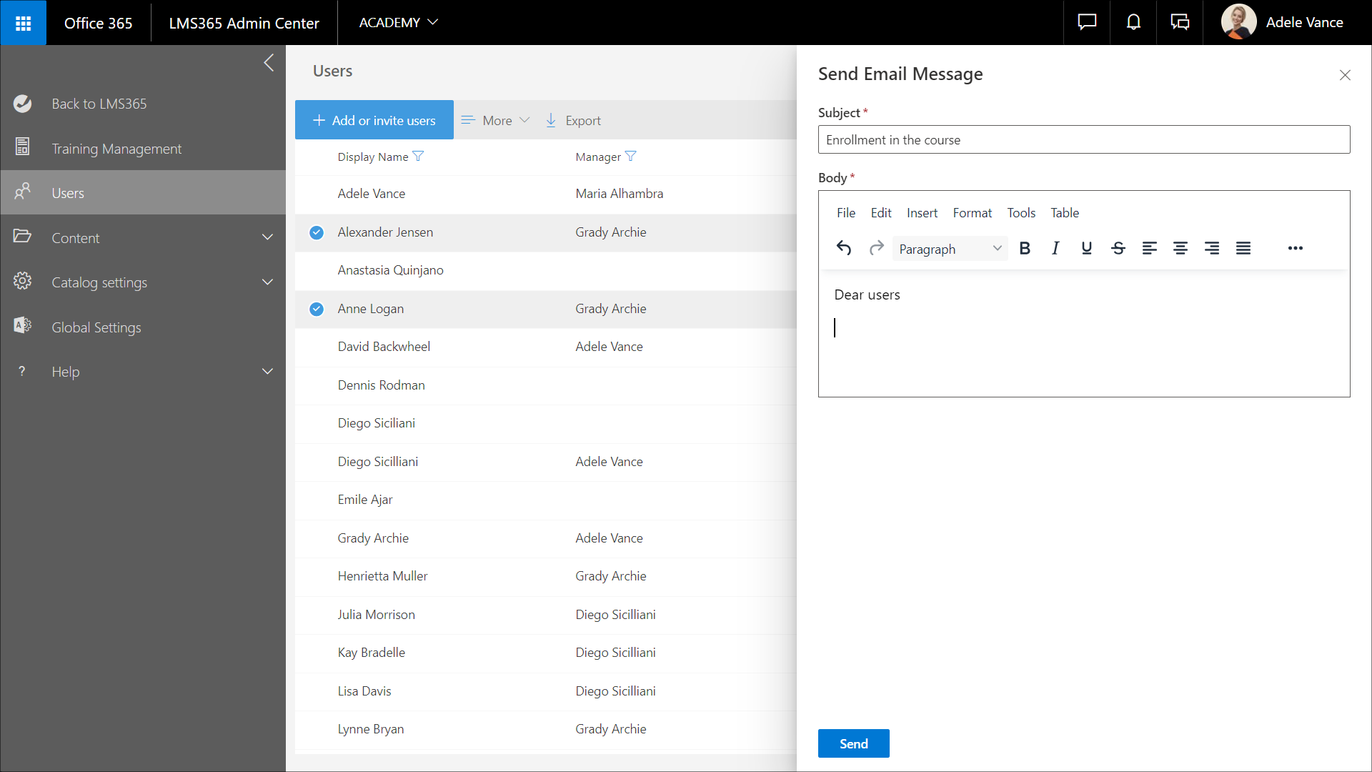 4. Wählen Sie Senden aus, um die Nachricht an die ausgewählten Benutzer zu senden.