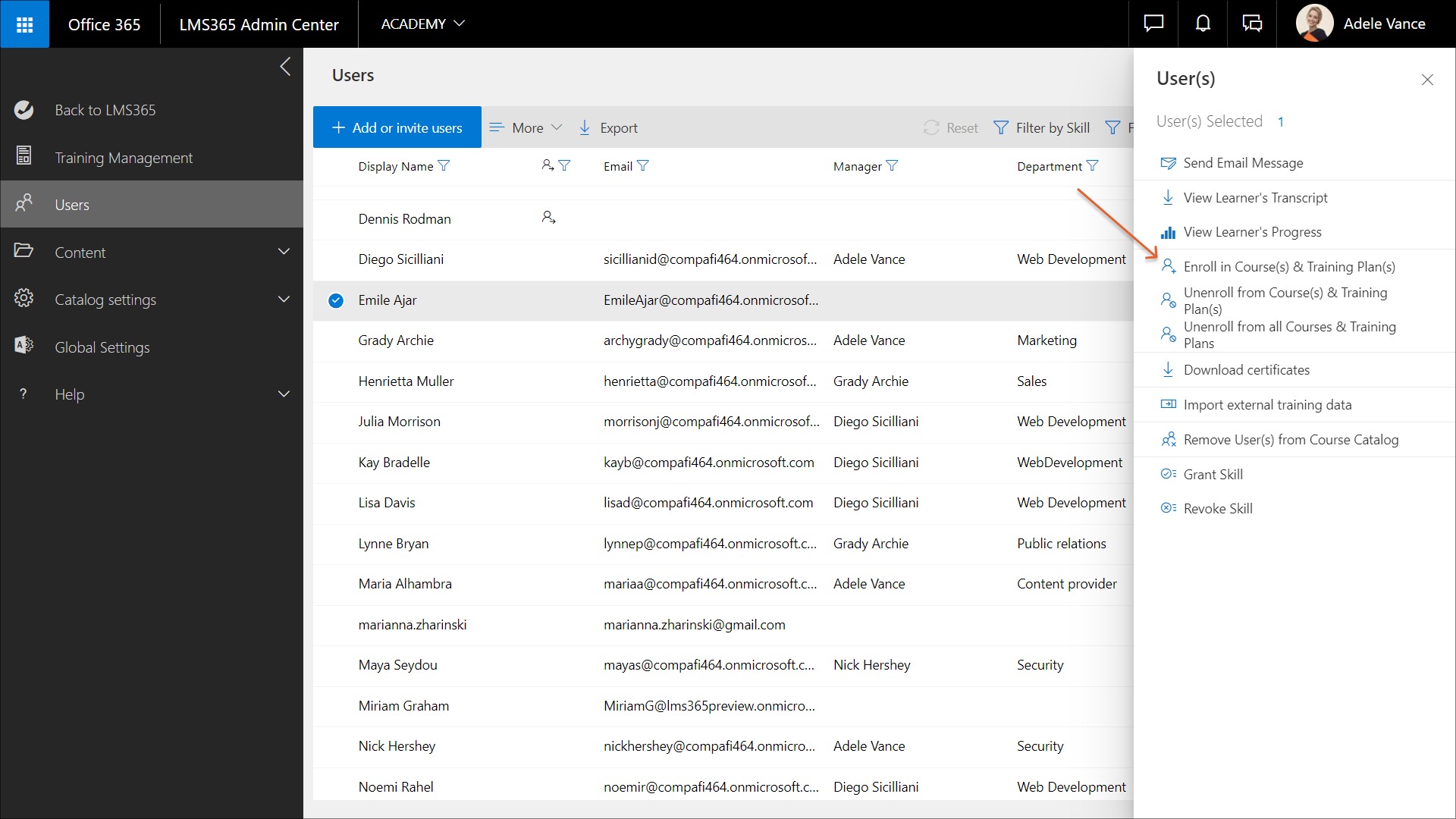 Als Katalogadministrator können Sie Benutzer über die Benutzereite im Learn365 Admin Center für Kurse registrieren.