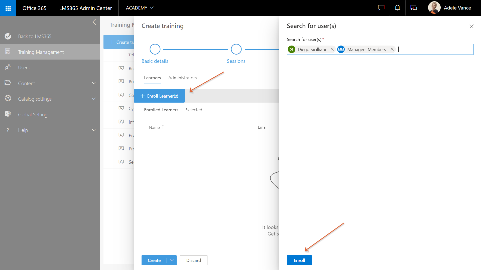Erforderliche Rollen: Der globale Microsoft 365-Administrator kann Benutzer in Microsoft Entra (Azure Active Directory) Gruppen verwalten. LMS- und Katalogadministratoren können benutzerdefinierte Gruppen erstellen. Kurs- und Katalogadministratoren können Microsoft Entra Gruppen für Kurse registrieren.