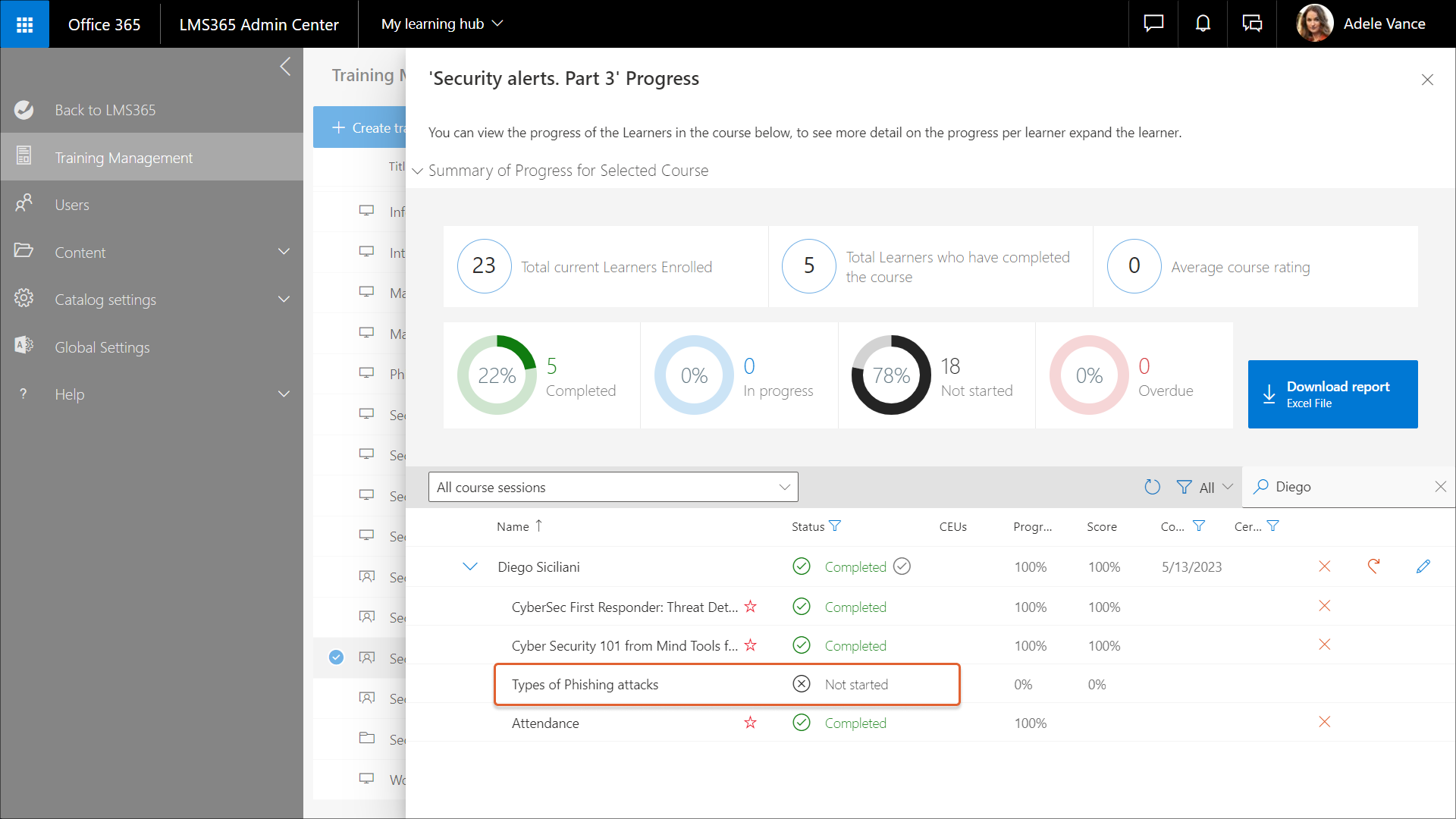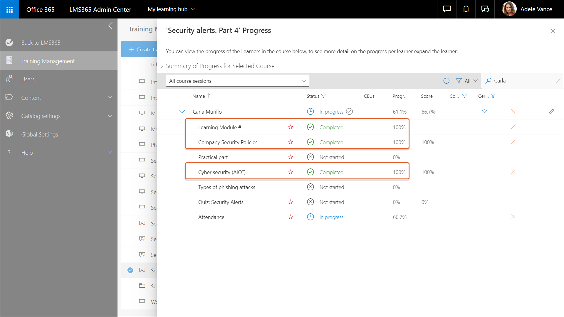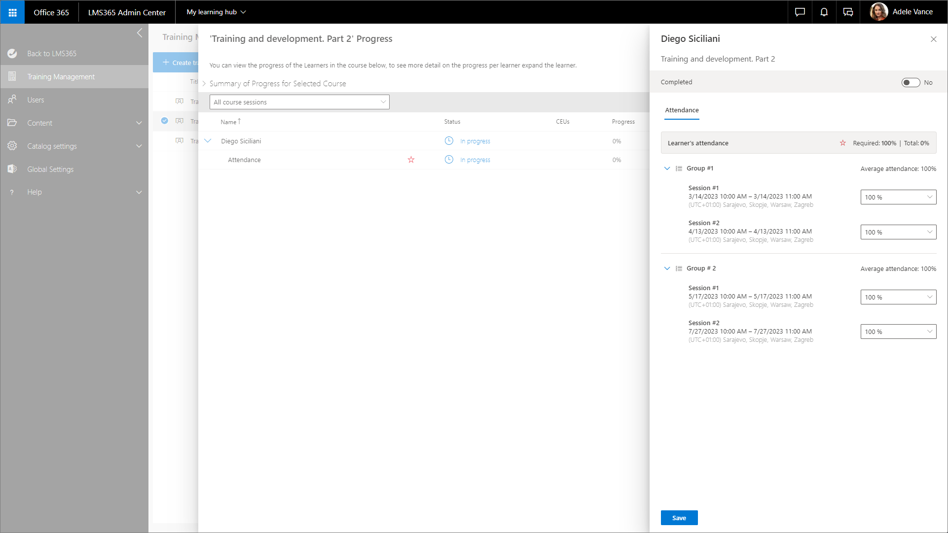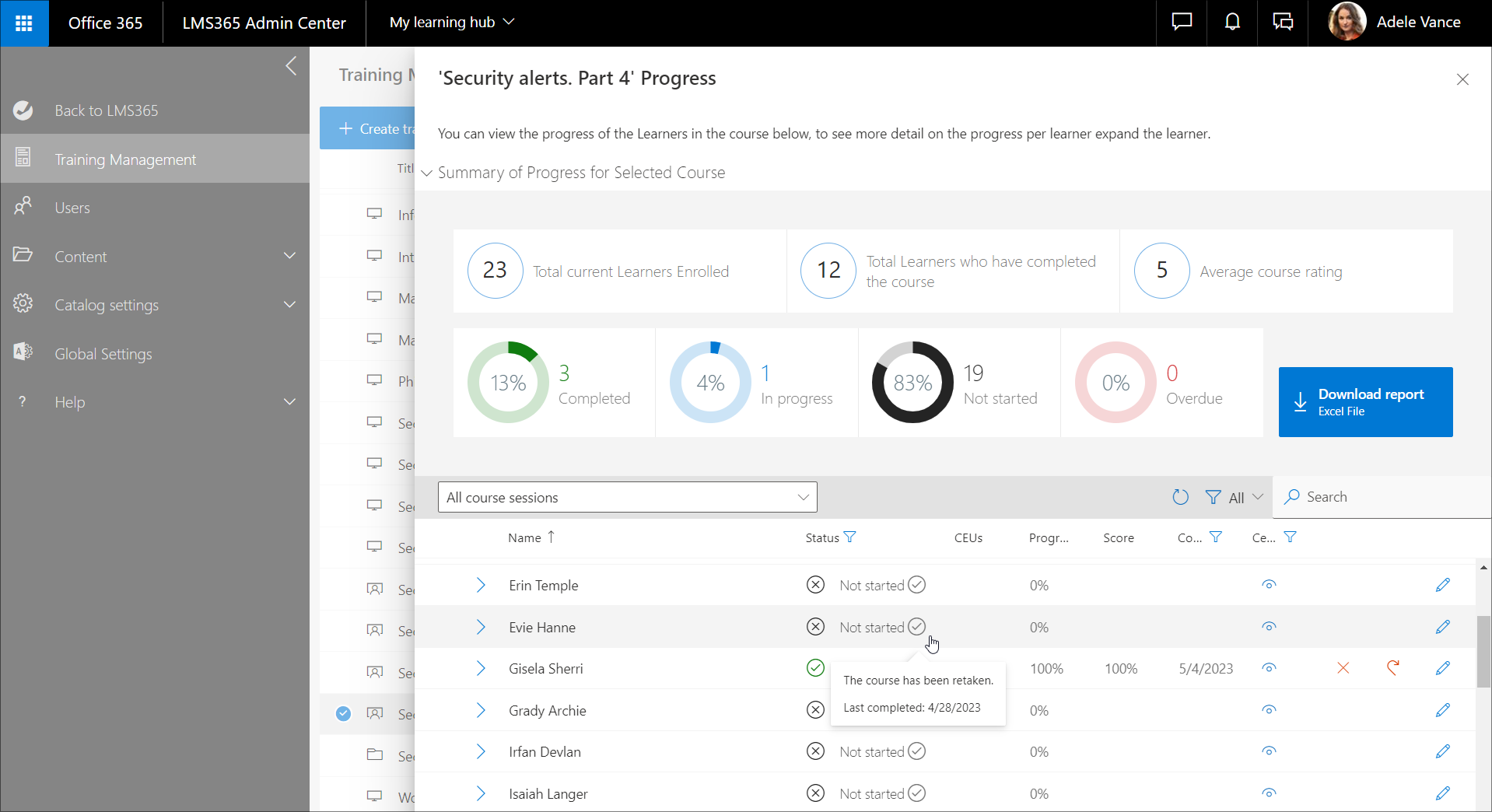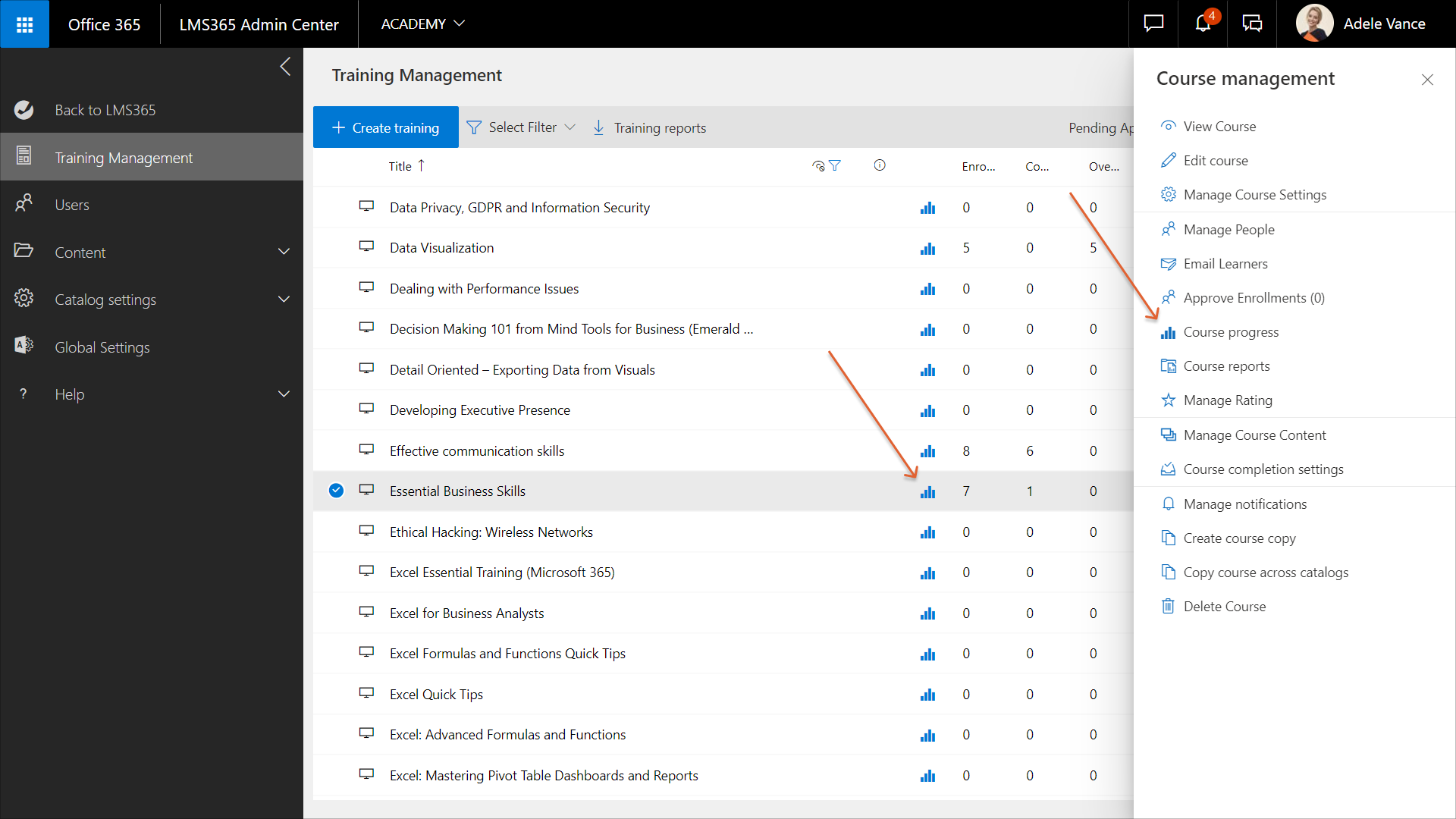 1. Gehen Sie zu Learn365 Admin Center > Schulungsverwaltung und wählen Sie den Kurs aus.