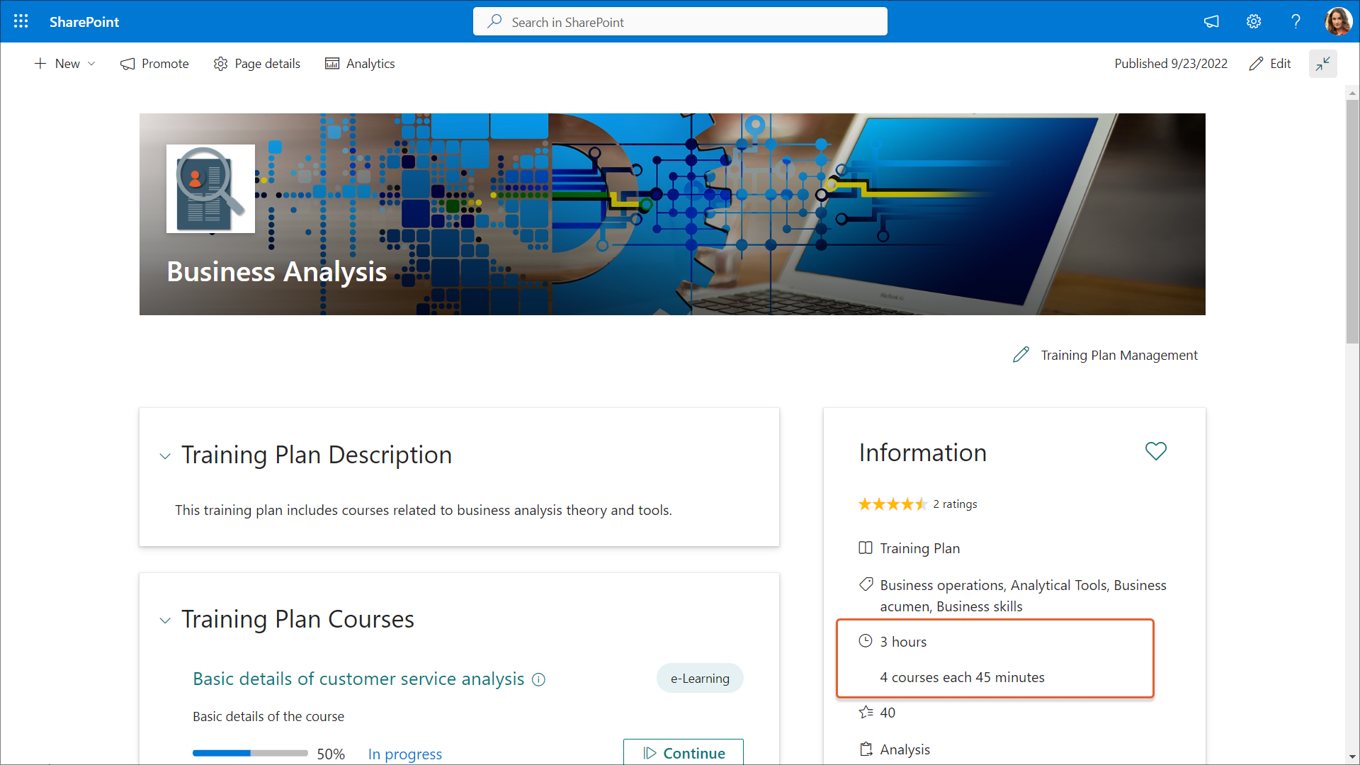 Geben Sie die ungefähre Dauer des Schulungsplans in einem freien Format an, zum Beispiel „ca. 2 Stunden“ oder „4 Kurse zu je 1 Stunde“. Die Dauer wird auf der Startseite des Schulungsplans und auf der Schulungskarte des Kurskatalogs angezeigt.