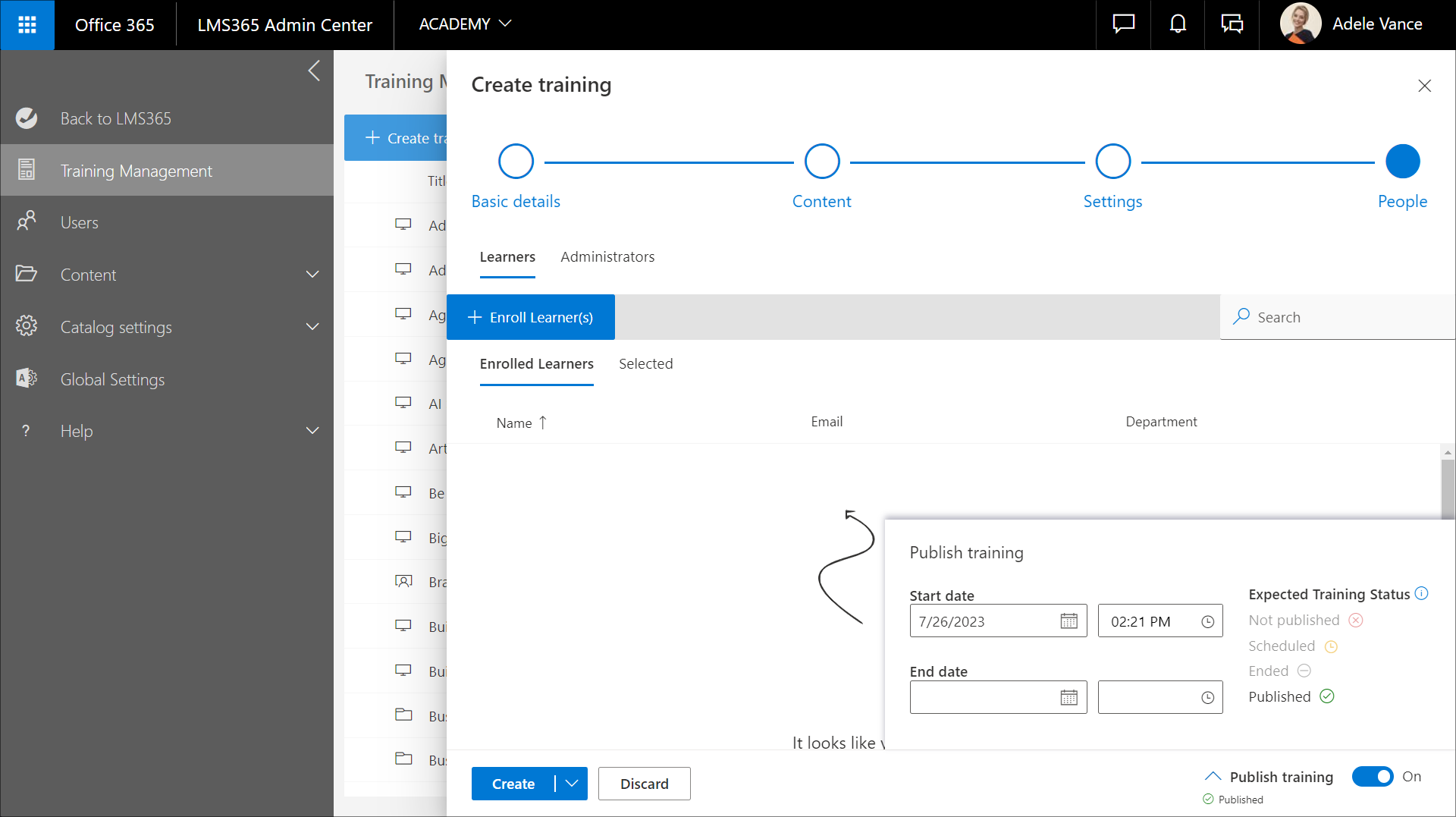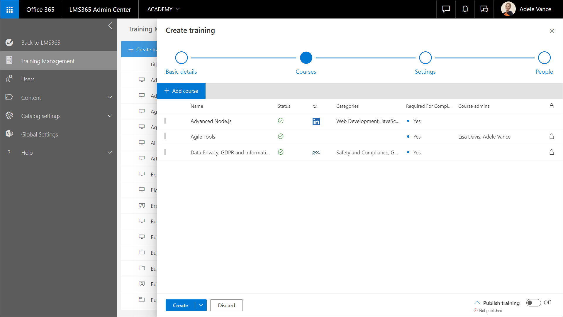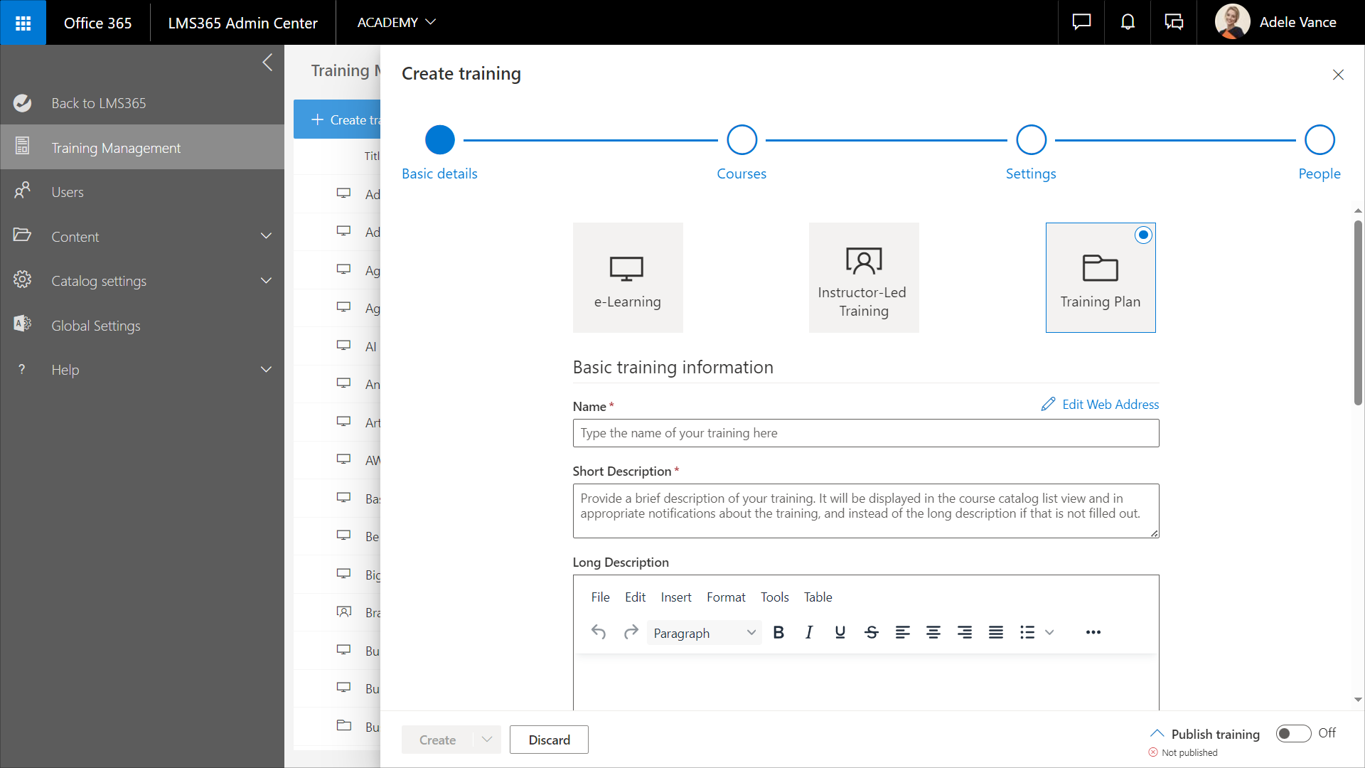 Zum Erstellen eines Schulungsplans wählen Sie Learn365 Admin Center > Schulungsverwaltung > Schulung erstellen aus.