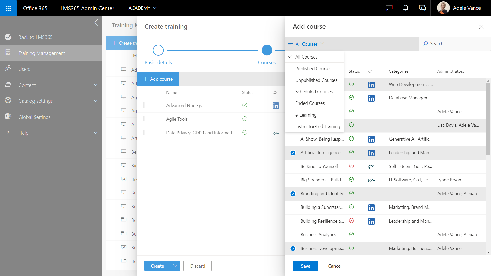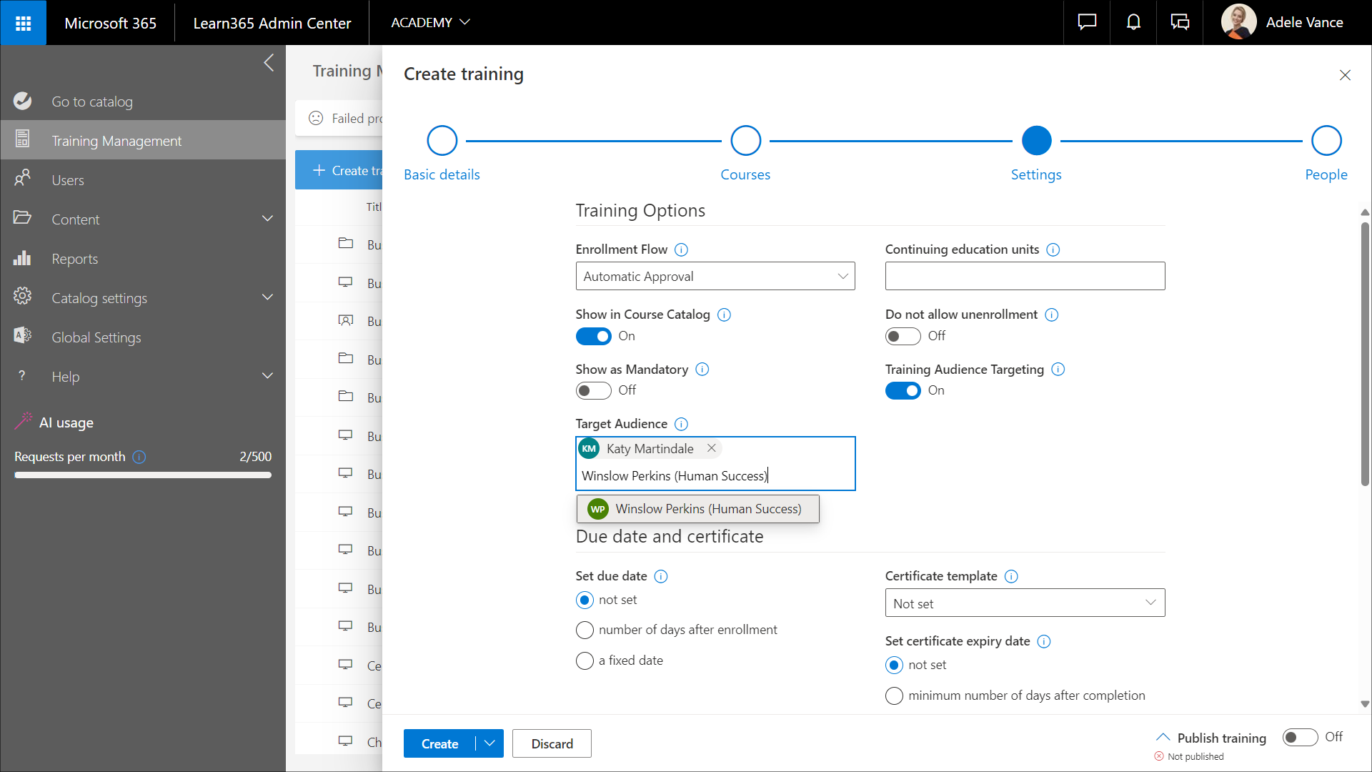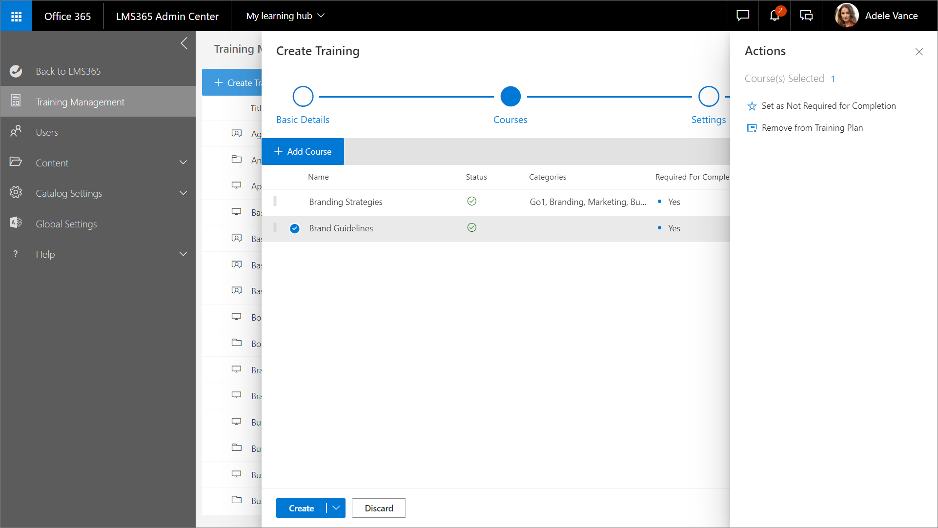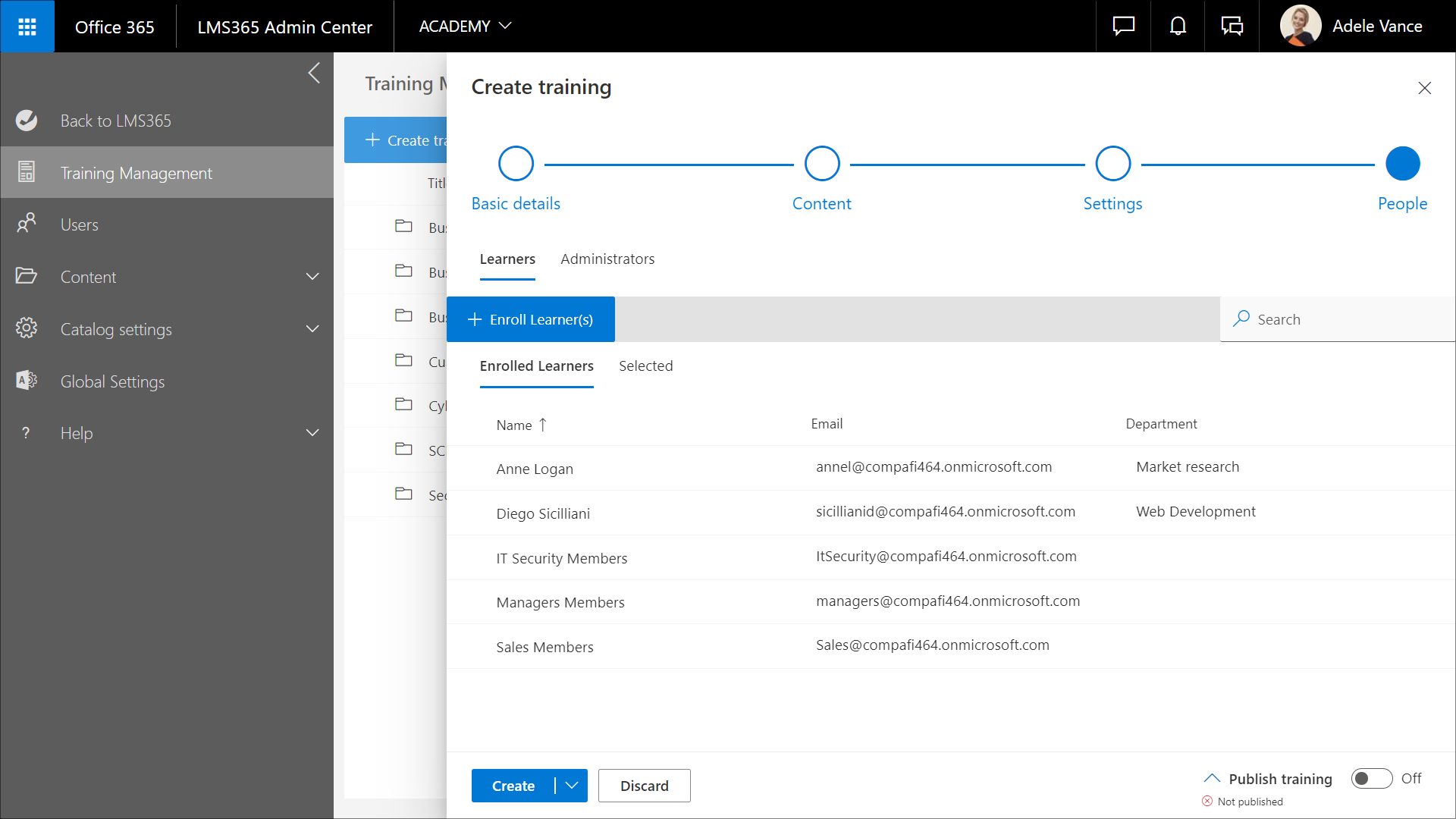 Zum Erstellen eines Schulungsplans wählen Sie Learn365 Admin Center > Schulungsverwaltung > Schulung erstellen aus.