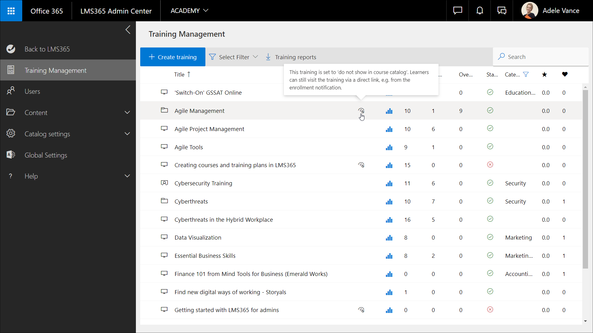- Katalogadministratoren behalten ihren uneingeschränkten Zugriff auf die Schulungsplanverwaltung. Daher werden ihnen auf der Seite Schulungsverwaltung auch weiterhin alle Kurse und Schulungspläne angezeigt.