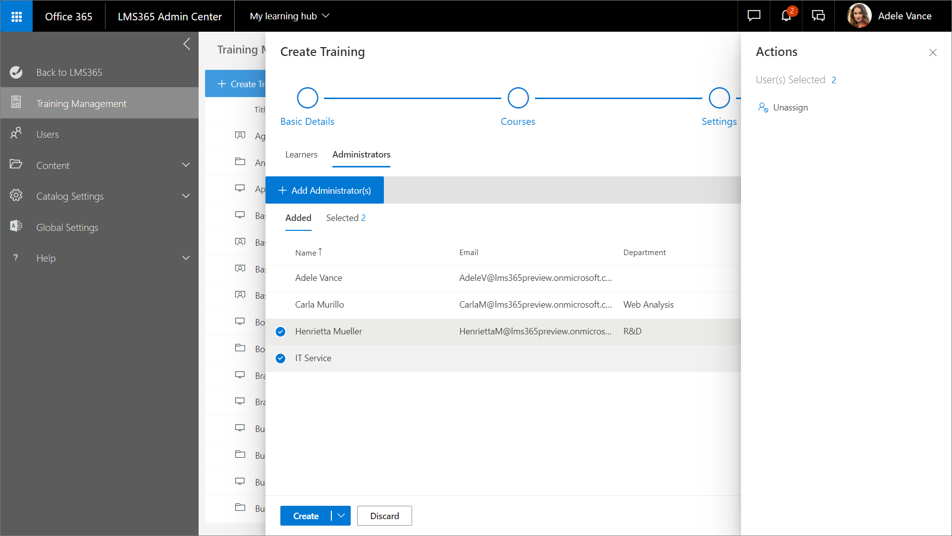 - Administratoren. Hier können Sie einem Schulungsplan Benutzer als Administratoren zuweisen oder diese Zuweisungen aufheben und außerdem steuern, welche Administratoren den Lernenden auf der Startseite des Schulungsplans angezeigt werden.