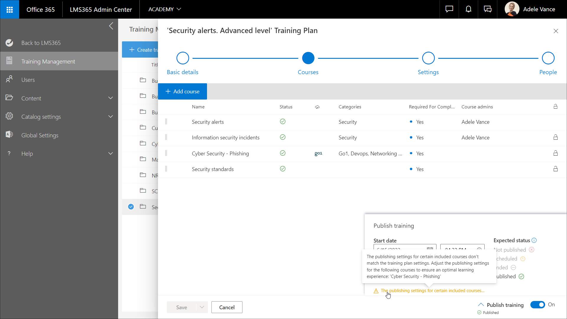 Sie können einen Schulungsplan durchaus auch dann veröffentlichen, wenn die Kursveröffentlichungsdaten nicht mit denen des Schulungsplans übereinstimmen oder innerhalb dieser liegen. Allerdings werden Sie in diesem Fall benachrichtigt, falls die Veröffentlichungseinstellungen bestimmter Kurse nicht zu jenen des Schulungsplans passen.