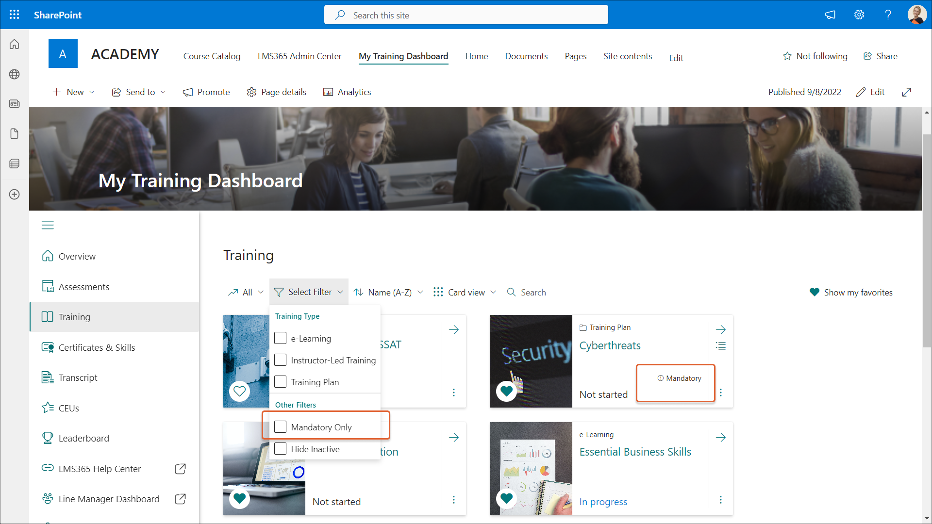 Die Miniaturansicht erscheint in der Vorschau des Schulungsplans, auf der Schulungskarte im Kurskatalog, in Mein Schulungs-Dashboard und oben links in der Bannergrafik auf der Startseite des Schulungsplans.