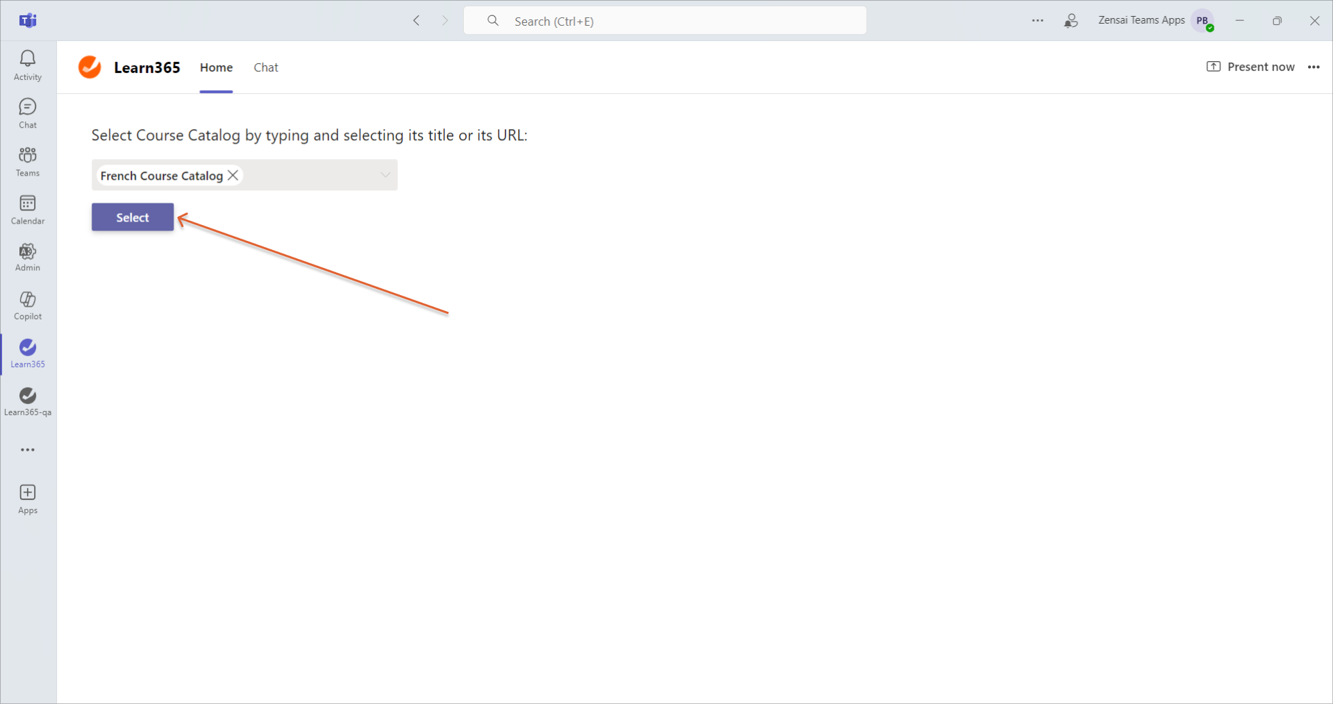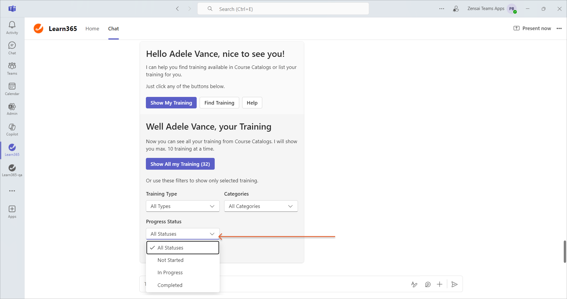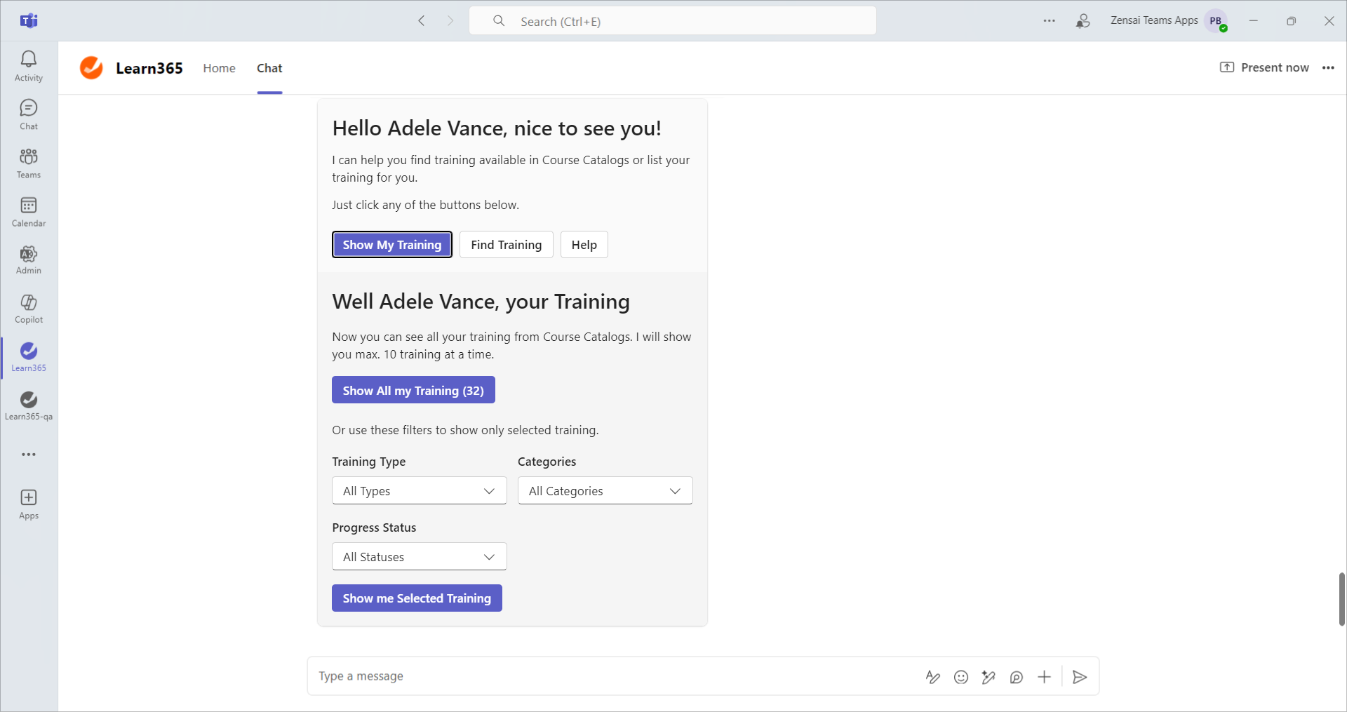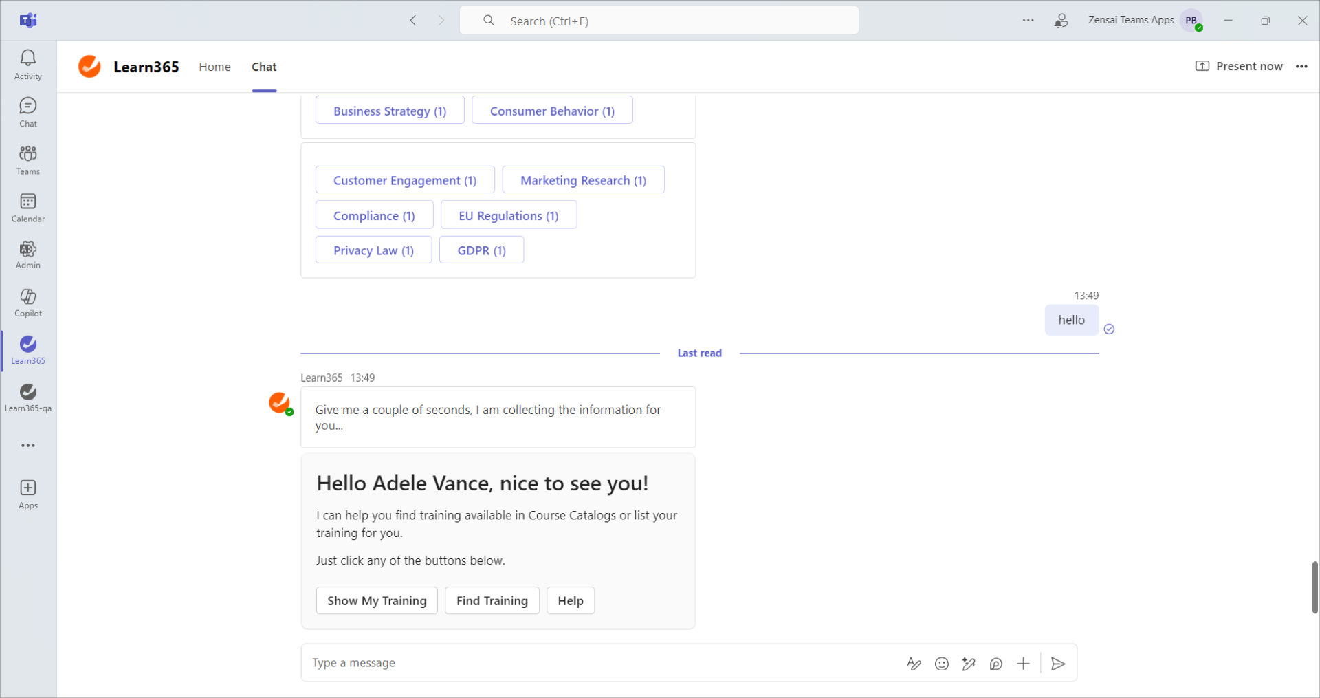 - Öffnen Sie die Learn365-App in Teams und navigieren Sie zur Registerkarte Chat.