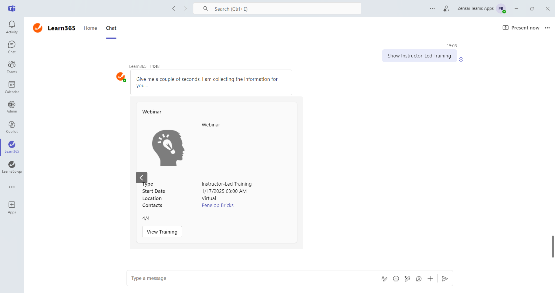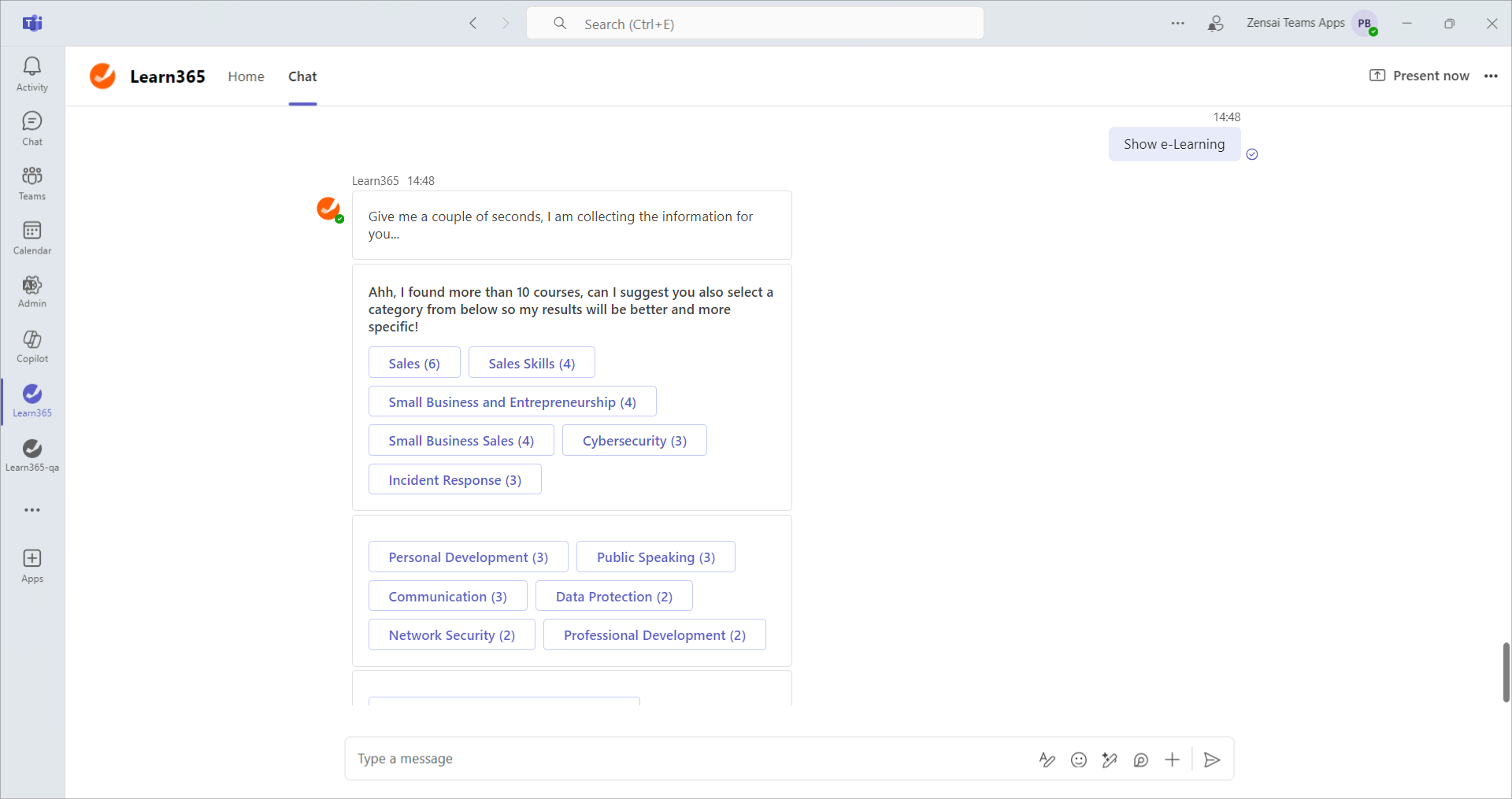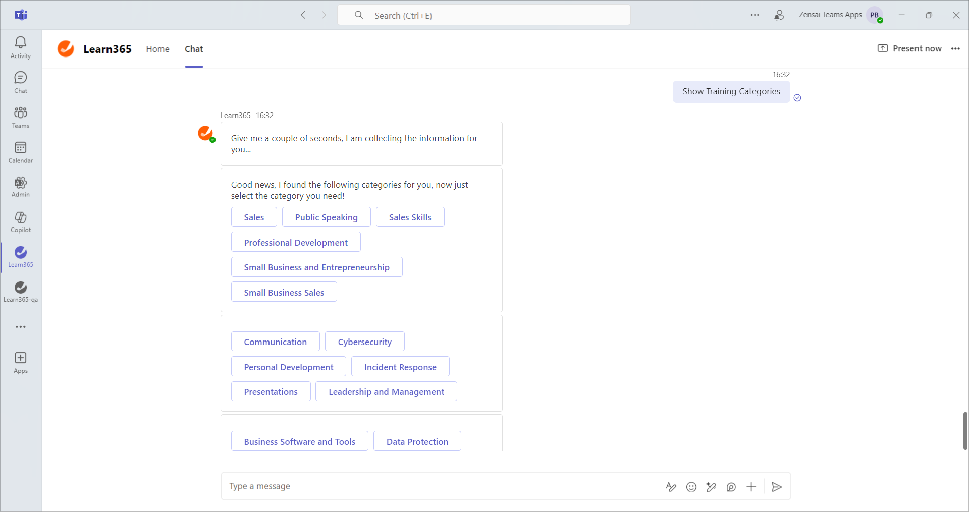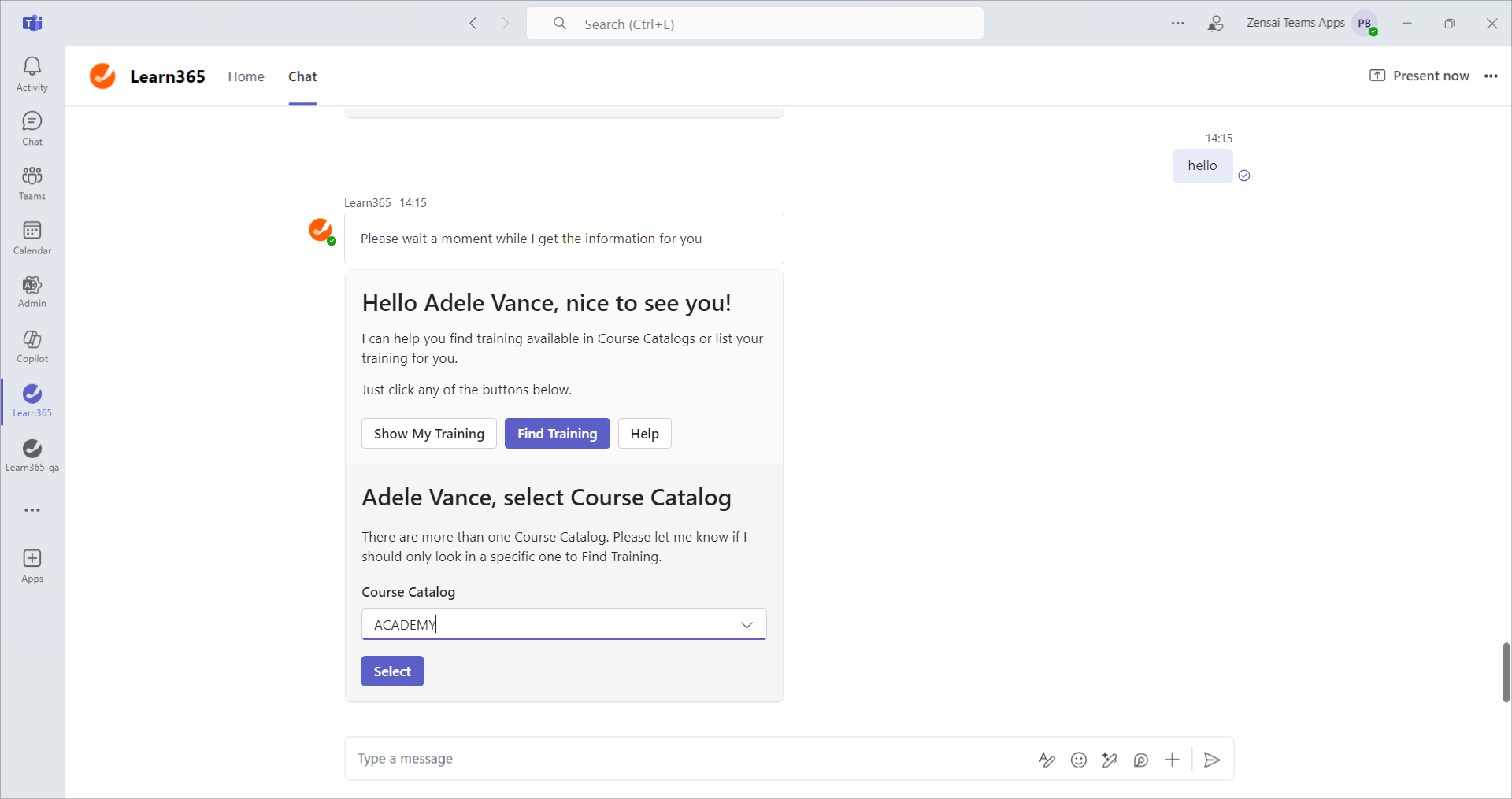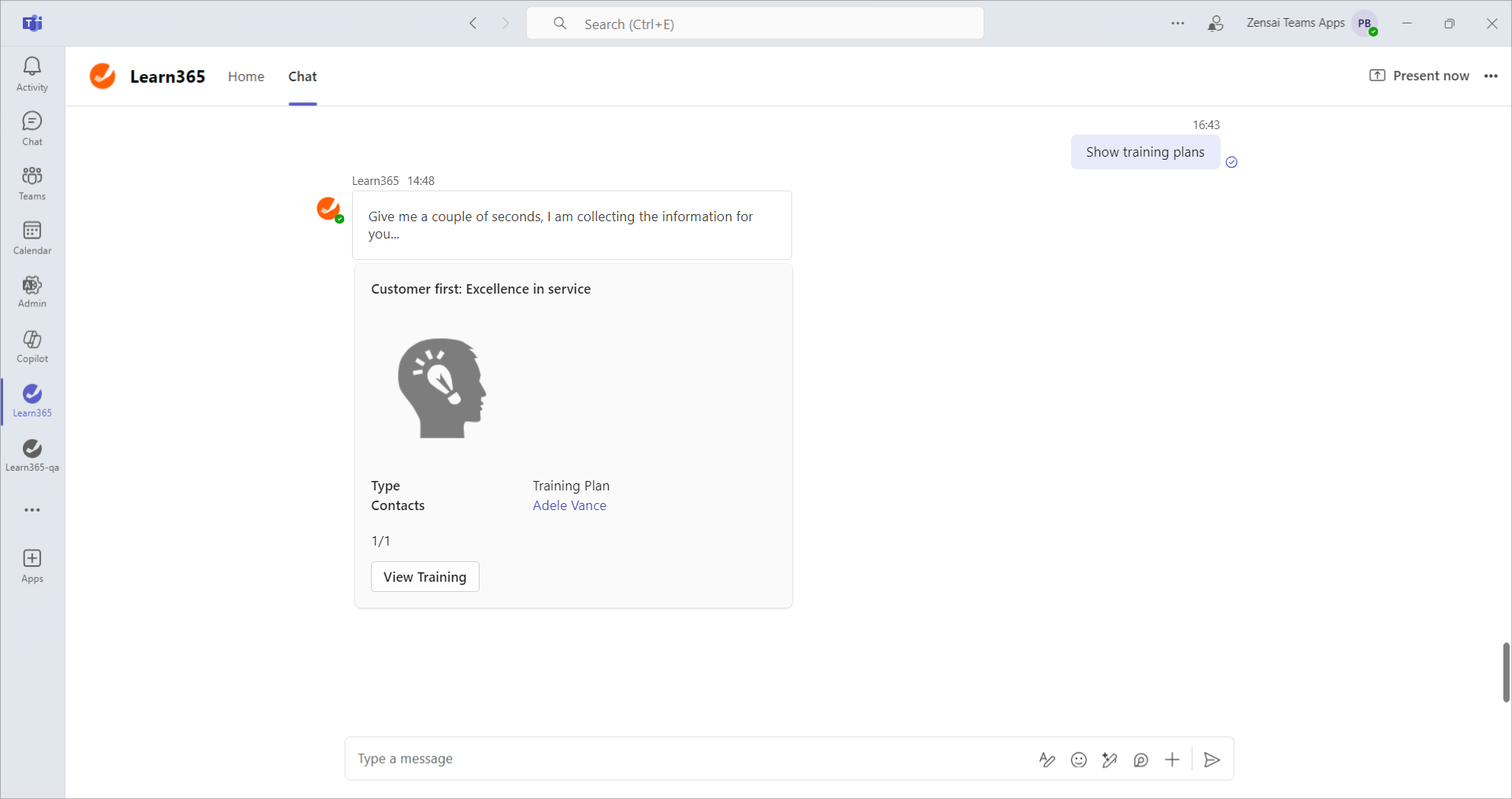 - Öffnen Sie die Learn365-App in Teams und navigieren Sie zur Registerkarte Chat.