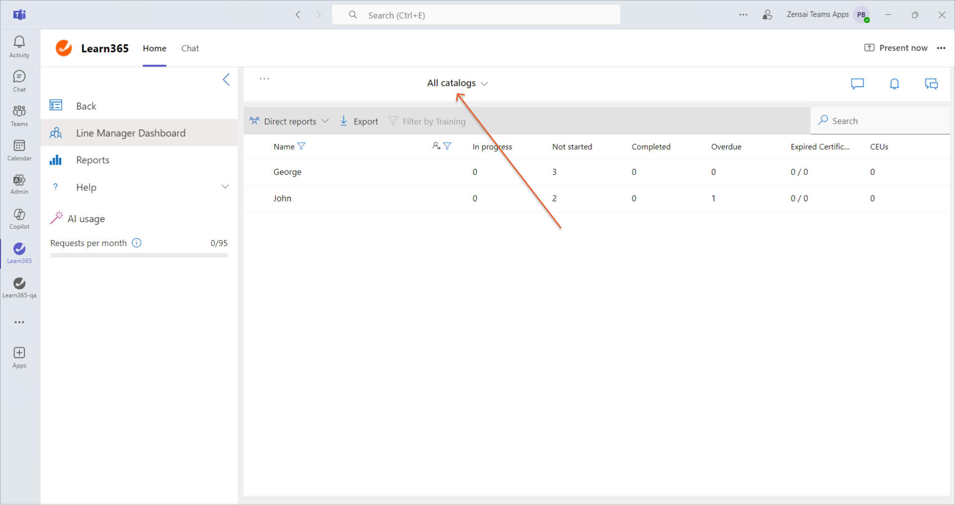 Wenn Linienmanager das Linienmanager-Dashboard in der Learn365-App in der Microsoft Teams-App zum ersten Mal öffnen, wird die Ansicht Alle Kataloge angezeigt. Wählt ein Linienmanager nun einen bestimmten Katalog in der Dropdown-Liste aus, dann wird dieser Katalog beim nächsten Öffnen des Linienmanager-Dashboards automatisch geöffnet.