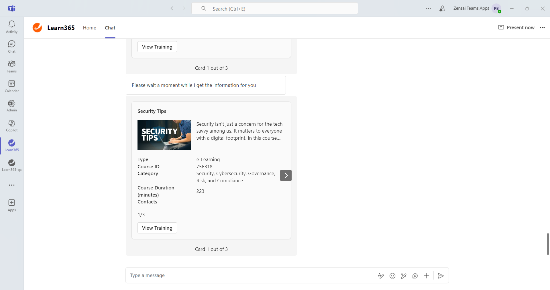 Benutzer können direkt in Teams Kurse und Schulungspläne finden, absolvieren und verfolgen und mithilfe des regulären Learn365-Chatbots die Kataloge erkunden, auf die sie Zugriff haben. Kurs- und Katalogadministratoren können auf alle gewünschten Verwaltungstools von Microsoft Teams zugreifen.