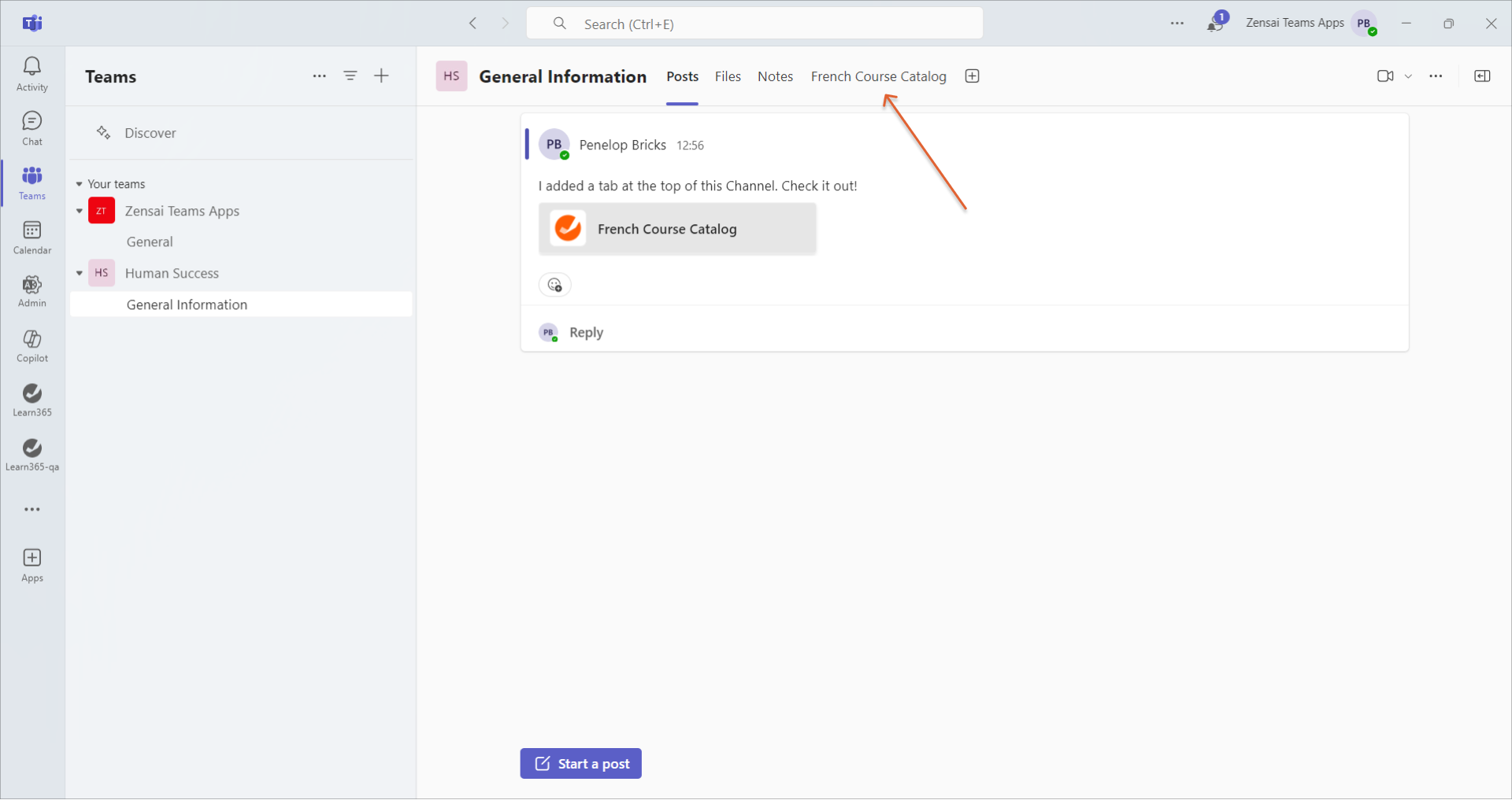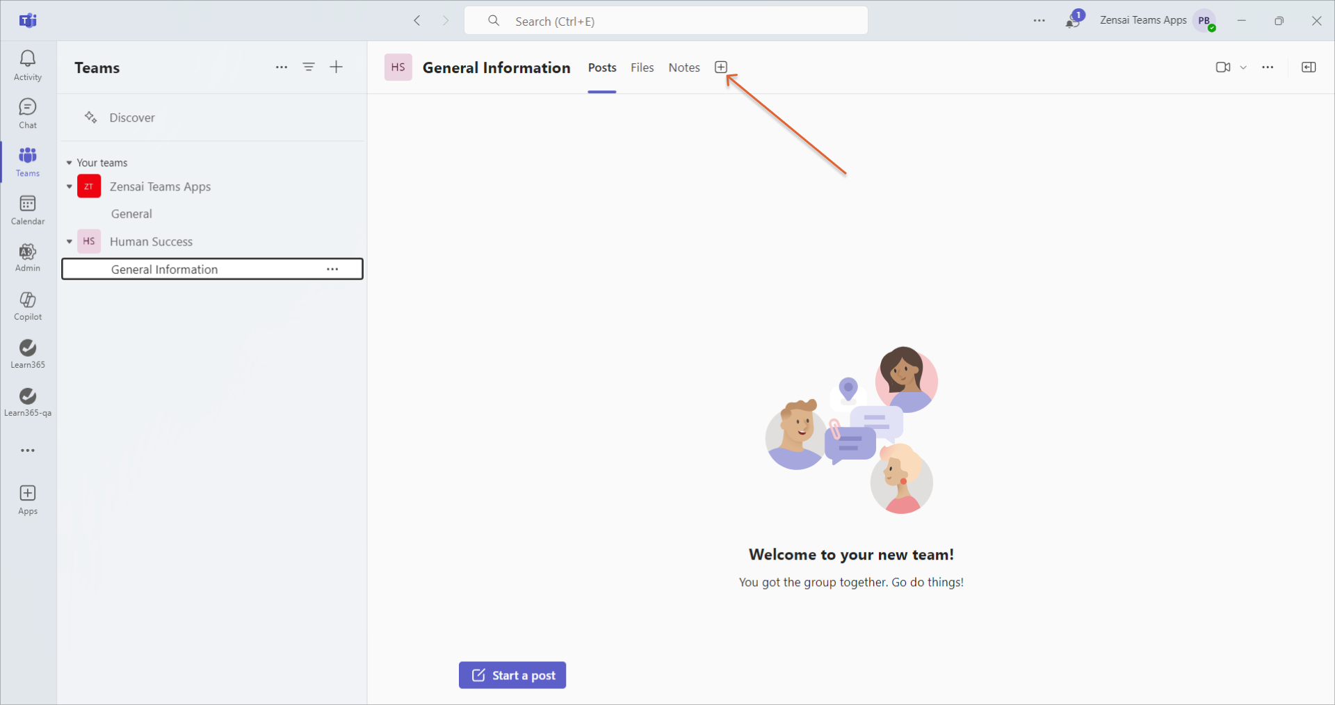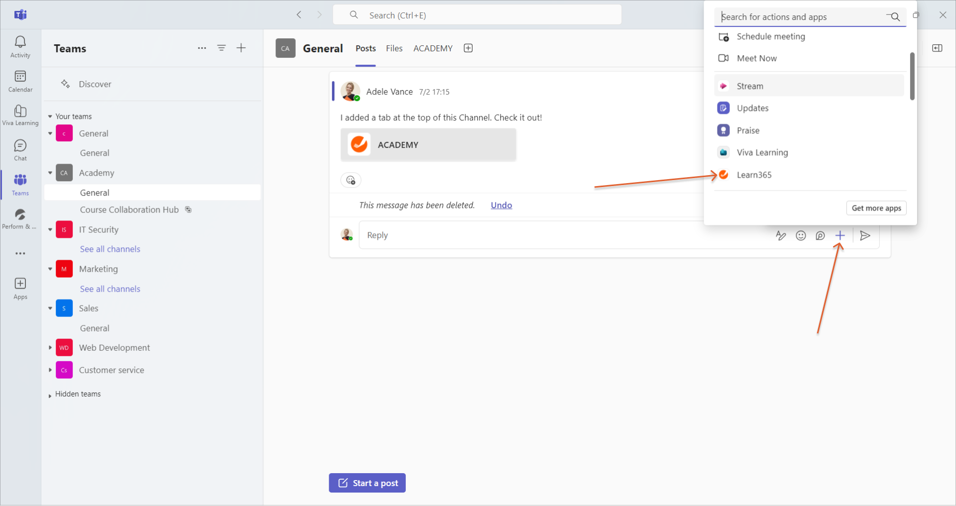 Learn365-Funktionalität als Registerkarte in einem Teams-Kanal hinzufügen