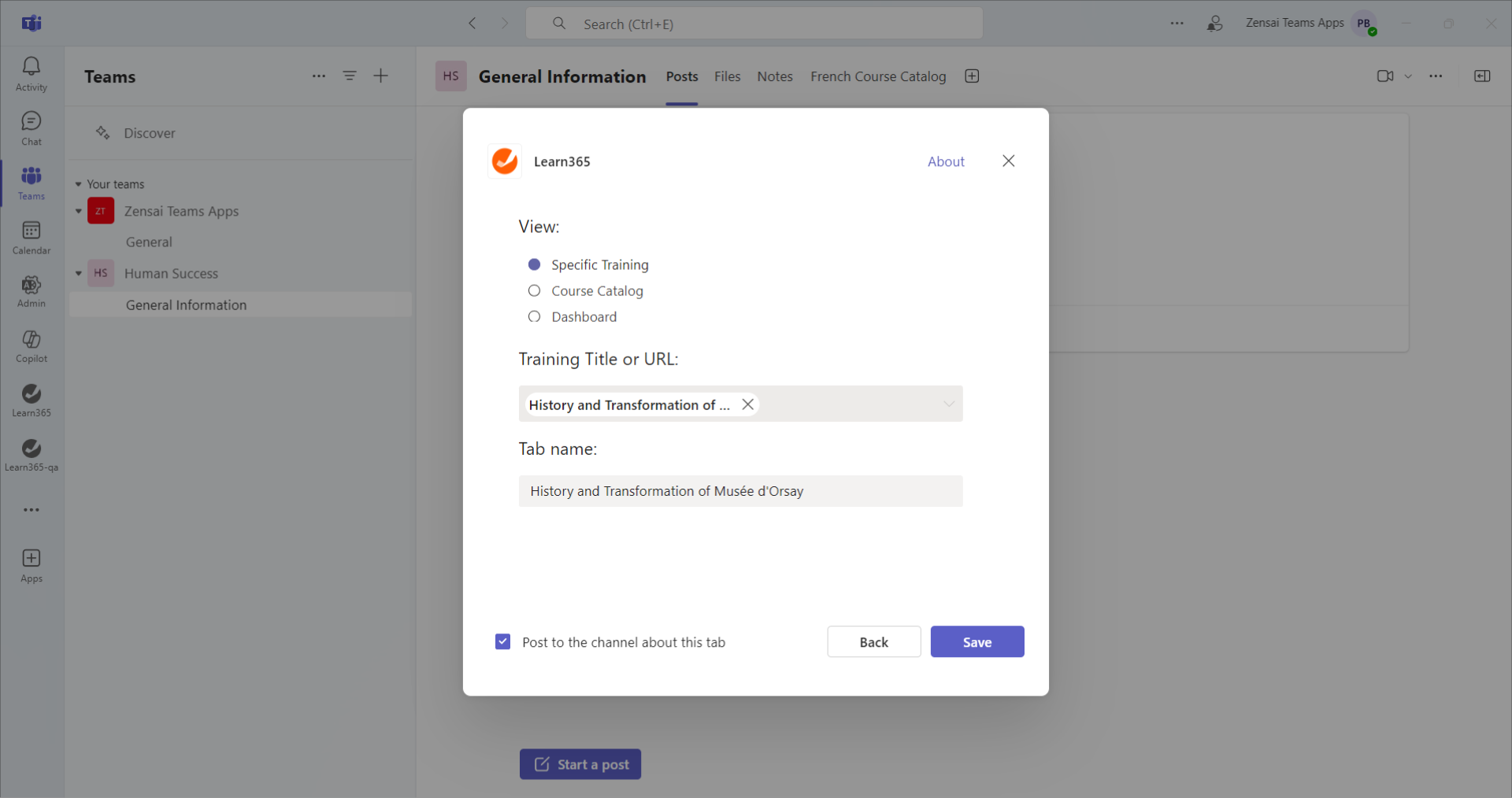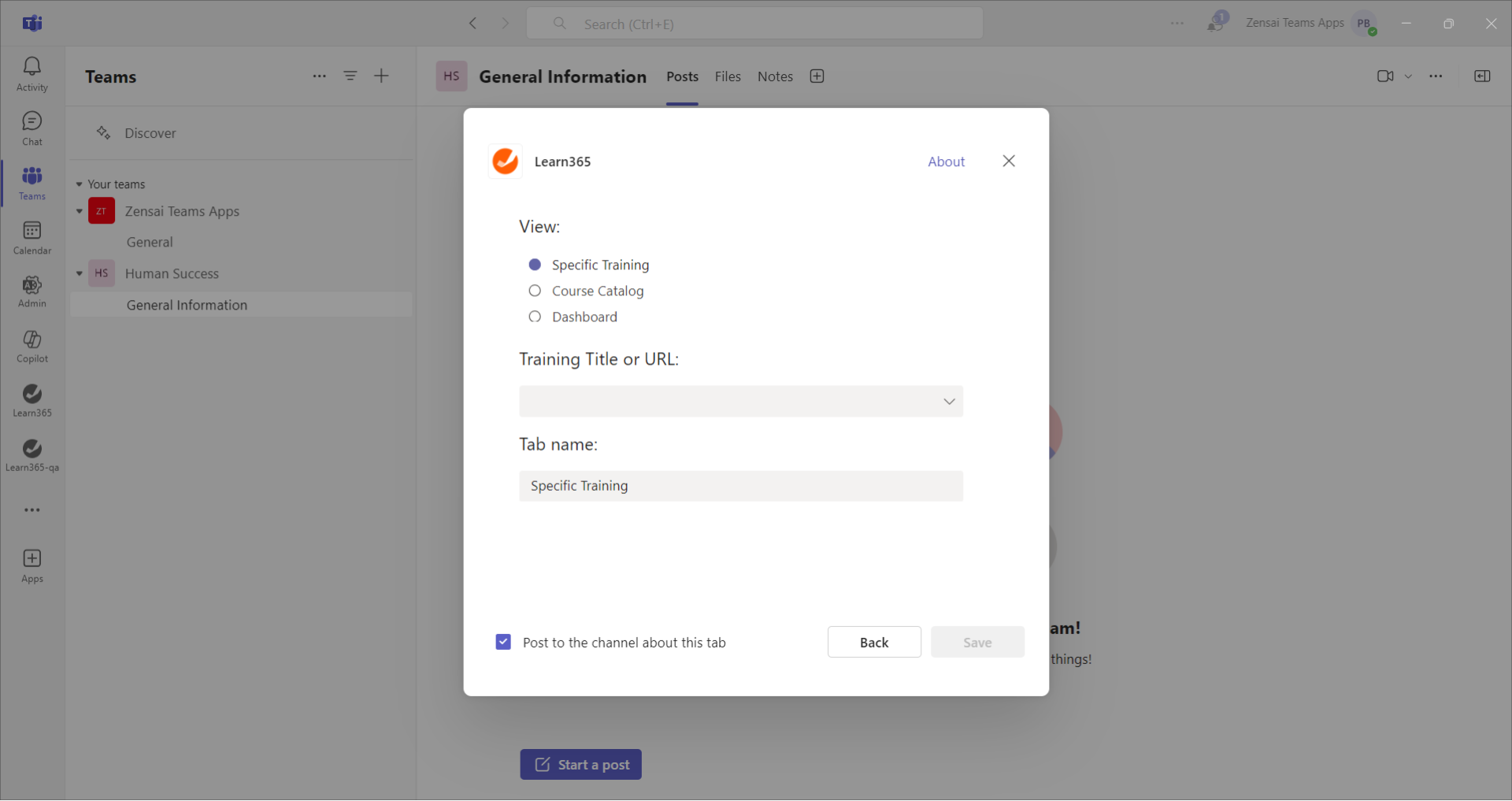 2. Nachdem Sie die Learn365-App ausgewählt haben, können Sie konfigurieren, was Sie oben in Ihrem Kanal anheften möchten: eine bestimmte Schulung, einen Katalog oder Mein Schulungs-Dashboard.