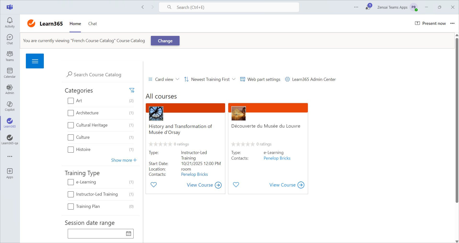 Der hier ausgewählte Katalog beeinflusst die Suche mit den folgenden Befehlen des regulären Learn365-Chatbots: Show e-Learning (E-Learning anzeigen),Show Instructor-Led Training (Veranstaltungsbasierte Schulungen anzeigen), Show Training Plans (Schulungspläne anzeigen) und Show Training Categories (Schulungskategorien anzeigen). Diese Befehle werden unabhängig vom im Bereich Katalog ausgewählten Katalog nur für den ausgewählten Katalog ausgeführt.