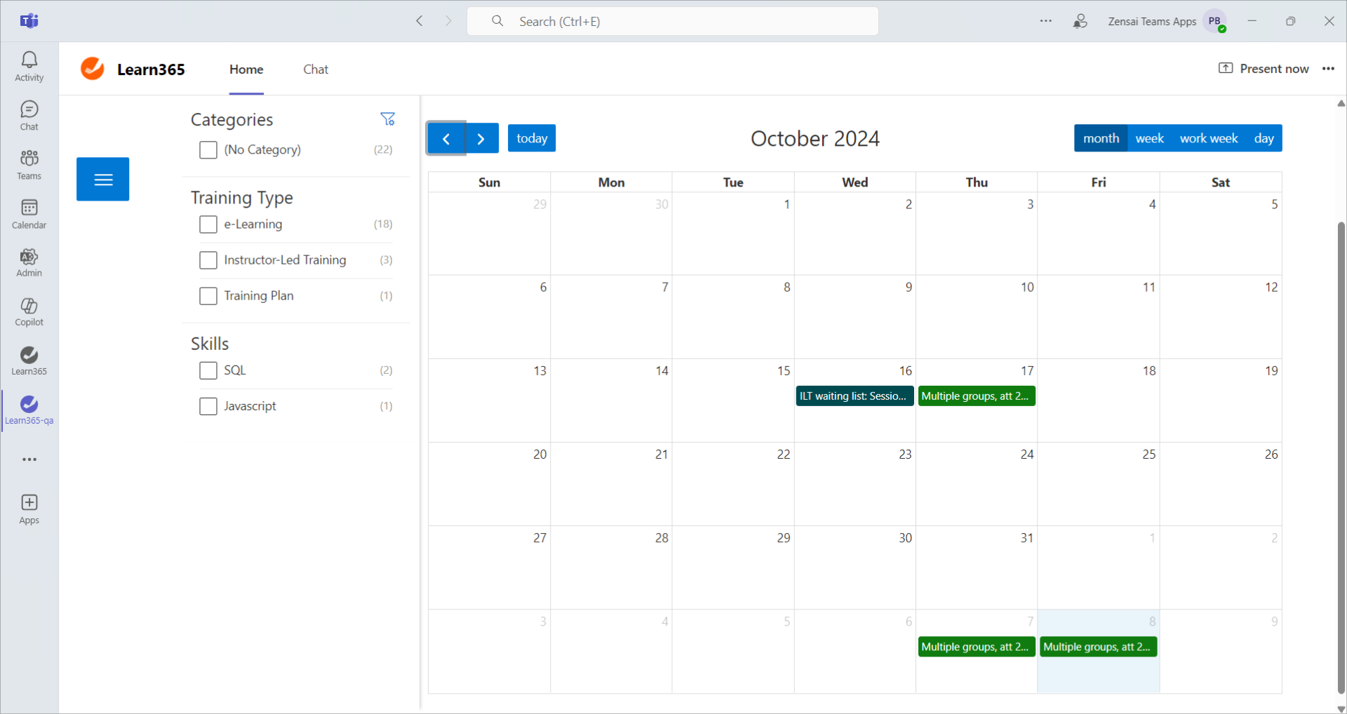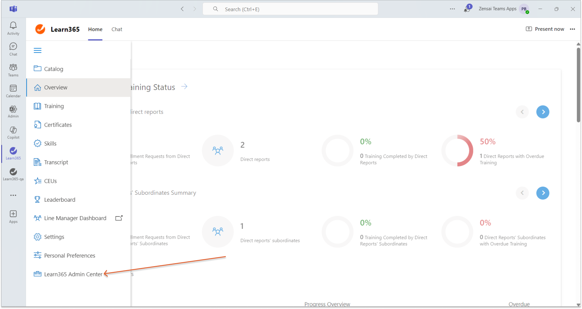 Nachdem die Learn365-App zu Microsoft Teams hinzugefügt wurde, macht sie die gesamte Lernoberfläche in Microsoft Teams zugänglich.